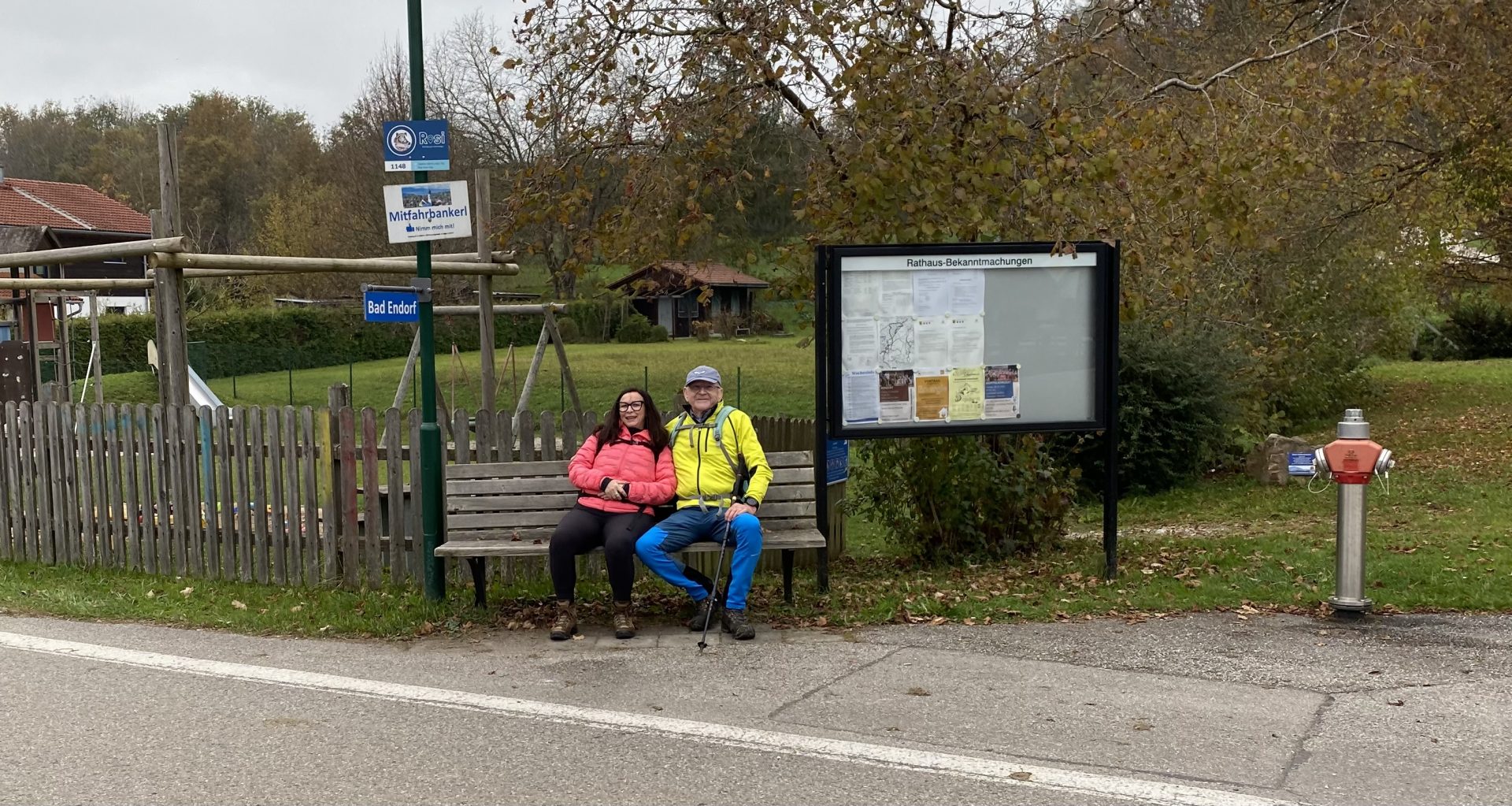 Da es recht frisch war, machten wir nur eine kurze Pause und weiter ging es entlang am Hartsee, Einbessee, Kautsee und Schloßsee Richtung Hemhof. Zwei Wanderer überlegten kurz, ob sie das Angebot Mitfahrbankerl nutzen sollten, aber da kein Auto vorbeikam, wanderten sie doch mit uns weiter.