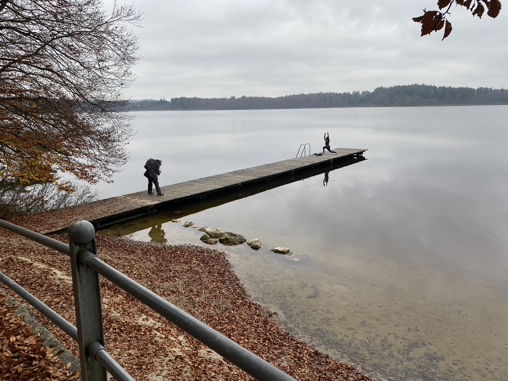 Unser mitreisende Profifotograf entdeckte noch ein bessere Model- als wir? Barfuß Yoga auf dem Steg, sie muss auch Profi gewesen sein, bei dem Anblick bekamen wir kalte Füße.