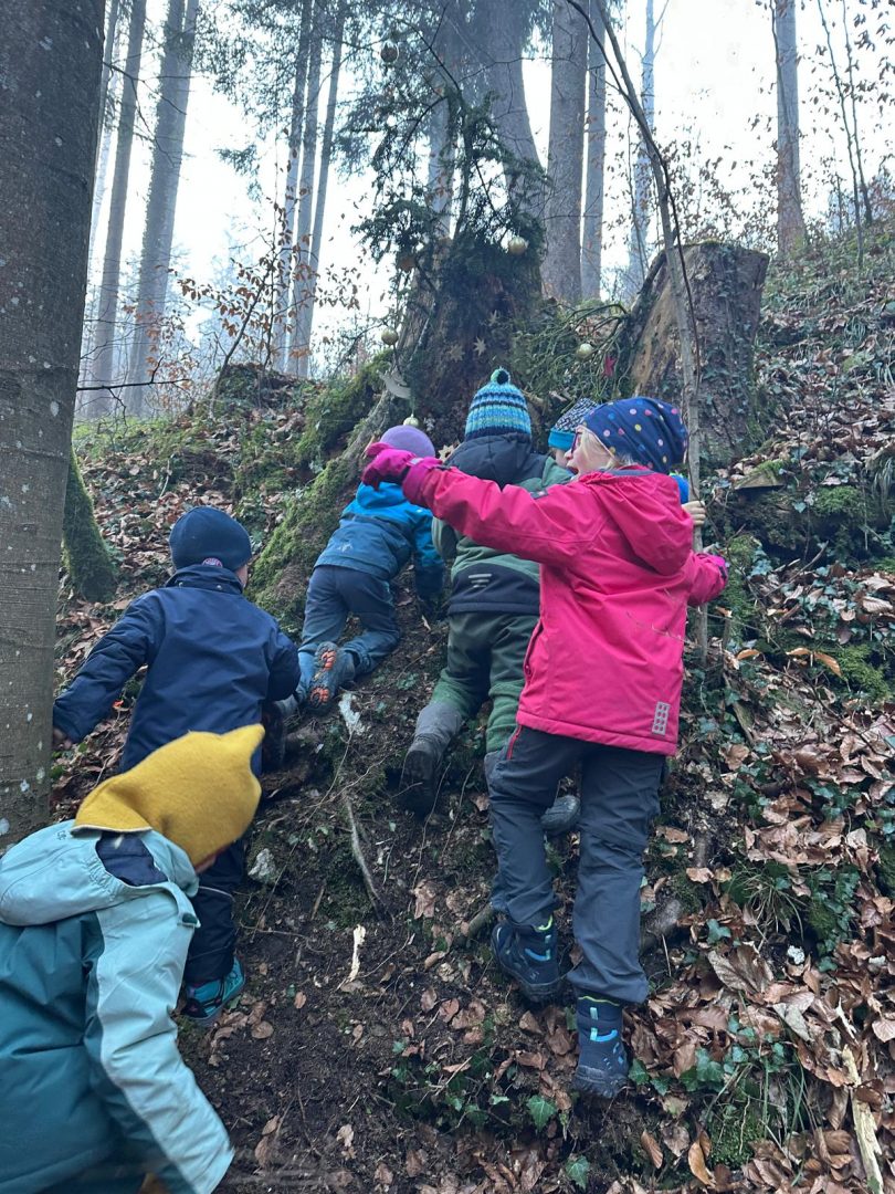 Wir starteten am Wanderparkplatz Gritschen im Nebel direkt mit dem Krippenweg. Neben dem Waldweg, sind immer wieder Krippen zu entdecken. Die Kinder entdecken alle Krippen, die teilweise mit Christbaumkugel geschmückt waren – eine schöne weihnachtliche Einstimmung!!