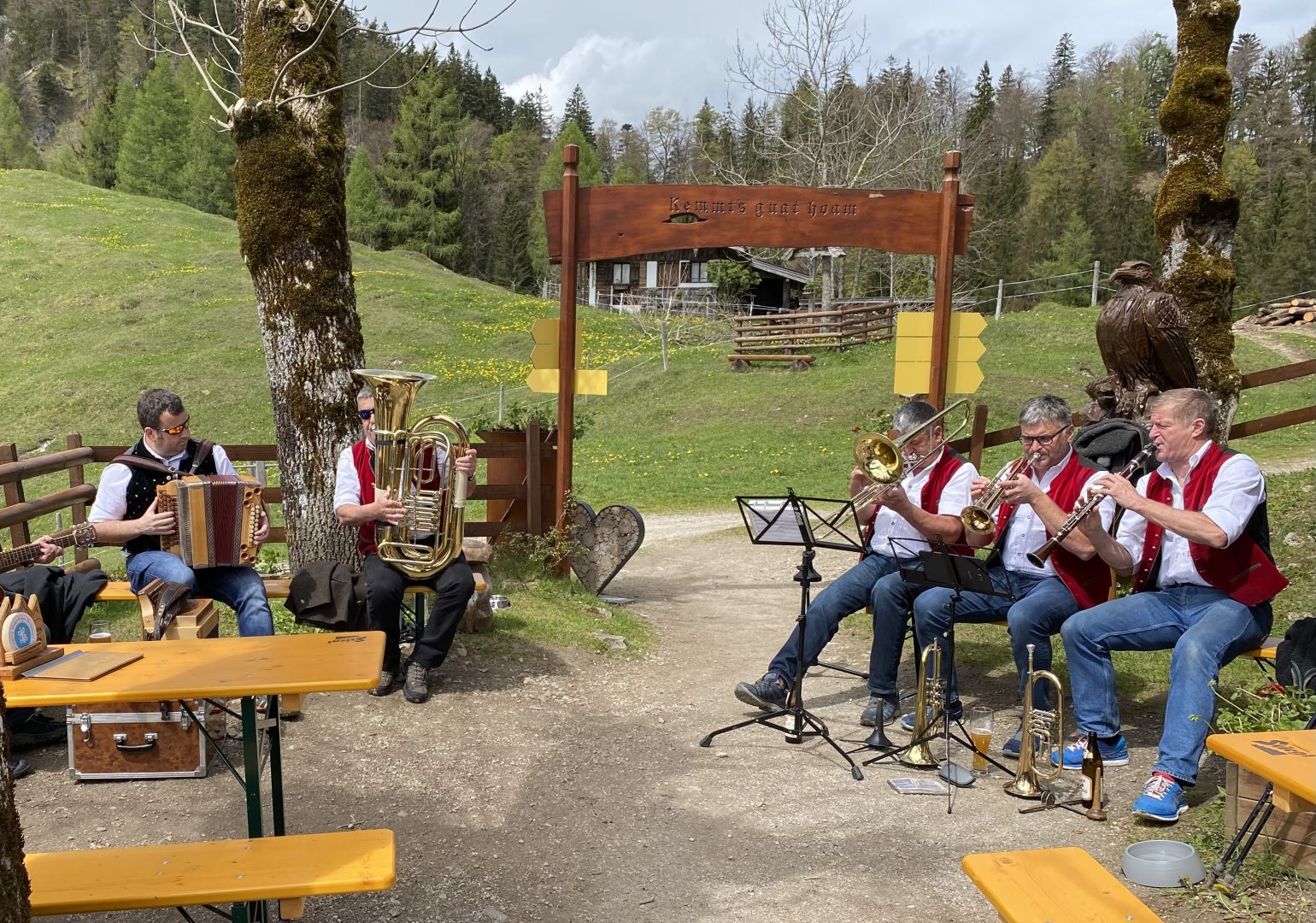 Und eine Pause jagt die andere, bergab geht es jetzt noch 30 Minuten, dann sind wir wieder an der Taubenseehütte, wo wir mit Musik empfangen wurden und zur Brotzeit einkehrten.