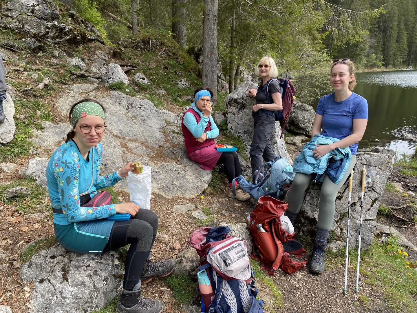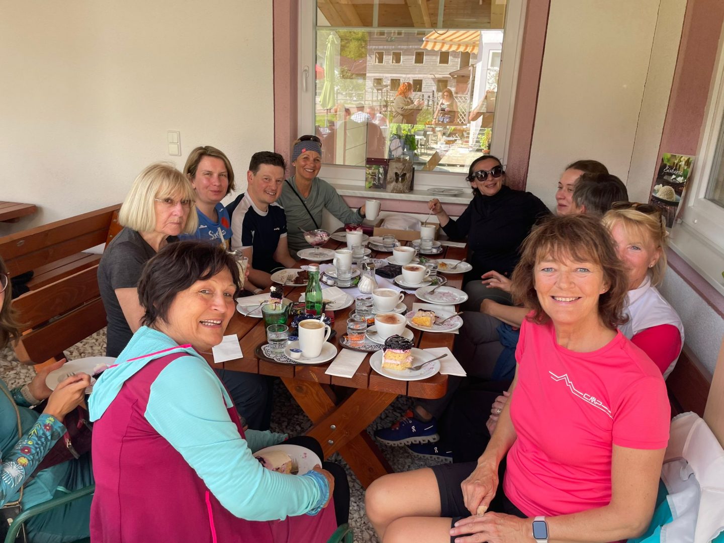 Gestärkt machten wir uns erst über den sehr steilen Wirtschaftsweg, dann auf dem Aufstiegsweg wieder auf den Rückweg. Bei einer kleine Erklärbär-Einheit machten wir uns noch Mal mit dem Umgang mit Wanderstöcken vertraut, mit den Nutzen und den Risiken. Wir kamen alle heil und gesund am Auto wieder an, aber wenn wir schon in der gegens sind, darf die Einkehr im Cafe Bär in Sebi nicht fehlen. Auch einige daheim (Männer, Kinder 😊) gebliebenen profitierten davon, da ein paar Tortenstücke auch den Weg nach Erding geschafft haben.