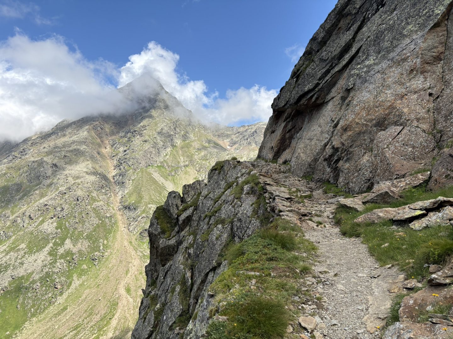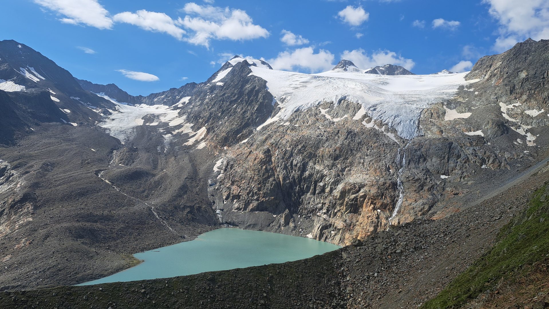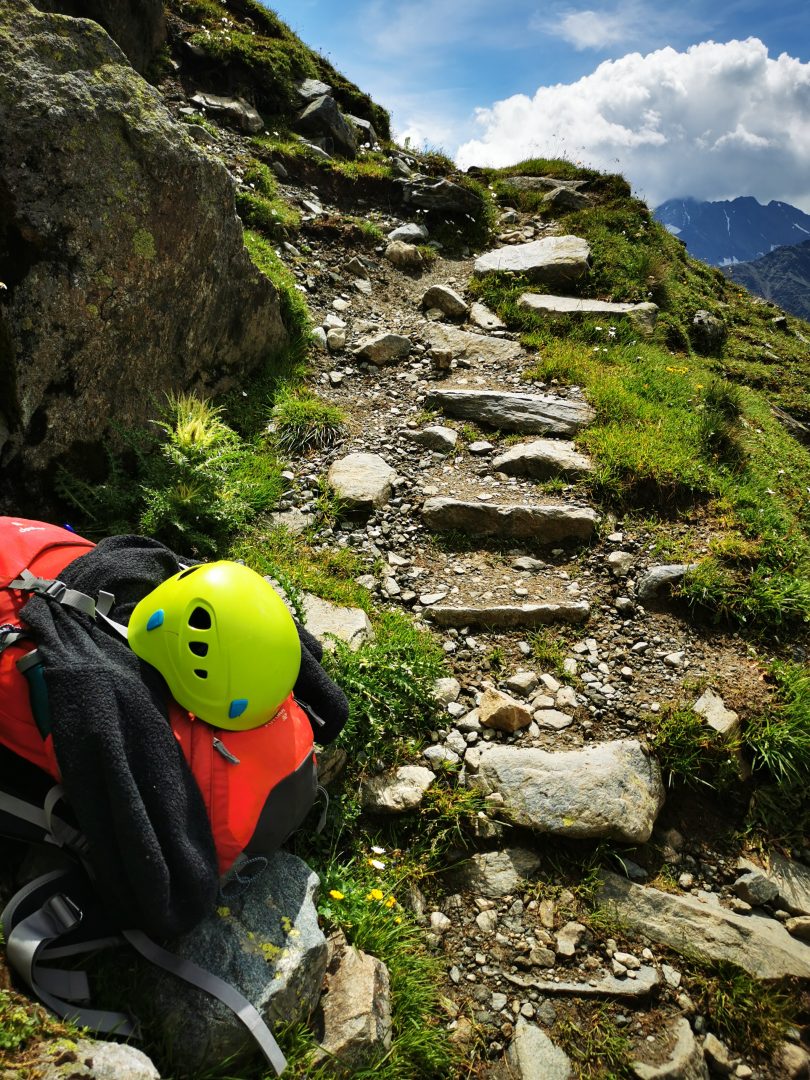 Heute hatte wir Zeit genug, um die kurze aber dennoch herausfordernde Tour zu genießen. Zeitig ging es dennoch los. Der Pfad stieg eher seicht an. Mit Blick auf die Blaue Lacke liefen wir am Gletscherschliff oberhalb des Oberlaufs des Sulzbachs der als bekannter Grawafall im Stubaital in die Ruetz und über die Sill im Inn mündet. Nach einer Weile erreichen wir die Pfaffenlehner Wand unterhalb des wegen Steinschlag am 2903 HM hohen Großen Trögler gesperrten Weges. Über ein paar Serpentinen erreichen wir ein mit Seil und Tritten gesichertes Steilgelände. Anspruchsvoll aber wir haben unseren Spaß und genießen die Aussicht. Den Sulzenauferner-See unterhalb des mit 3507 HM höchsten Berg der Stubaier Alpen, dem Zuckerhütl und seinem Nachbarn, den Wilden Pfaff 3458 HM, gibt es durch die dramatische Gletscherschmelze erst seit ein paar Jahren. Trotzdem ist es noch immer einer der größten Gletscher der Stubaier Alpen und macht mächtig Eindruck.