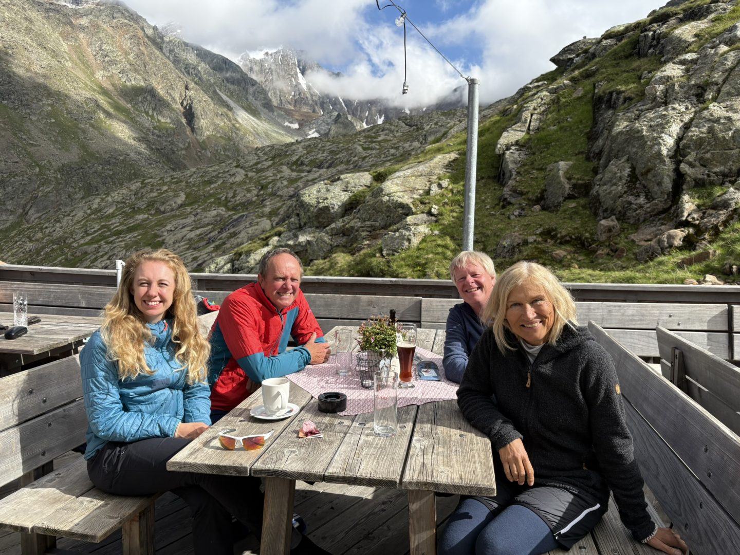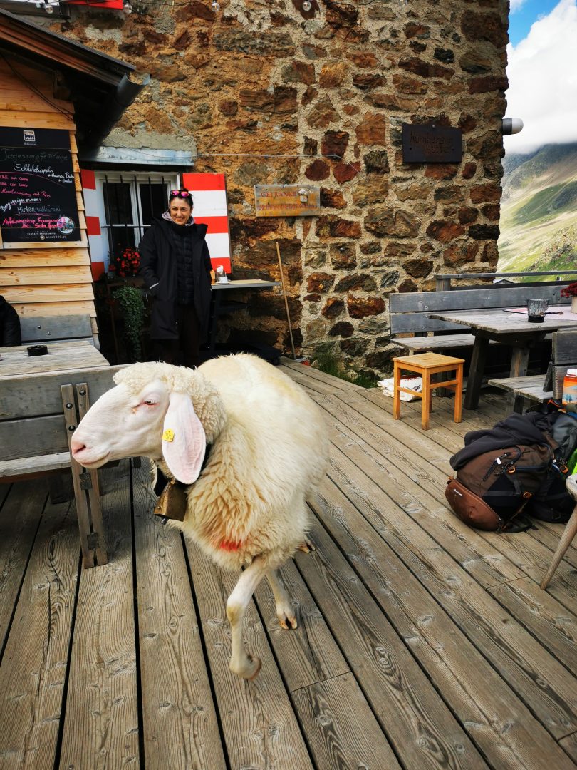 Wir hatten uns entschlossen unsere Rundtour am Waldcafé in Falbeson auf 1214 HM zu beginnen. Die frühe Anfahrt unter der Woche war gut gewählt und so genossen wir eine ruhige Fahrt durchs Inntal, über die Europabrücke, einen Teil der Brennerautobahn. Trotz des anfänglich durchwachsenen, eher regnerischen Starts wurden wir mit leicht bewölktem Himmel bei angenehmen Temperaturen empfangen. Nach einem gemütlichen Kaffee begannen wir unseren zunächst sanften Aufstieg durch den lichten Wald, vorbei an wilden Bergbächen und Almen. Nun wurde es zunehmend ein wenig steiler. So gewannen wir über aussichtsreiche Steige rasch an Höhe. Bald kamen wir in hochalpines Terrain und erreichten bei schönstem Wetter auf 2248 HM die Nürnberger Hütte. Hier genossen wir die Aussicht auf der sonnendurchfluteten Terrasse und staunten nicht schlecht, als sich hier ein Schaf verirrte.