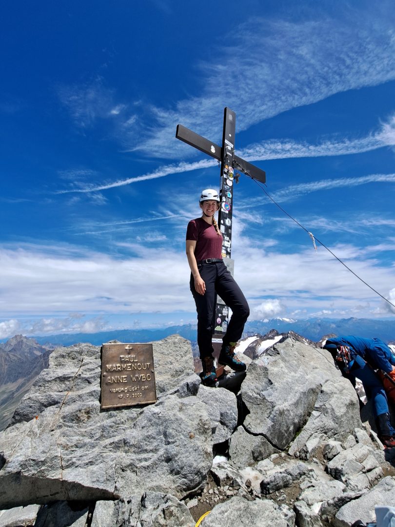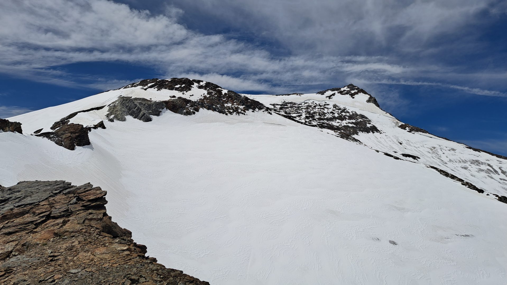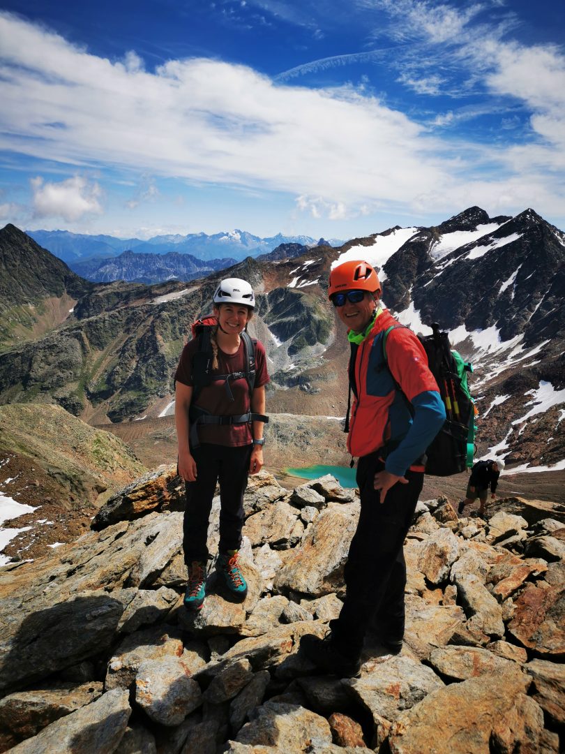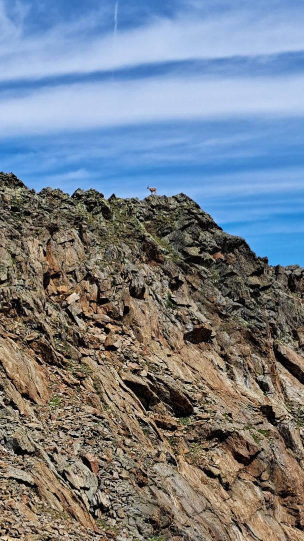 Tags darauf ging es bei perfektem Wetter unseren höchsten Ziel entgegen. Schon nach den ersten Metern über den noch seichten Gletscherschliff wurde es einsam und zunehmend steil. Nah an der Felswand zog sich der Steig über einige Serpentinen hinauf. Der Blick hinüber zur 2968m Hohen Wand und somit zur italienischen Grenze über die Schneebedeckten Berge und türkiesen Seen belohnte unsere Mühen gleichwohl. Nun hatten wir bereits die auf 2762m Hohe Seescharte erreicht. Von hier sollten wir am Nachmittag den Weg zur Sulzenauhütte antreten. Doch nach einer kurzen Pause stiegen wir weiter und weiter nach oben. Der Steig wurde deutlich anspruchsvoller, ein Steinbock begrüßte uns hoch thronend und es ging an einer idyllischen Lacke vorbei. Am Abzweig zur 3052m hohen Gamsspitz stiegen wir für ein paar Meter etwas mühsam ab, überquerten ein flaches Schneefeld und stiegen amschließen über einen Kamm steil, mehr und mehr mit den Händen unterstützend hinauf. Die 3000m Grenze mit einer herrlichen Aussicht bis hin zu den Dolomiten und nun auch auf unser heutiges Ziel, den 3418m hohen Wilden Freiger, war erreicht. Nur mühsam, teils gesichert und zum Teil im tiefen Schnee war er erreichbar. Die Aussicht über das Becherhaus, den Pflerscher Tribulaun 3097 HM, das Zuckerhütl … einfach traumhaft.