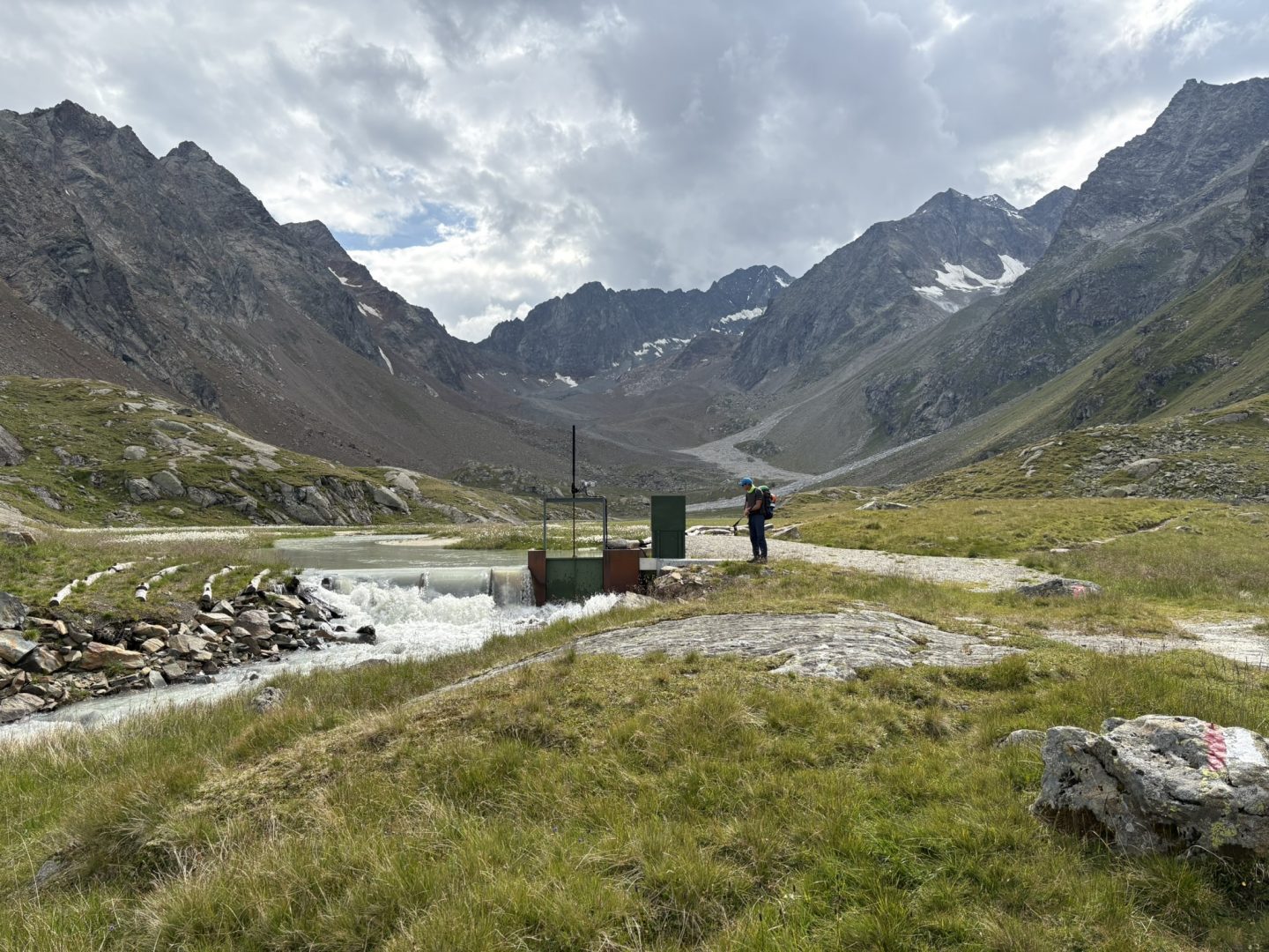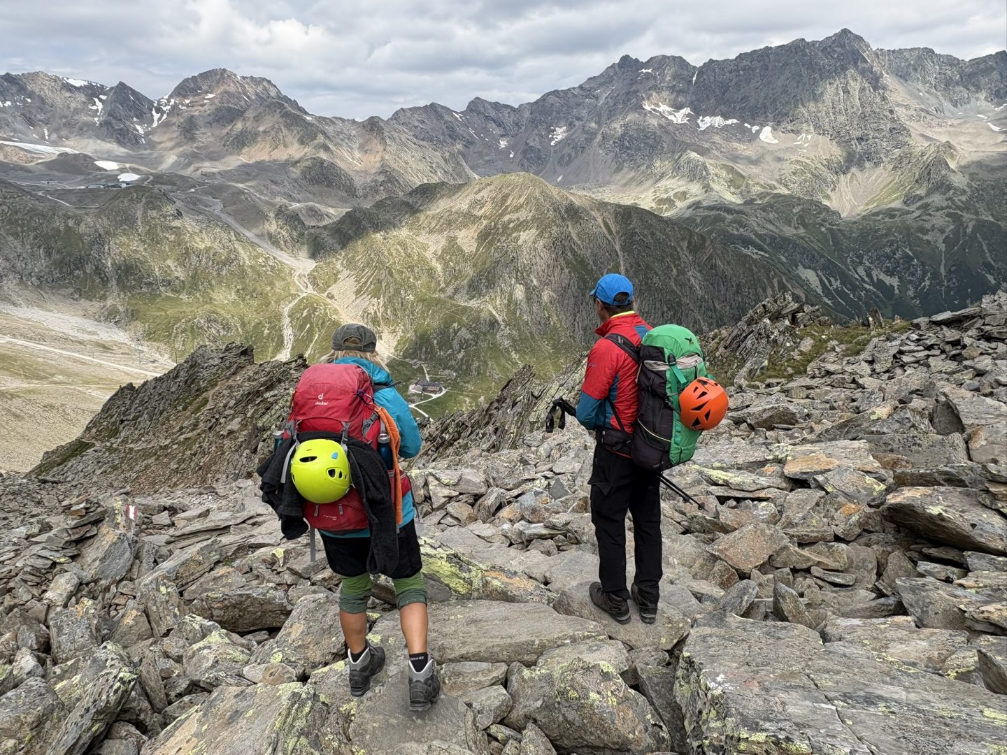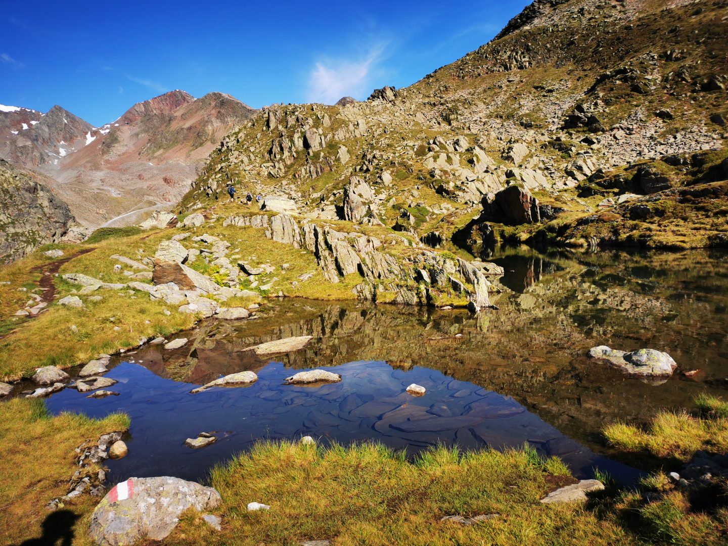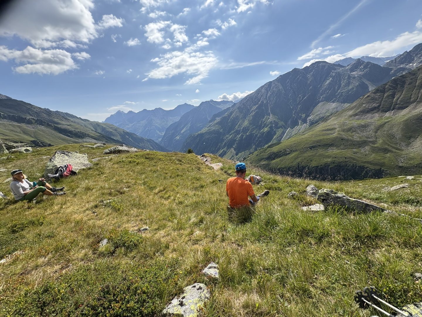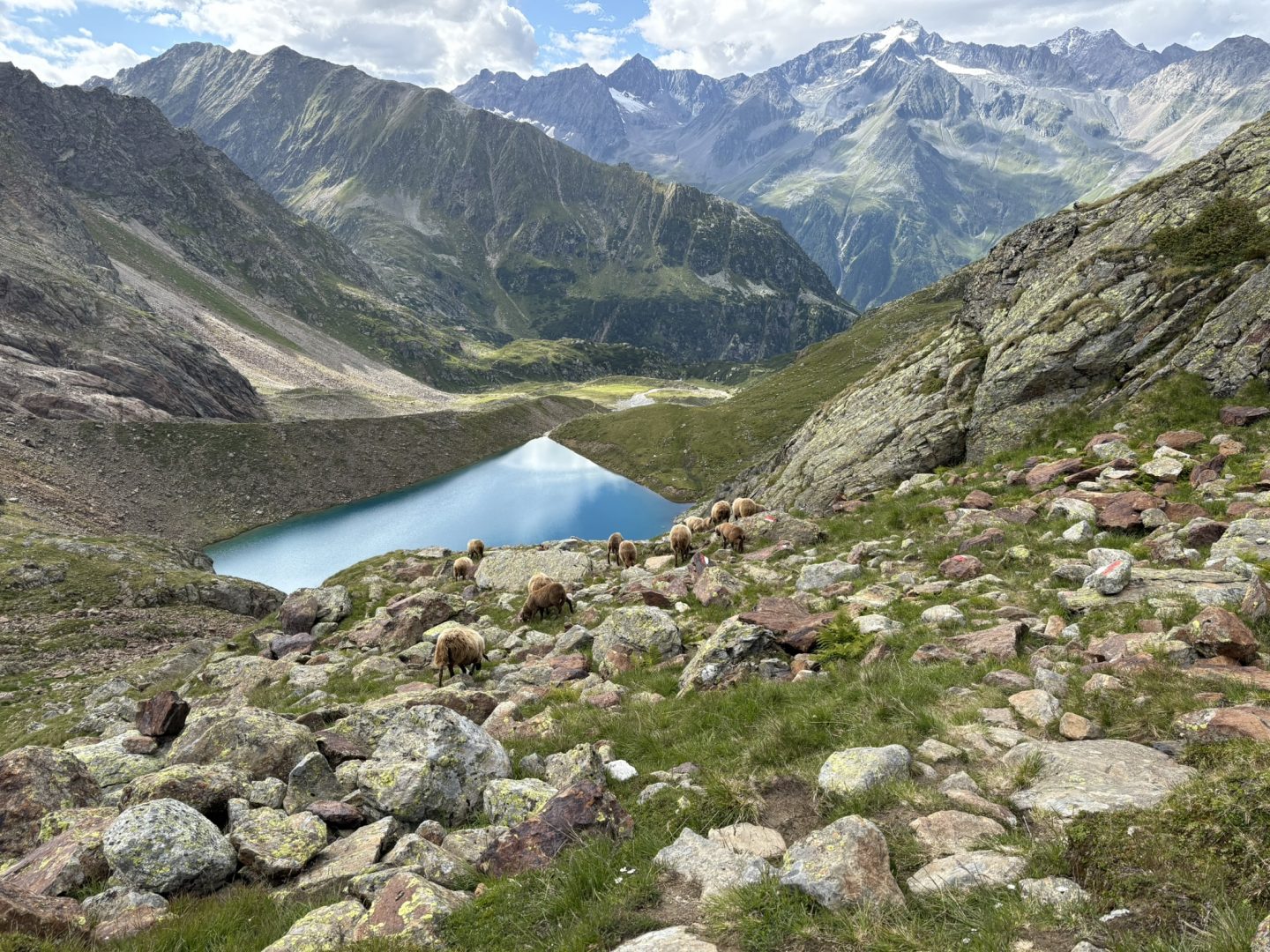 Nach einem längeren Abstieg über den selben Weg erreichten wir abermals die Seescharte. Lang und steinig zog sich der Weg über einige Geröllfelder bei atemberaubender Kulisse hinab, bis uns endlich wieder das erste Grün und ein paar Schafe begleiteten. Der Blick auf den smaragdgrünen See und die in der Ferne zu erspähende Hütte ließ uns neue Kraft schöpfen. Doch noch war der Weg noch weit. Kurz bevor wir freudestrahlend unsere Hütte erreichten, trafen wir den Weltrekordler Phillip Ausserhofer bei Werbeaufnahmen. Er hatte den gesamten Stubaier Höhenweg in ganzen 12 Stunden und 57 Minuten bewältigt – alle Achtung!