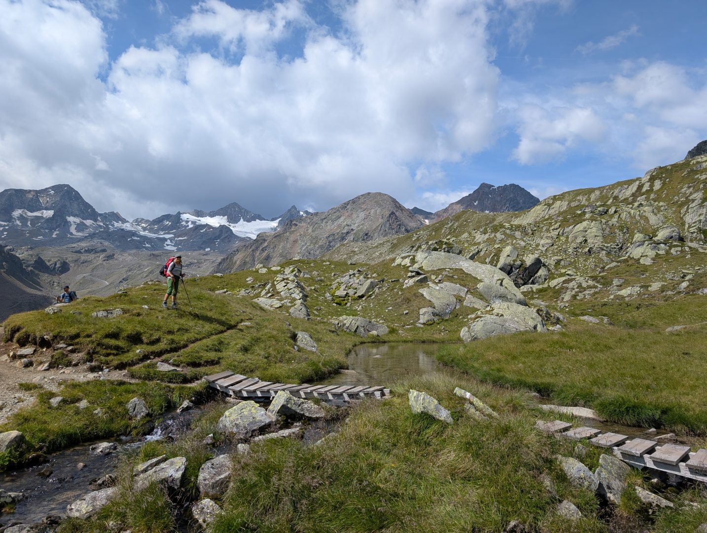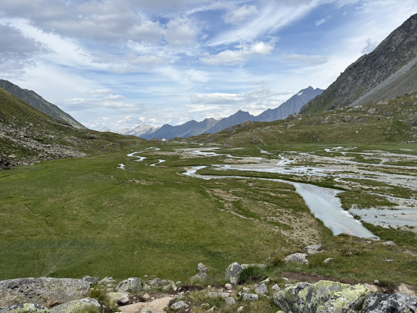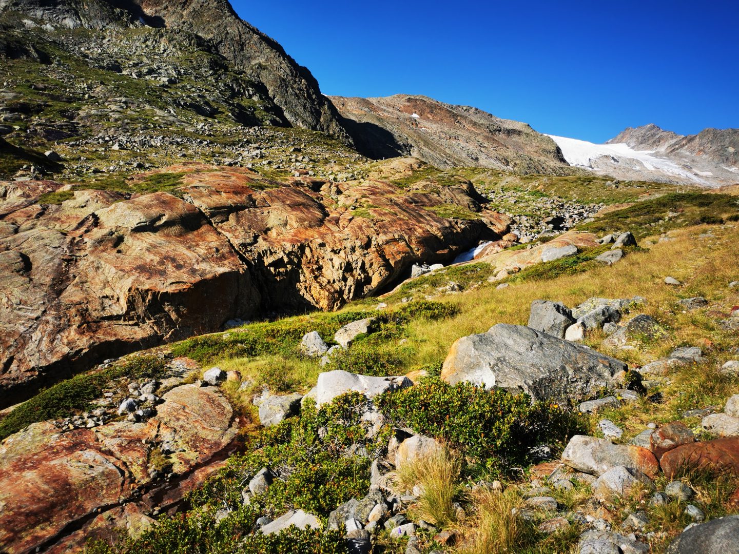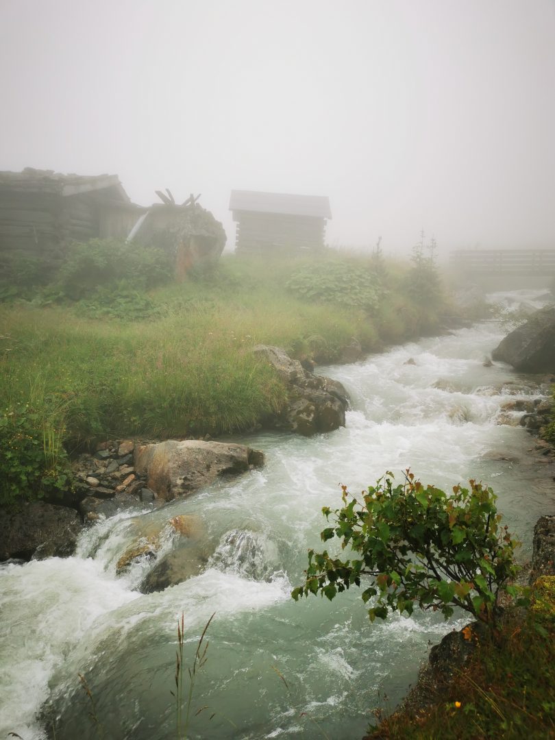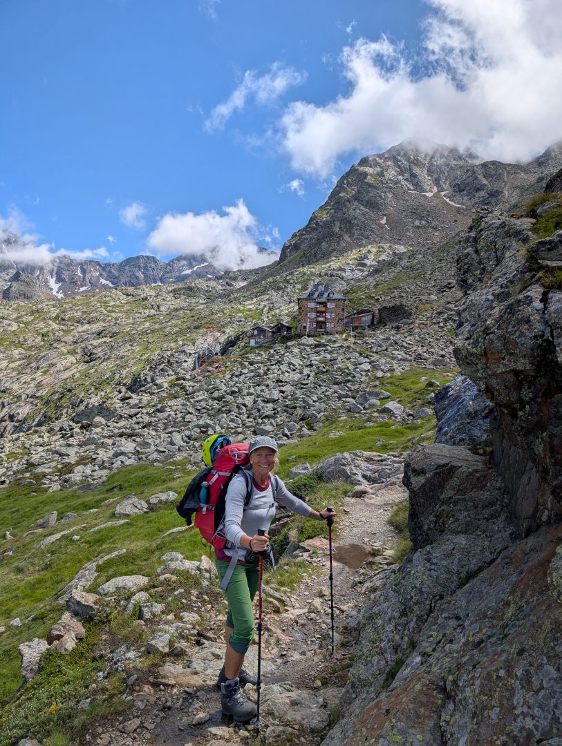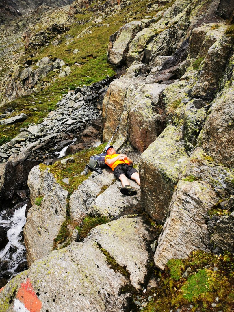 Geschafft? Von wegen, nun balancieren wir über ein Meer an Blockwerk und Geröll, welches der benachbarte Gletscher hier über dem Toteis hinterlassen hat. Die Hütte längst im Blick und weit voraus kommt und kommt nicht näher. Schön und anstrengend zugleich geht es durch diese Mondlandschaft hinab. Immer wieder steigen wir über die verzweigten Arme des Falbesoner Bachs dem frischen Grün entgegen und erreichen schließlich die auf 2286 HM gelegene Neue Regensburger Hütte mit ihrem modernen aus Holz gefertigten Neubau. Sie ist die erste rein vegetarische Berghütte in Tirol und liegt in einer traumhaften Umgebung.