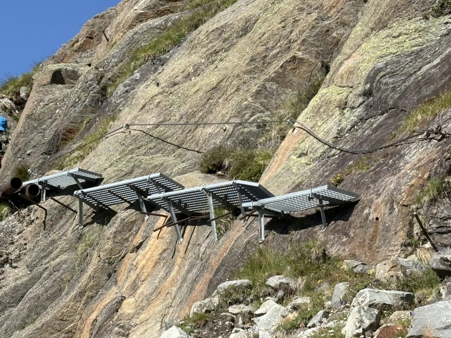 Der heutige Tag stellt uns den schönsten aber wohl auch anspruchsvollsten Teil unserer Tour bereit. Erstmal steigen wir den schönen Steig, unterhalb des Egesengrates, vorbei an einer kleinen Lacke bis auf 2500 HM hinauf. Die Forststraße kürzen wir weitgehend ab, nach einer Senke geht es nun einsam zum Mutterbergsee. Uns begegnet eine idyllische und weitläufige wunderschöne Landschaft. Seicht, in weiten Zügen oft sogar flach an steilen flanken führt uns der Höhenweg Kar um Kar weiter. Immer wieder geht es etwas steiler bergab und wieder bergauf, über einige Bachläufe und Wasserfälle. Im nur mäßig gesicherten Gelände steigen wir bei höchster Vorsicht immer wieder über heikle Kletterpassagen bis wir die Grawaggrabenscharte auf 2902 HM erreichen. Gerade steil erklommen mit irrer Aussicht zieht sich der Steig äußerst steil in die Tiefe. Unter uns ein Meer aus Stein, nun muss jeder Tritt sitzen, anfangs gibt es keine Sicherungen aber der Weg ist zu meistern. Nach einer Weile kommen ein paar Seile, Verankerungen und … plötzlich hängt ein etwa 50m langes Stahlseil im Nichts! Anhand dessen hangeln wir uns einzeln steil in die Tiefe. Geschafft!