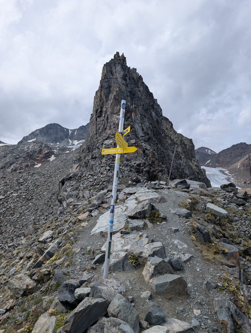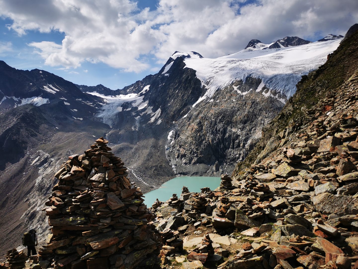 Jetzt schlängelt sich der Weg in Serpentinen steil hinauf zum Beiljoch 2676 HM. Hier werden wir unerwartet von einer ganzen Schar an unzähligen Steinmännchen empfangen. Ein letzter imposanter Blick zurück und es geht zunächst über Platten hinab zu einer schmalen Felsnase wo wir bereits von weitem auf die Dresdner Hütte und den Stubaier Gletscher sehen. Sehr steil und über einen äußerst schmalen Steig geht es nun endlos, aber sehr vorsichtig hinab, unserem Ziel entgegen. Immerhin sind wir noch weit über 2300 HM über steilem Geröll unterwegs, ehe wir die Dresdner Hütte (2302 HM erreichen.