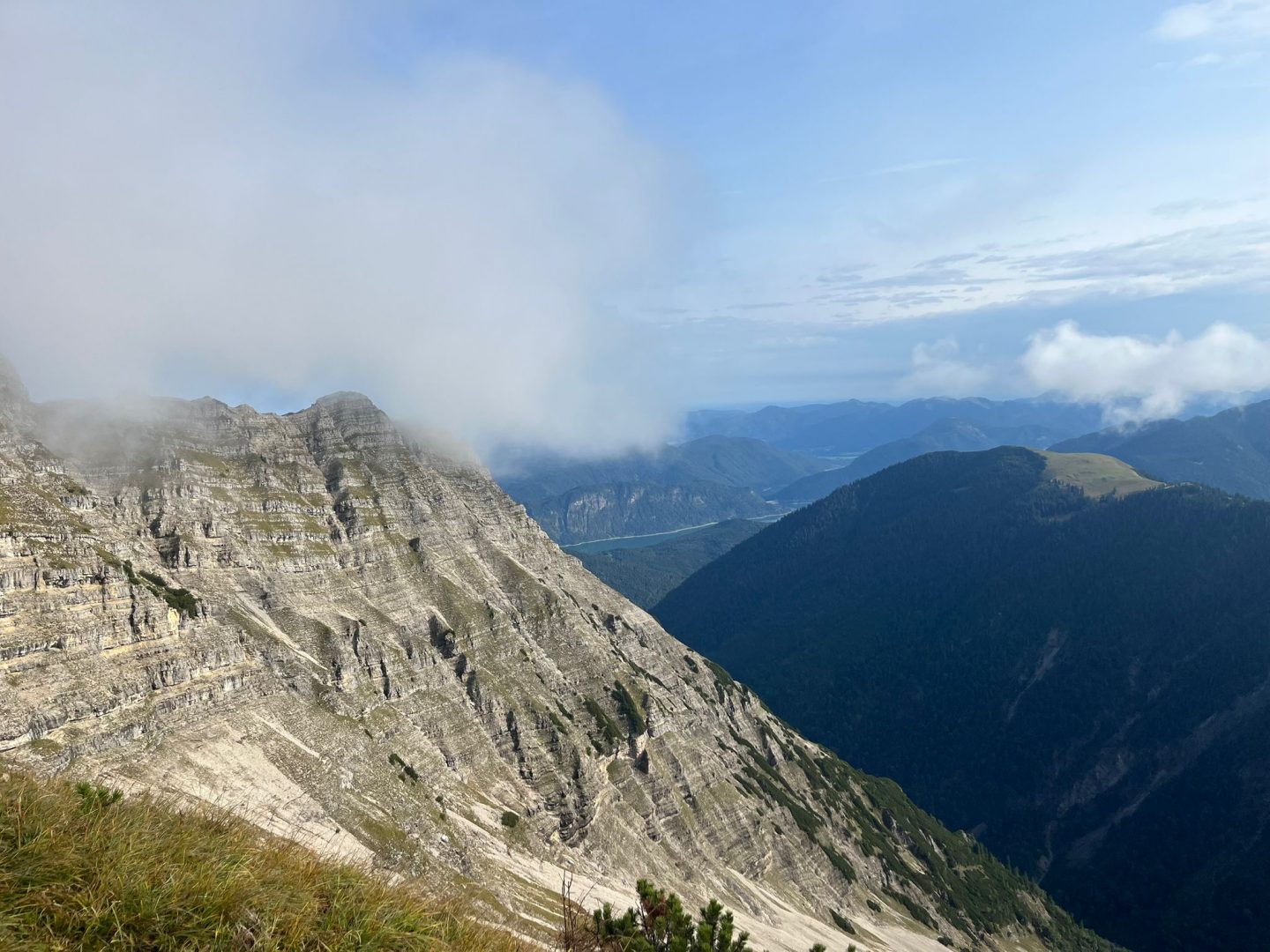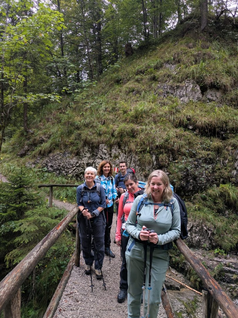 12. – 14.9.2025 Um 7 Uhr starten wir in Altenerding zu unserer dreitägigen Tour im Karwendelgebirge. Als erstes wird die Karte ausgebreitet und der Startpunkt der Tour ausfindig gemacht. Wo gehts los? Rissbachtal kurz hinter Vorderriß im Isartal. Nach einem Rucksackcheck wandern wir unter der Leitung von Irene am Reitsteig aufwärts. Aber nicht lange, da wir nach 15 Minuten die erste Pause einlegen. Wie war das? Tipp der Kursleiterin – leicht fröstelnd loslaufen – nein das wollten wir nicht. Also während es am Parkplatz noch kalt war, müssen wir gleich nach dem Start die Jacken ausziehen, da wir ganz schön ins Schwitzen kommen. In vielen vielen Serpentinen geht der Steig mal rechts mal links vom Wasserlauf, den Grashang hinauf. Immer wieder überprüfen wir unsere Position auf der Karte, schließlich ist ein Kursthema „Orientierung“.