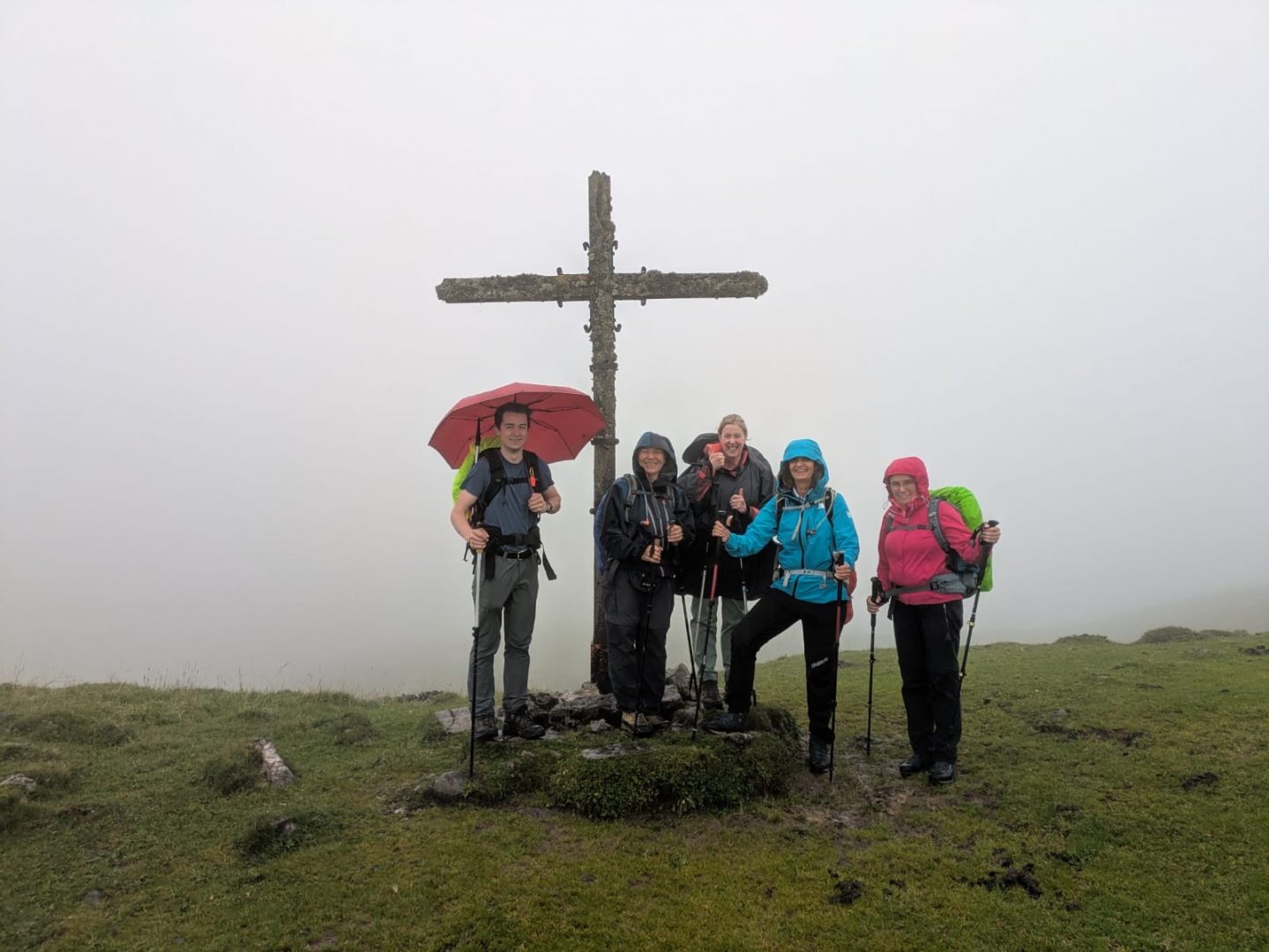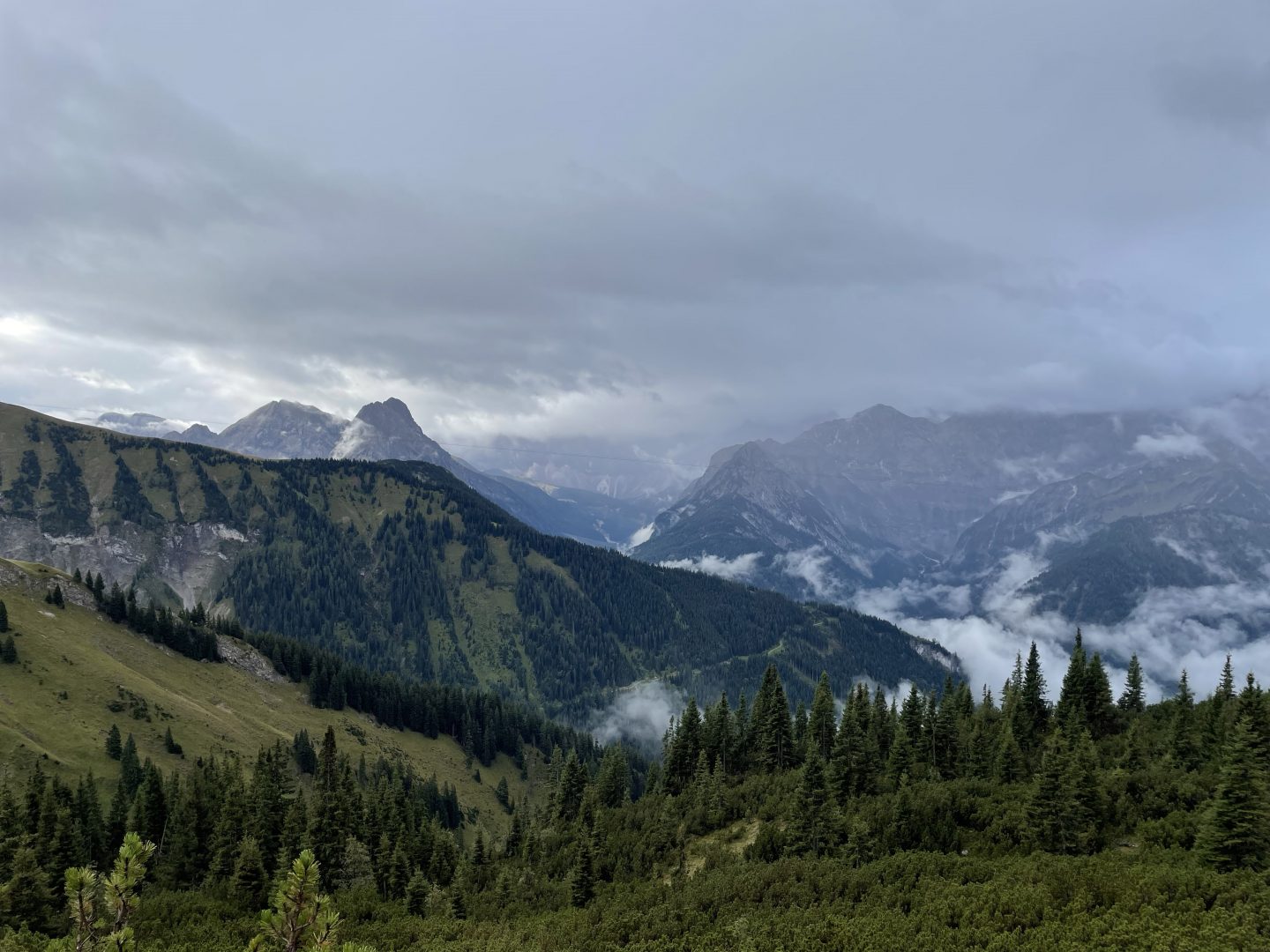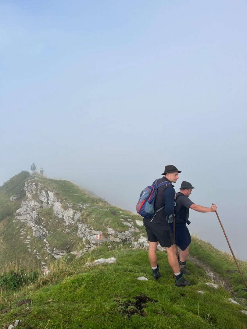 Bald steigen wir in ein dichtes Nebelfeld auf, leichter Nieselregen setzt ein und eine schlammige Wiese bremst uns aus. Im dichten Nebel sehen wir kaum noch die Wegmarkierungen. Trotz allem, die Stimmung bleibt ausgelassen und wir gehen Richtung Moosenalm. Im Nebel tauchen die ersten Kühe auf, die teilweise direkt auf unserem Weg stehen, sich aber mit etwas Motivation von Irene leicht vertreiben lassen. Der letzte Wegabschnitt ist besonders rutschig – hier sind die Wanderstöcke Gold wert. Der leichte Regen hört auf, und auch das letzte Wegstück wird auch geschafft. Jetzt taucht die Tölzer Hütte nach knapp fünf Stunden wandern auf, ein willkommener Anblick! Der „Check-in“ läuft reibungslos, das Zimmer ist größer als erhofft, und das Abendessen ist gut. Was will man mehr? Vielleicht eine bessere Aussicht aus der Stube: Bis jetzt sieht man nur die Wolken, die in den Bergen hängen. Nach einer kurzen Theorieeinheit und etwas Wein planen wir die Route für den nächsten Tag. Die Wetteraussichten sind gemischt, aber kein Grund zur Sorge – wir sind ja bestens ausgerüstet. Wir rollen also unsere Hüttenschlafsäcke aus und hoffen auf das Beste. Der erste Tag des Kurses war ein voller Erfolg!