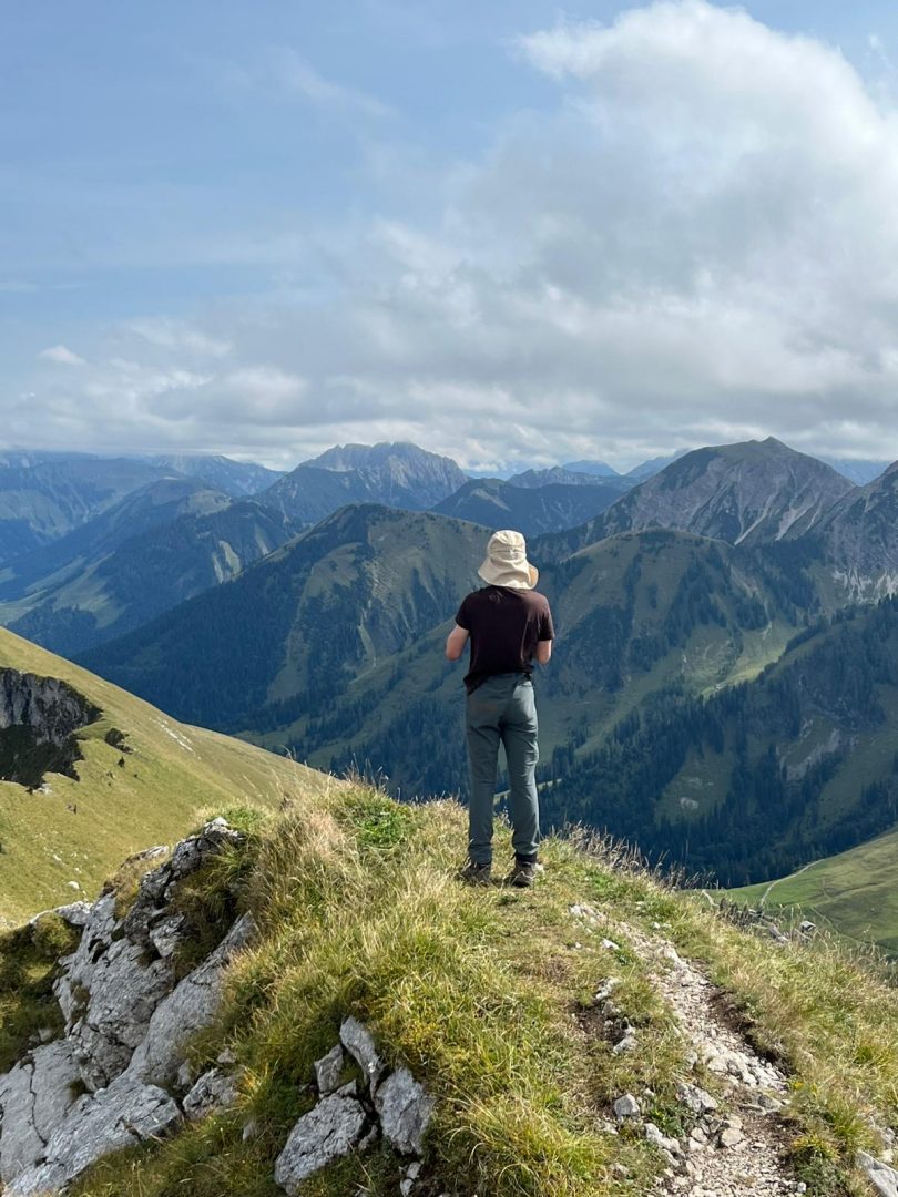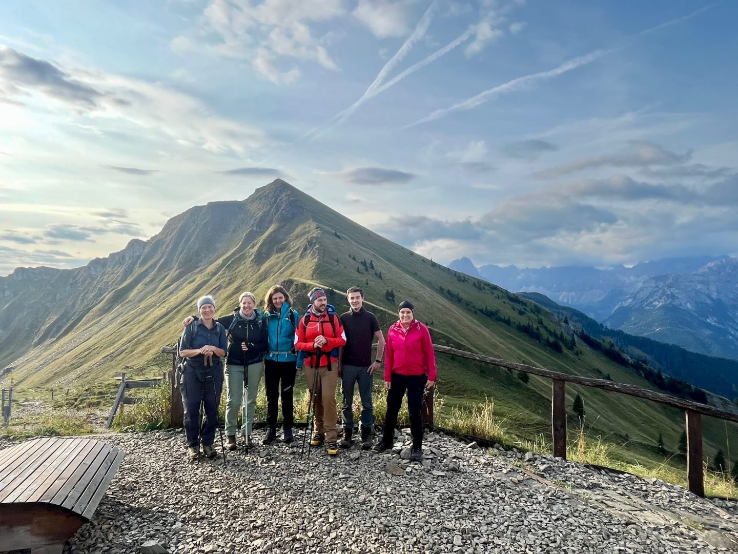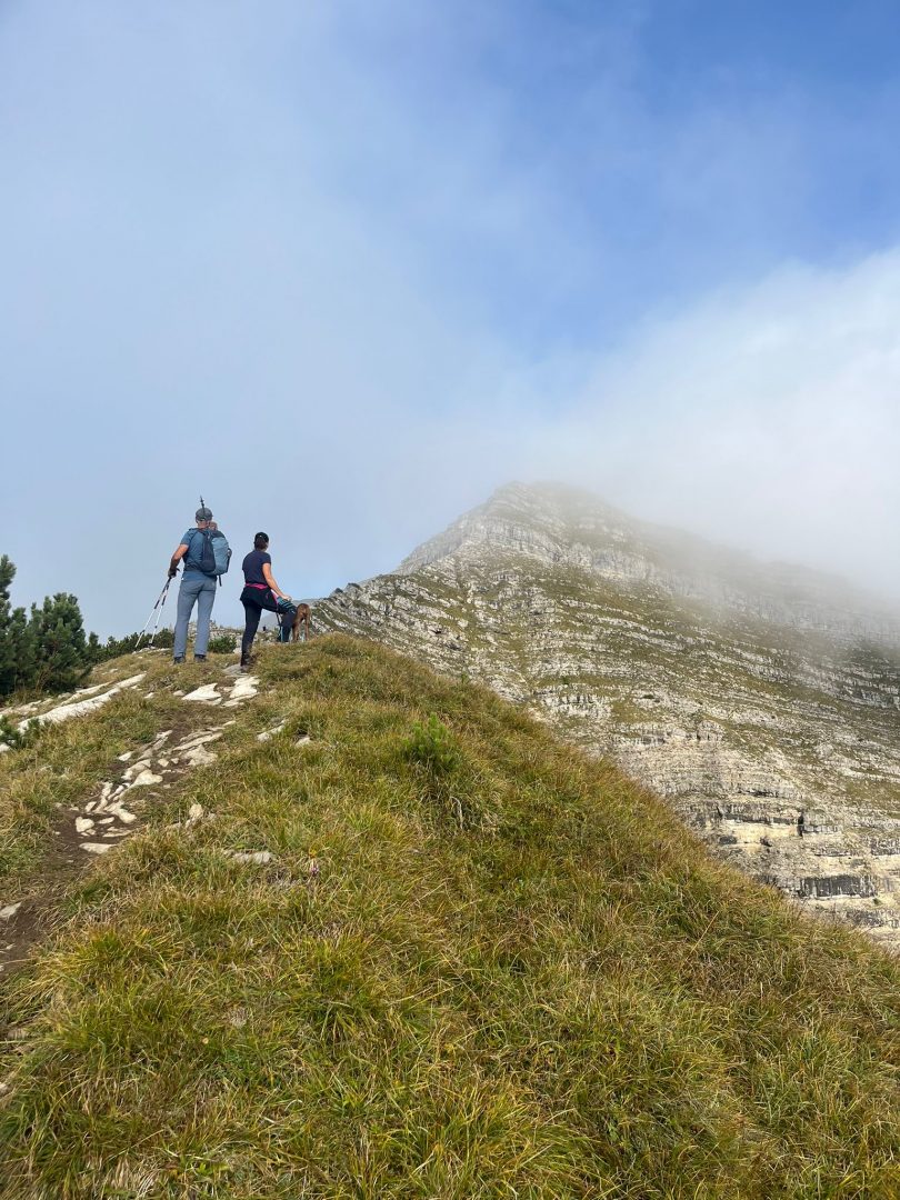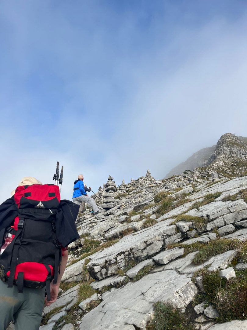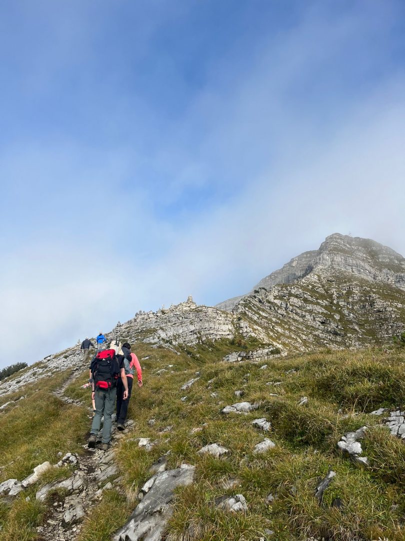 Für den Abstieg ist wieder volle Konzentration notwendig. Wir steigen sehr langsam vorbei an den „Stoamanderl“ wieder hinunter. Es sind weiterhin viele Wolken unterwegs und die Sonne will nicht so richtig durchkommen. Zu Mittag machen wir an der Tölzer Hütte Rast und stärken uns mit einer Kaspressknödelsuppe, Kaiserschmarrn, alkoholfreien Bier und Schorle. Es ist etwas windig und die Sonne spitz ab und an heraus, aber wir können draußen das Bergpanorama genießen. Von dort aus sehen wir auch schon unseren zweiten Gipfel, den wir heute noch vor uns haben, das Delpsjoch. Die Sonne lässt sich sehen und wir sind wieder frisch motiviert, diesmal einen Grashang (Südseite) hinaufzusteigen. Der Weg führt ziemlich steil hoch, so dass man Schritt für Schritt nur langsam aber stetig voran kommt, obwohl wir die Muskeln schon spüren. Trotz der Anstrengung trägt uns die Luft und Sonne höher und höher und wir freuen uns auf die tolle Aussicht und die hat es wirklich in sich!