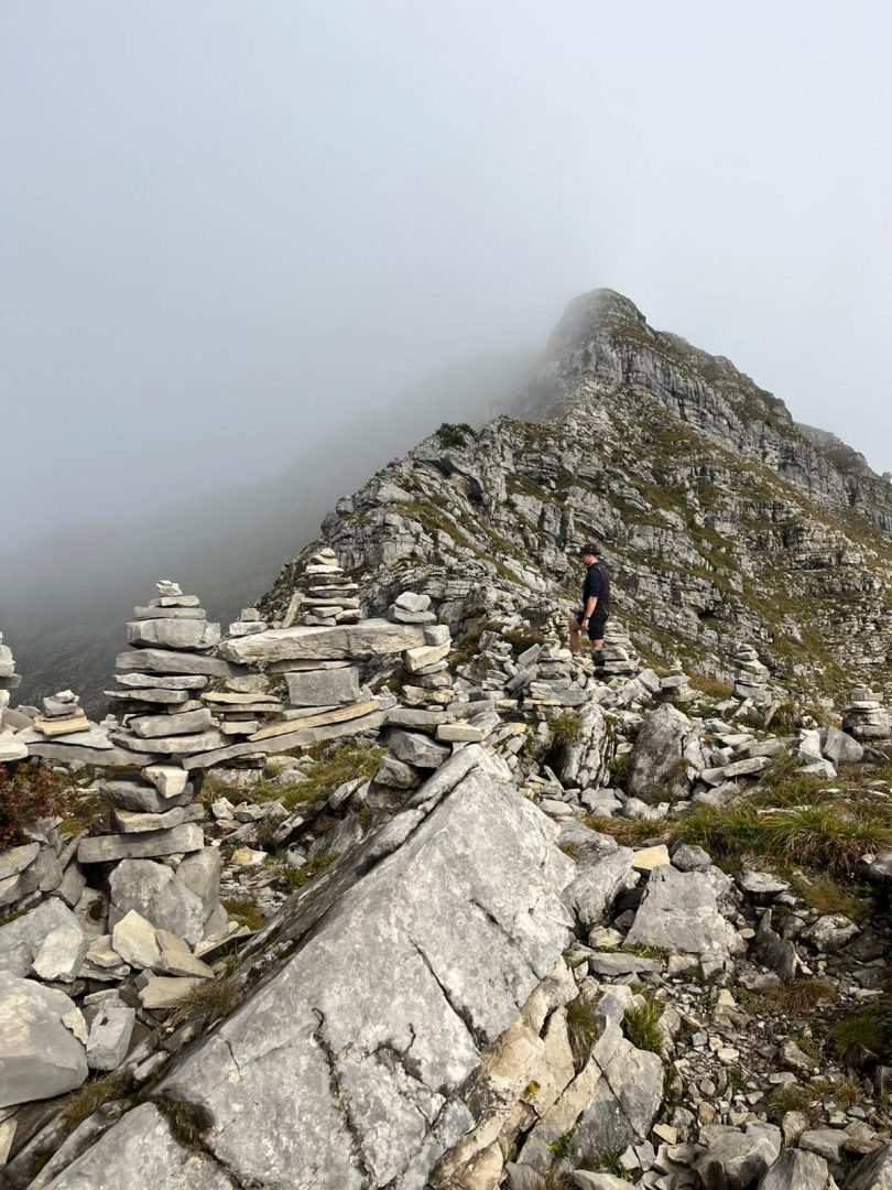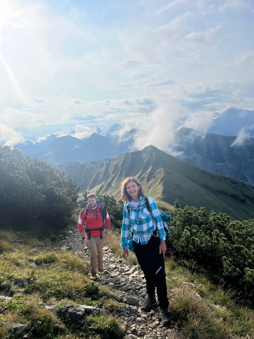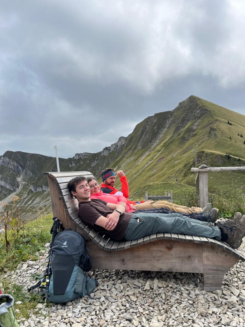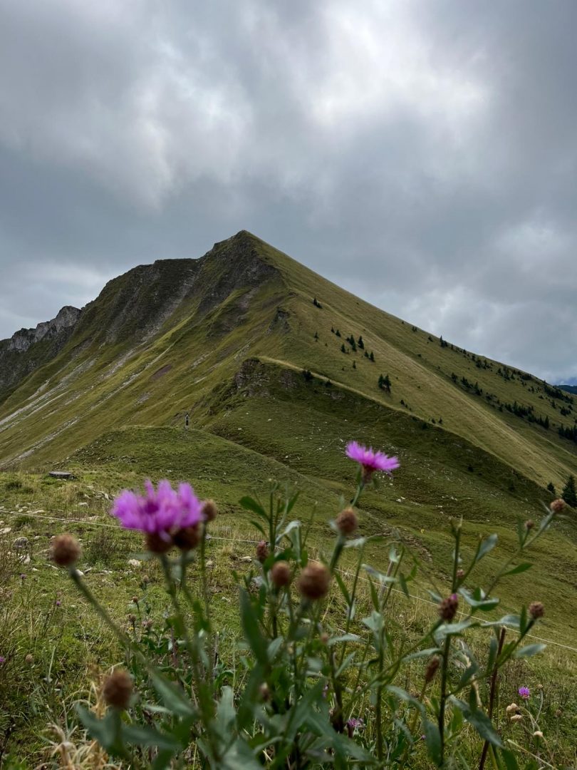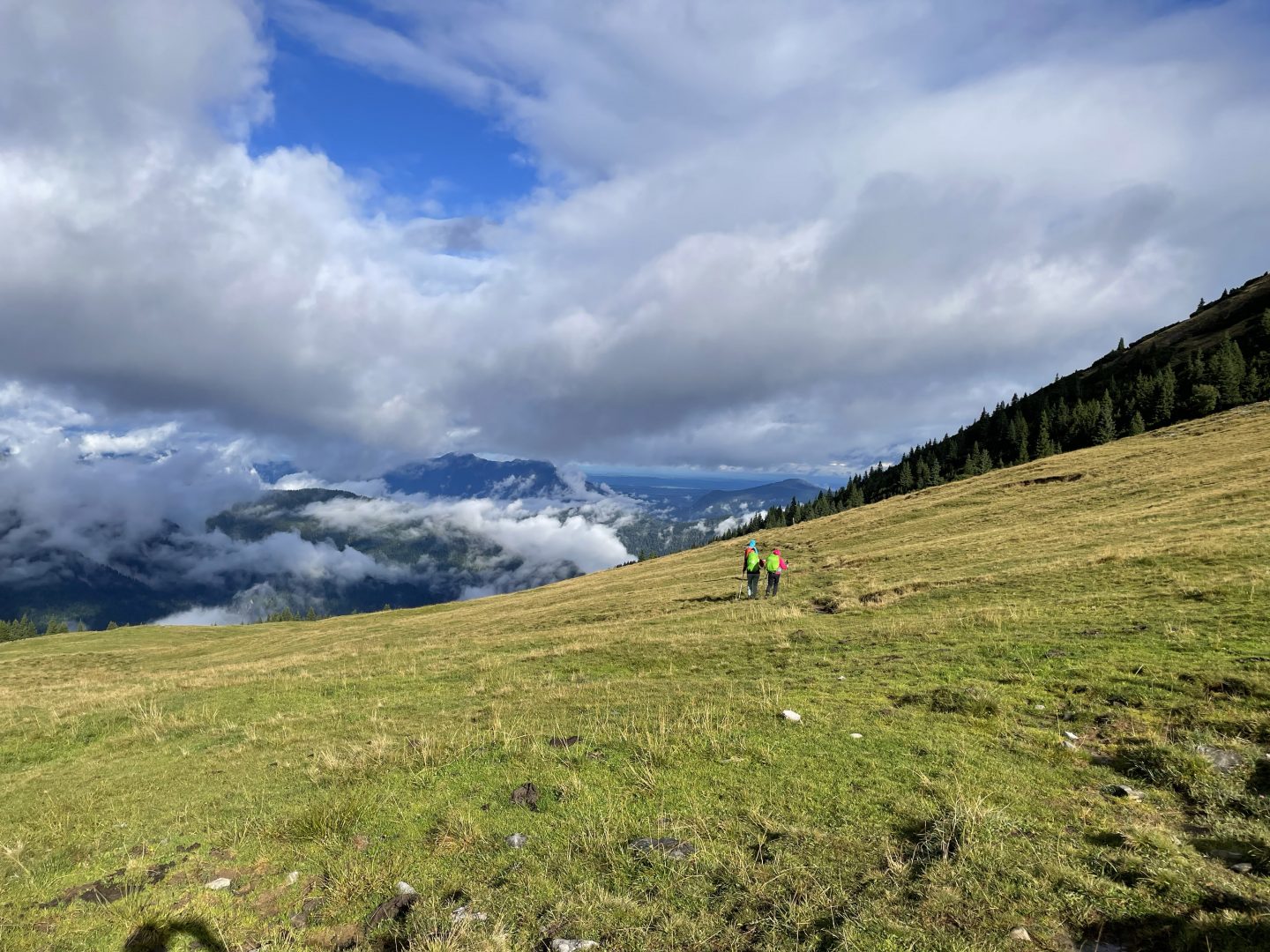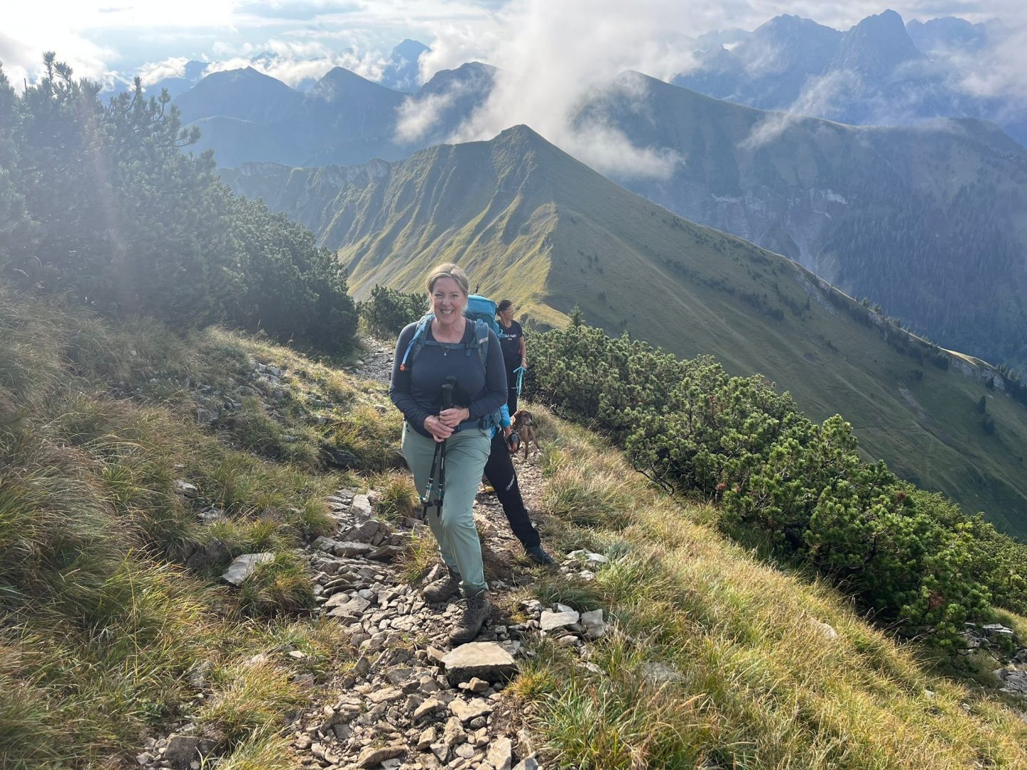 Für den Abstieg ist wieder volle Konzentration notwendig. Wir steigen sehr langsam vorbei an den „Stoamanderl“ wieder hinunter. Es sind weiterhin viele Wolken unterwegs und die Sonne will nicht so richtig durchkommen. Zu Mittag machen wir an der Tölzer Hütte Rast und stärken uns mit einer Kaspressknödelsuppe, Kaiserschmarrn, alkoholfreien Bier und Schorle. Es ist etwas windig und die Sonne spitz ab und an heraus, aber wir können draußen das Bergpanorama genießen. Von dort aus sehen wir auch schon unseren zweiten Gipfel, den wir heute noch vor uns haben, das Delpsjoch. Die Sonne lässt sich sehen und wir sind wieder frisch motiviert, diesmal einen Grashang (Südseite) hinaufzusteigen. Der Weg führt ziemlich steil hoch, so dass man Schritt für Schritt nur langsam aber stetig voran kommt, obwohl wir die Muskeln schon spüren. Trotz der Anstrengung trägt uns die Luft und Sonne höher und höher und wir freuen uns auf die tolle Aussicht und die hat es wirklich in sich!