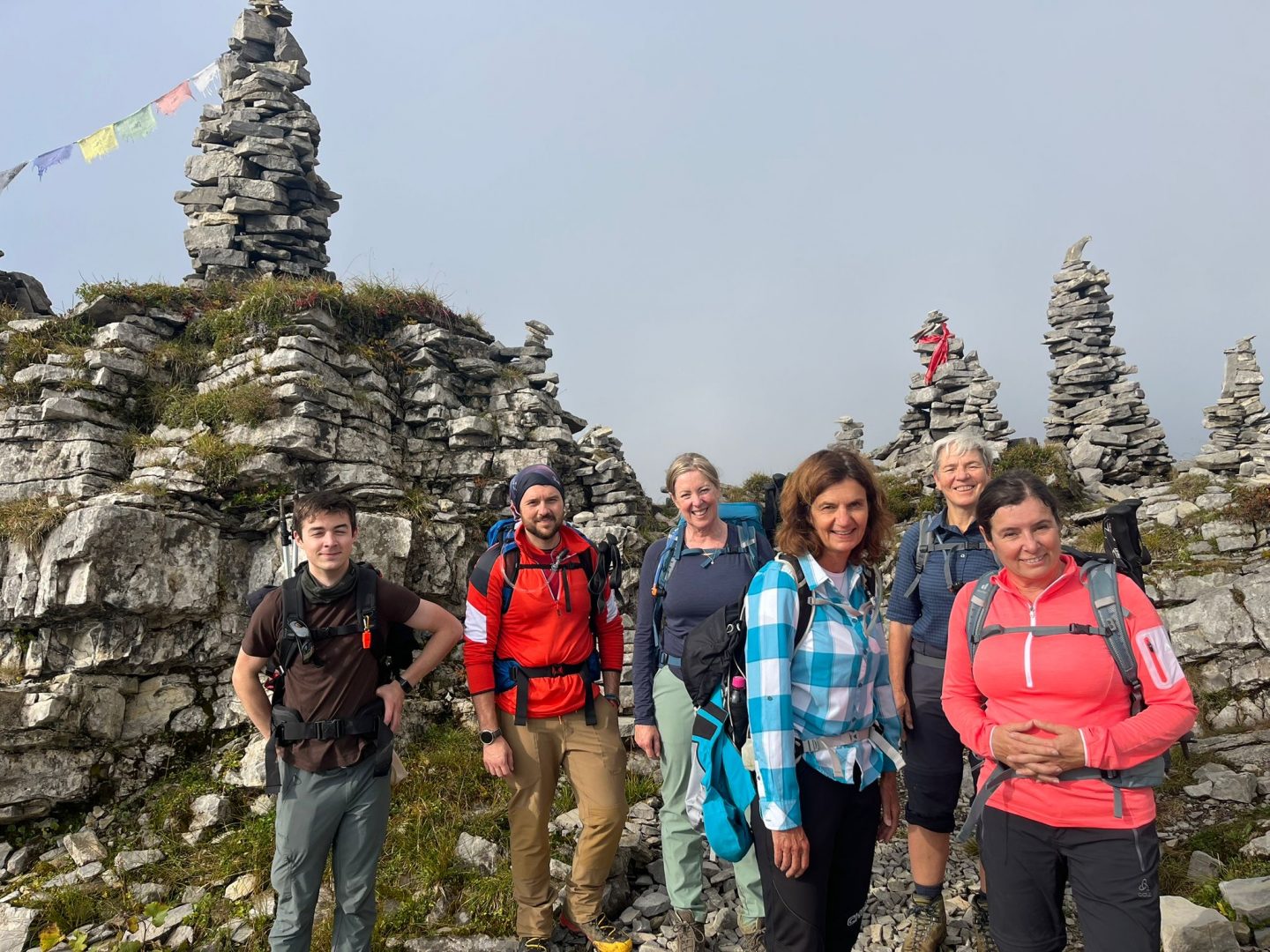 Wir starten um 10.15 Uhr, „wenig anziehen“ war die Devise, denn wir wollten auf den Schafreuther aufsteigen und der Steig geht ab der Tölzer Hütte mit einem ordentlichen Anstieg über Stock und Stein nach oben. Etwas mulmig ist uns schon, als wir den ersten Anstieg nehmen. Der Anstieg erweist sich als echte Herausforderung. Unsere Bergleiterin Irene steigt langsam voraus und gibt Tipps. Wir gehen hintereinander, weil der Weg zu schmal ist. Er zieht sich mit steilen Windungen nach oben und es kommen einzelne Kletterabschnitte, die mit Drahtseil gesichert sind. Die Anstrengung wird größer und größer und man mag gar nicht nach unten schauen. Die Frage – wie komme ich denn da überhaupt wieder herunter – mag ich mir gar nicht stellen. Als wir am Gipfelkreuz ankommen sind wir schon sehr stolz. Wir haben die 266 Höhenmeter gut gemeistert. Leider war die Aussicht wetterbedingt nicht so prickelnd, aber auch irgendwie mystisch.