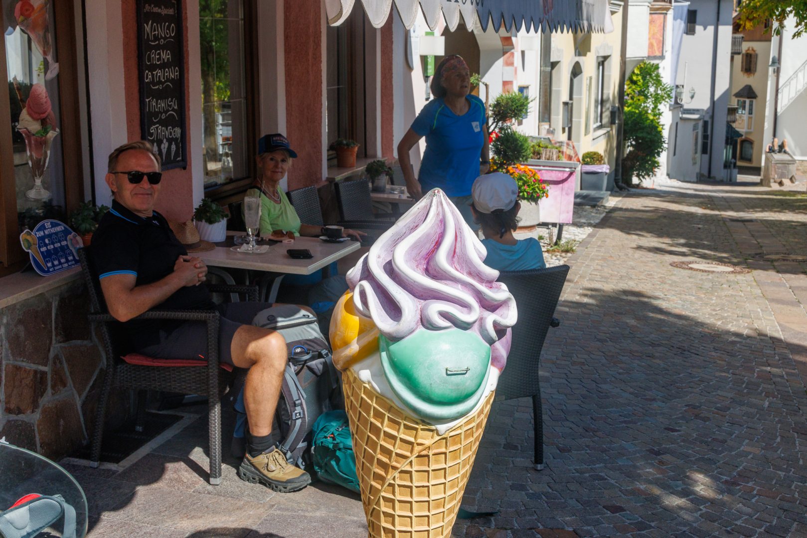 Auch die Autos wollen sicher und nahe an der Ortsmitte in Mühlbach abgestellt sein. Da wir noch Zeit haben, bis der Bus auf die Rodeneckeralm fährt, gönnen wir uns am Marktplatz noch einen Cappuccino.