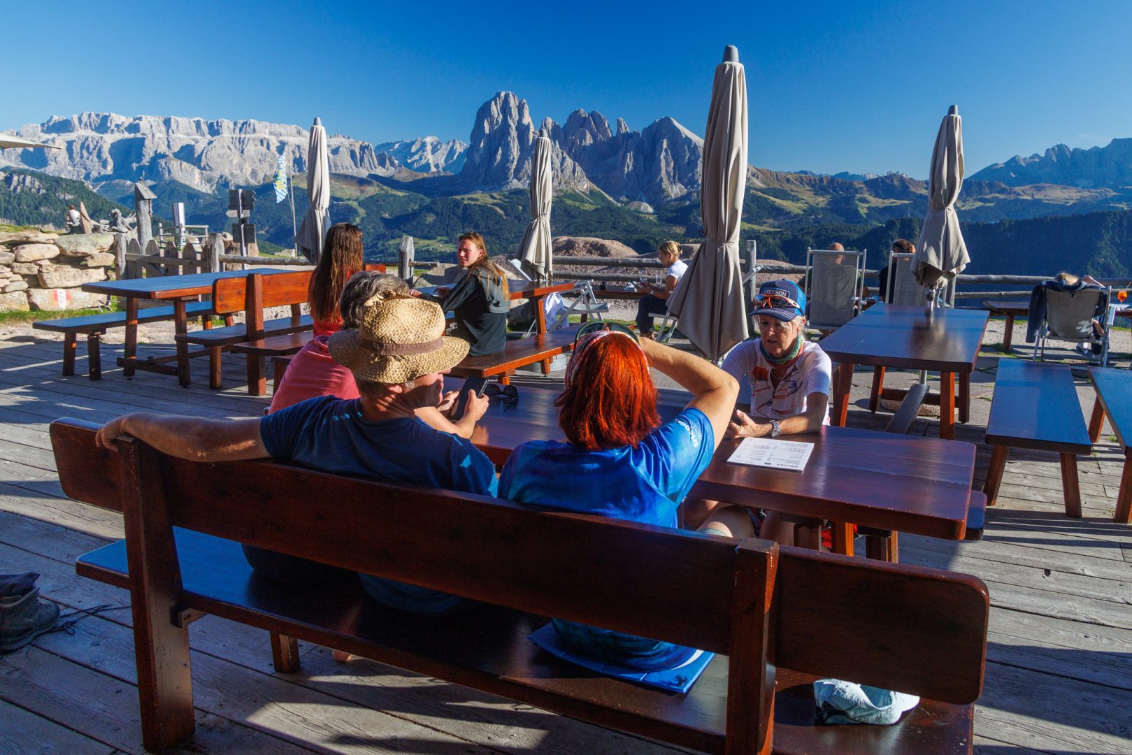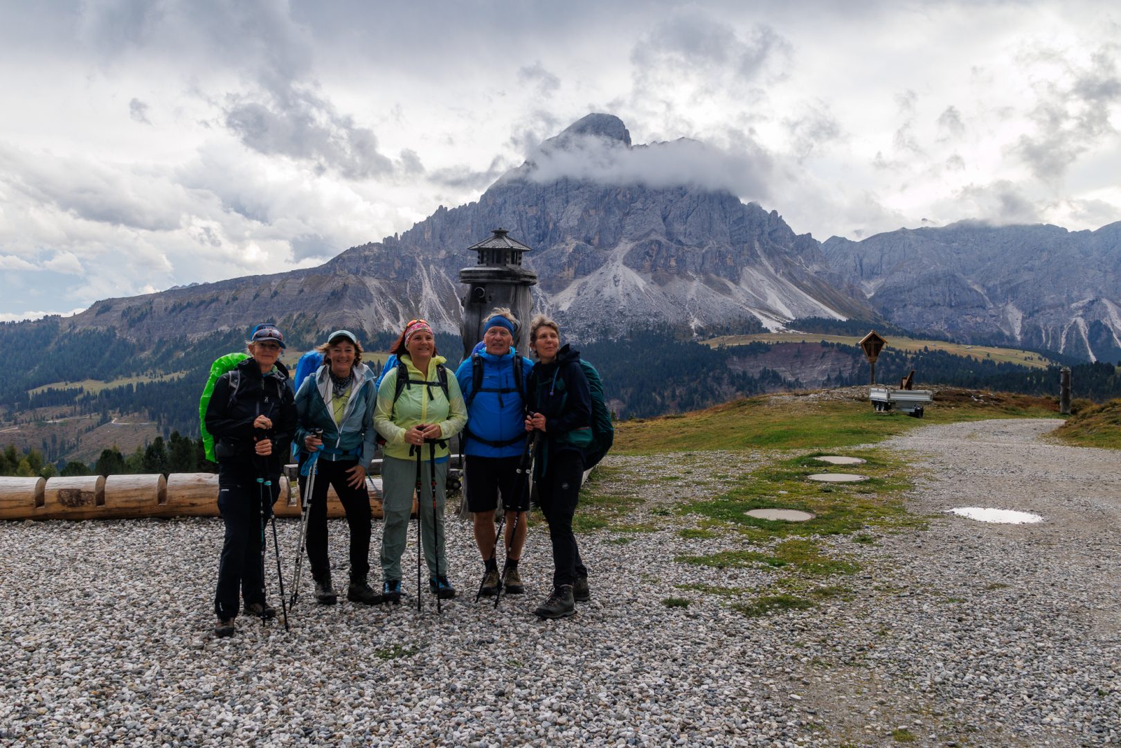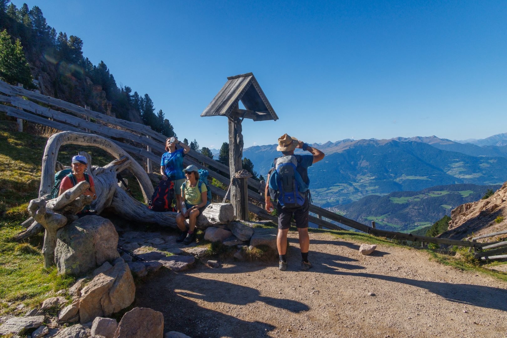 Nach einer kräftigen Stärkung geht es weiter Richtung Ziel, Richtung Lajen. Ein Teil der Gruppe macht einen kleinen Schwenker Richtung Wetterkreuz mit einer beeindruckenden Aussicht auf die Marmolata, den Rosengarten sowie die Seiser Alm.