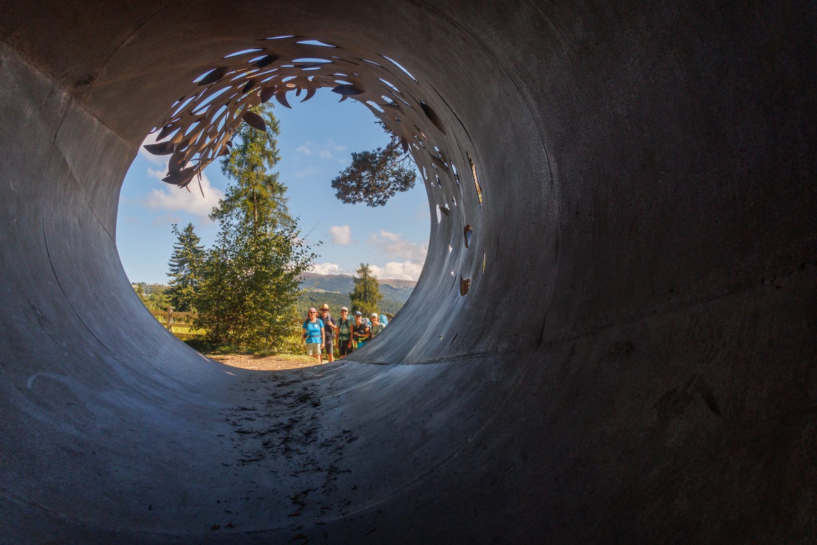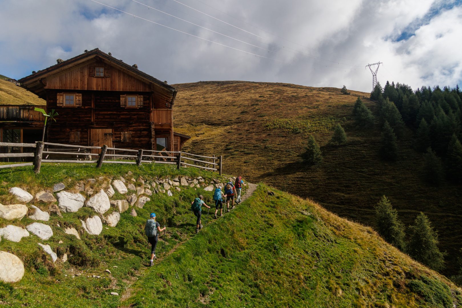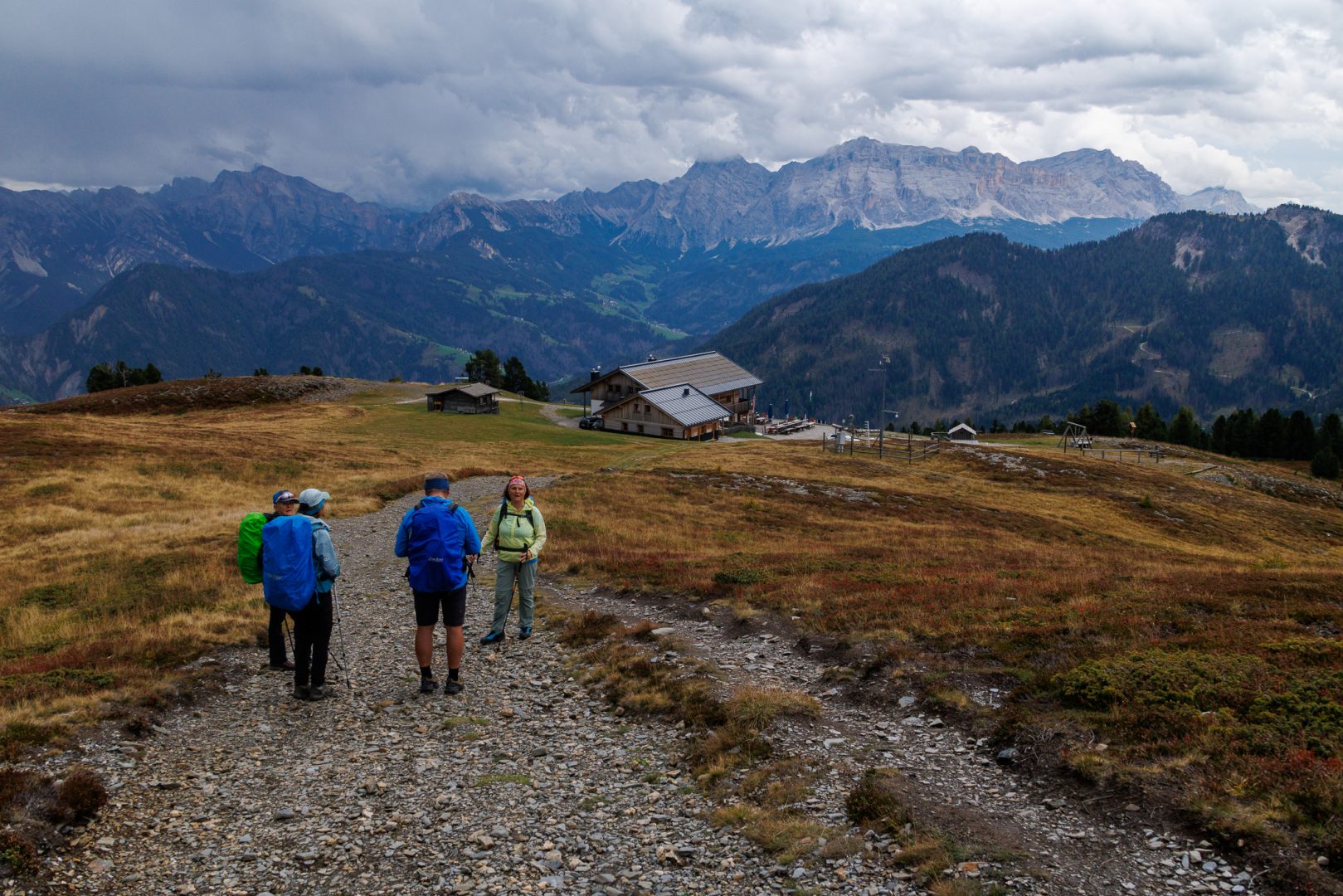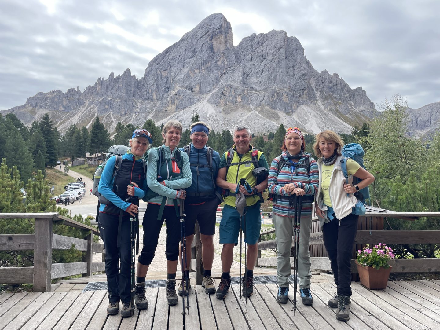 Nach einer kräftigen Stärkung geht es weiter Richtung Ziel, Richtung Lajen. Ein Teil der Gruppe macht einen kleinen Schwenker Richtung Wetterkreuz mit einer beeindruckenden Aussicht auf die Marmolata, den Rosengarten sowie die Seiser Alm.