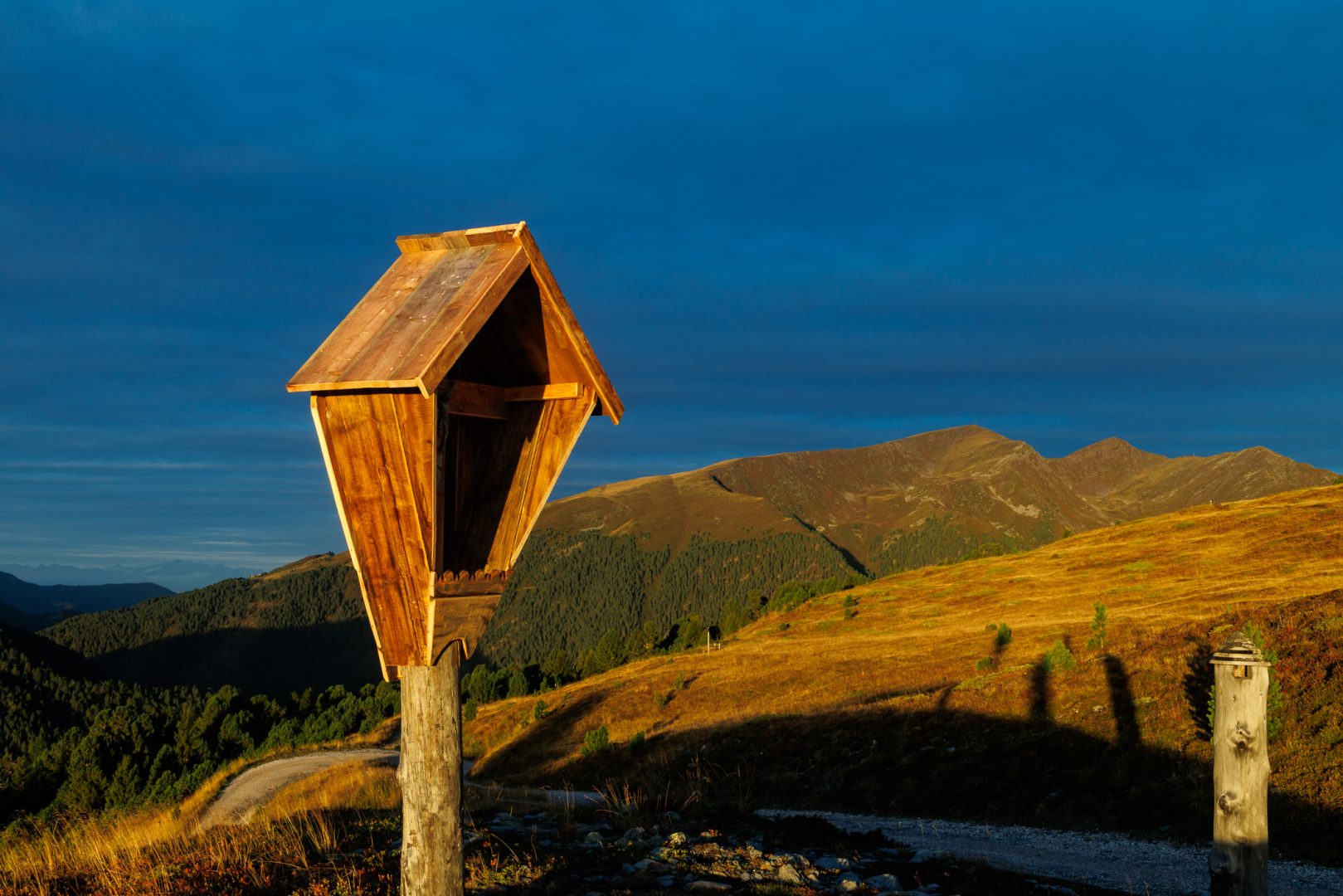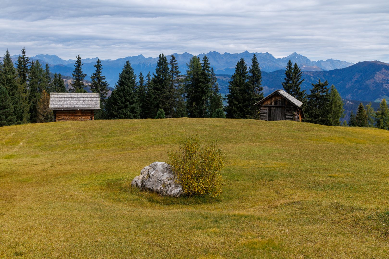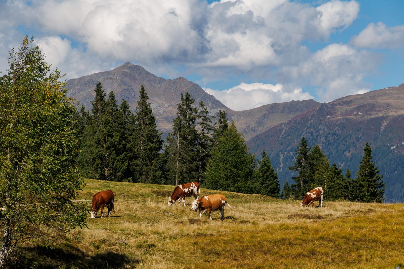 Oben angekommen ist es dann ruhig und landschaftlich wunderschön. Die Zirben, Tannen und Fichten geben angenehme Düfte ab und wir hören schon die Kuhglocken des Weideviehs.