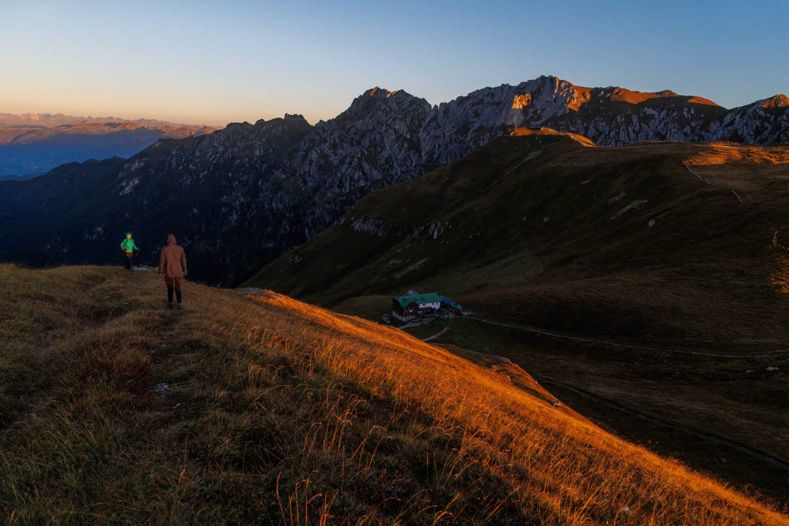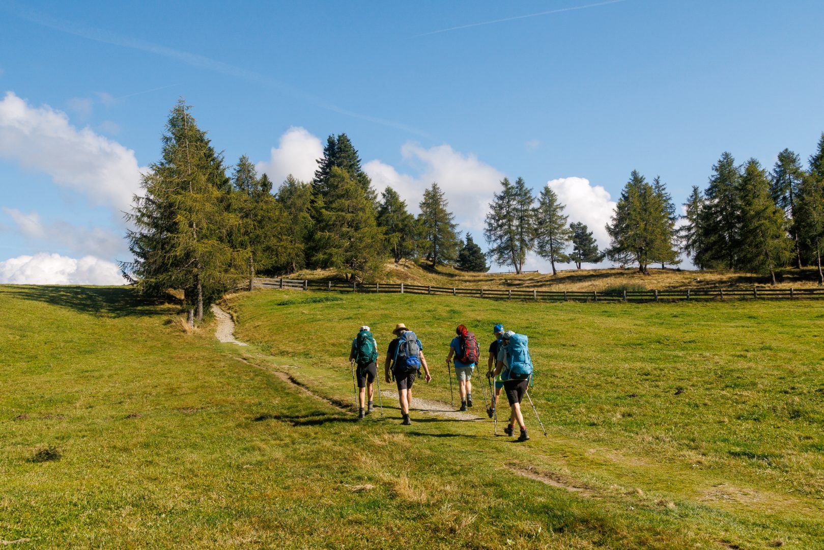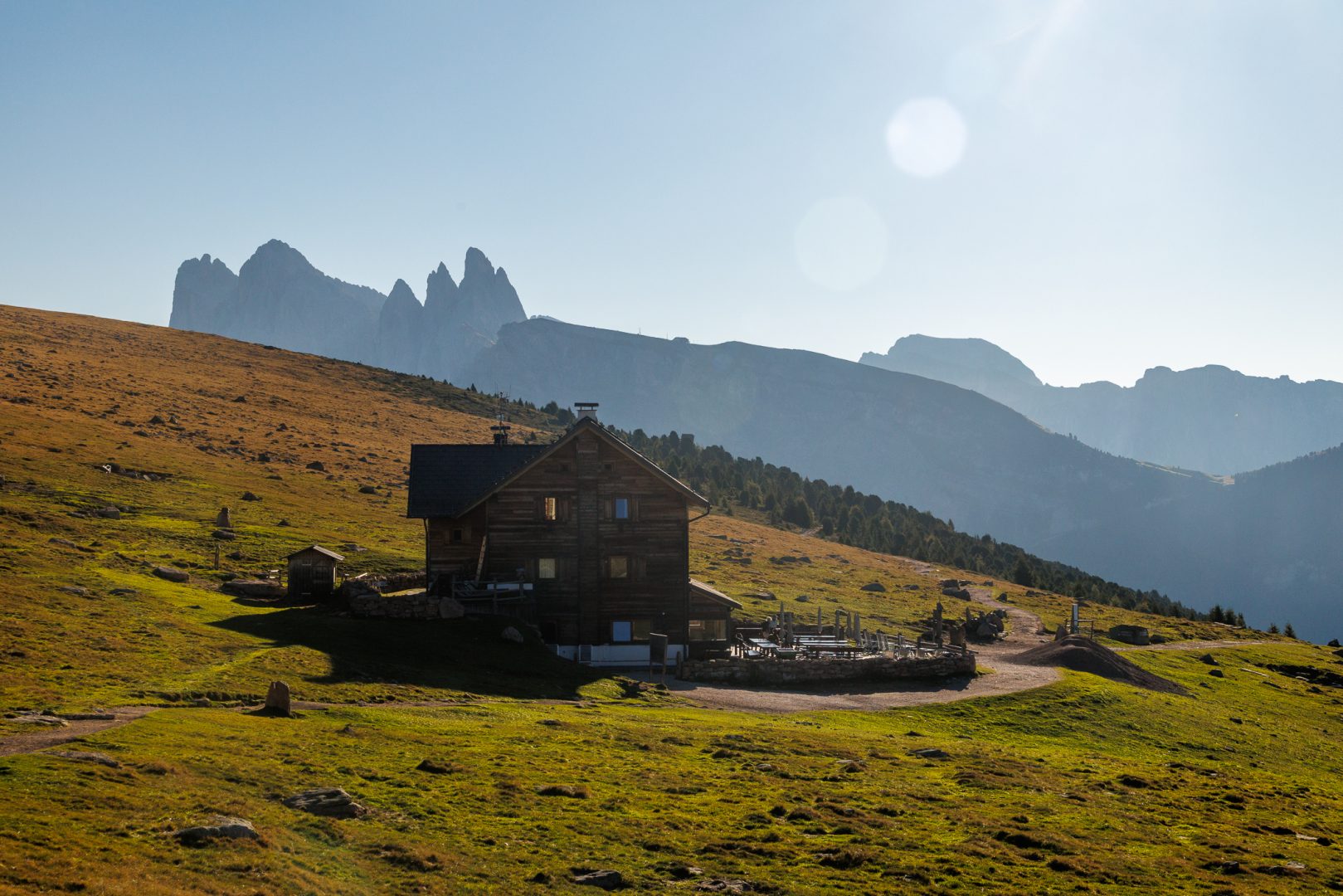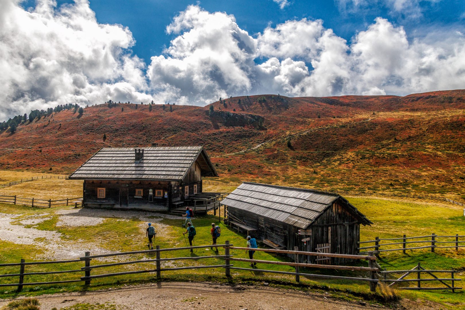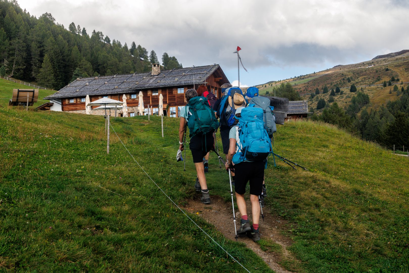 Gut gelaunt und gestärkt heißt es volle Kraft voraus zum Endspurt Richtung Schlüterhütte. Auf dem stärker ansteigenden Weg begeistern uns durch das besondere Sonnenlicht am späten Nachmittag die Farben der leuchtend grünen Almwiesen, der weitreichende Fernblick auf die Dolomiten und auch hinauf zum Peitlerkofelscharte (von der Westseite aus). Wieder lauschen wir gespannt den sehr informativen Bergerklärungen.