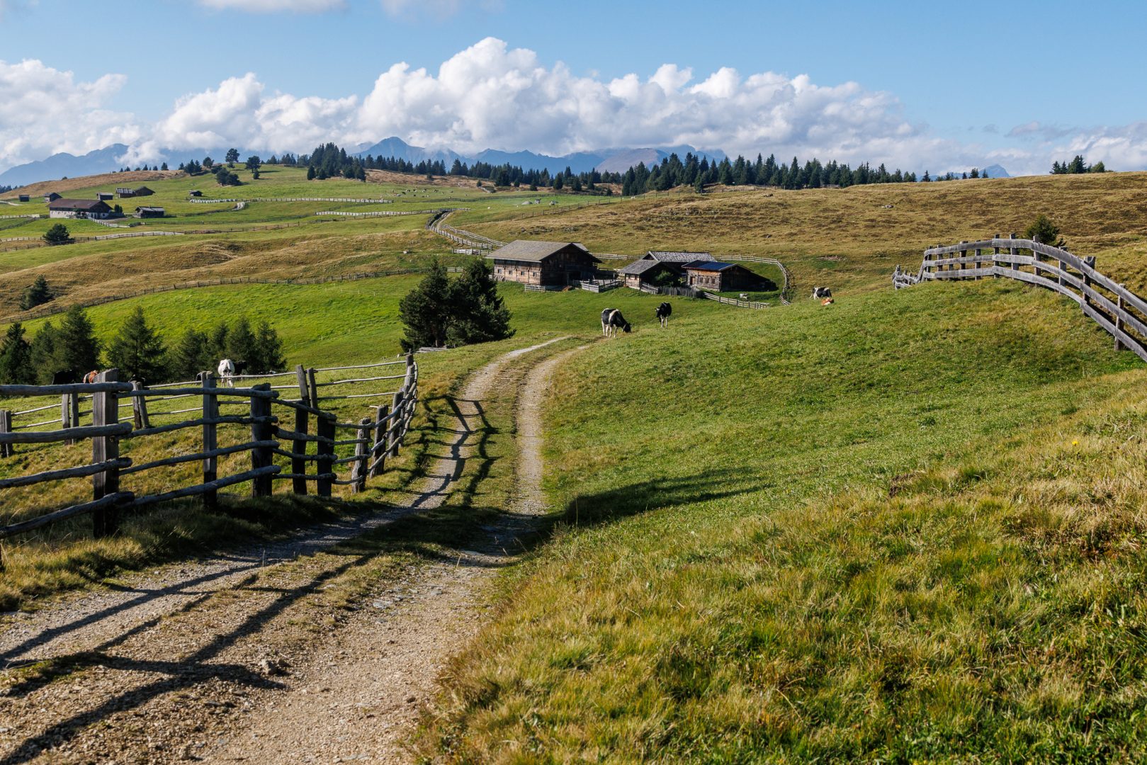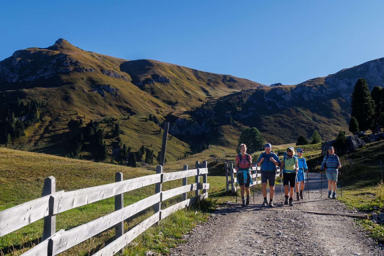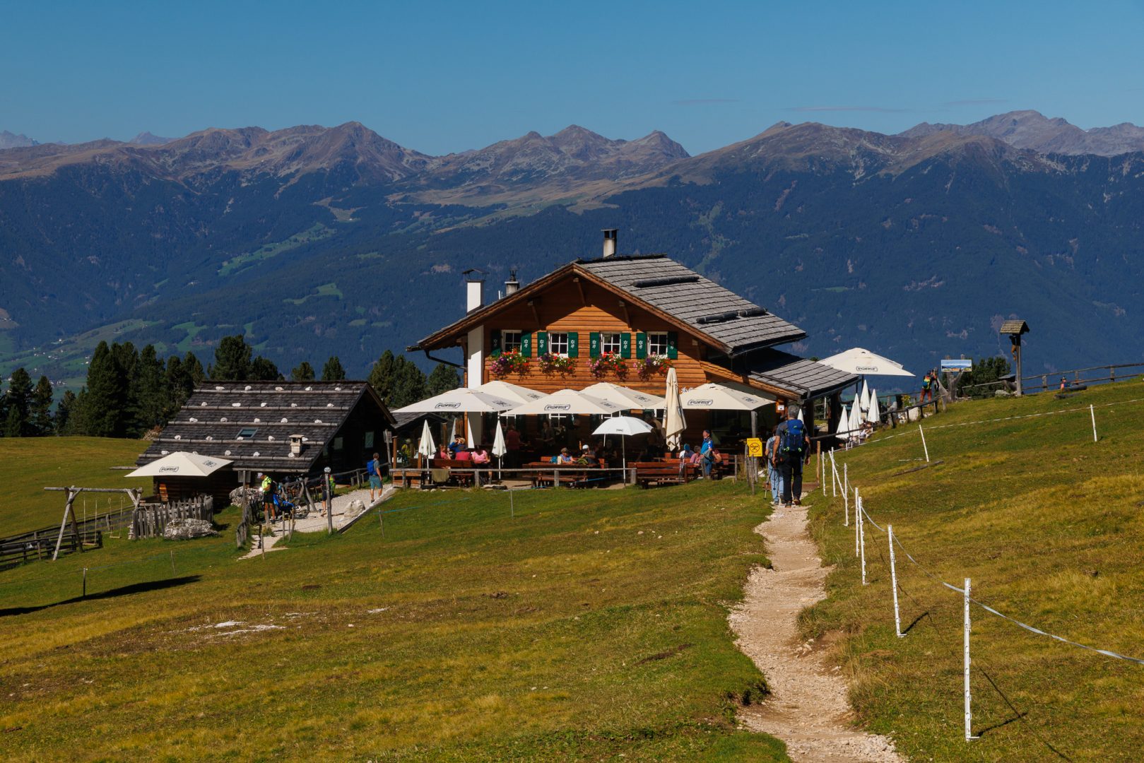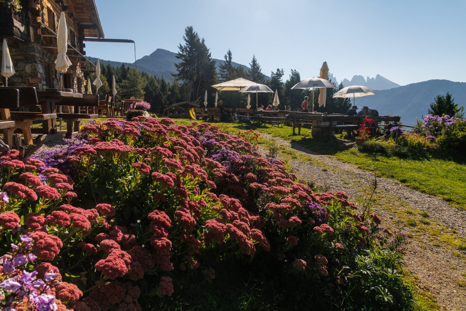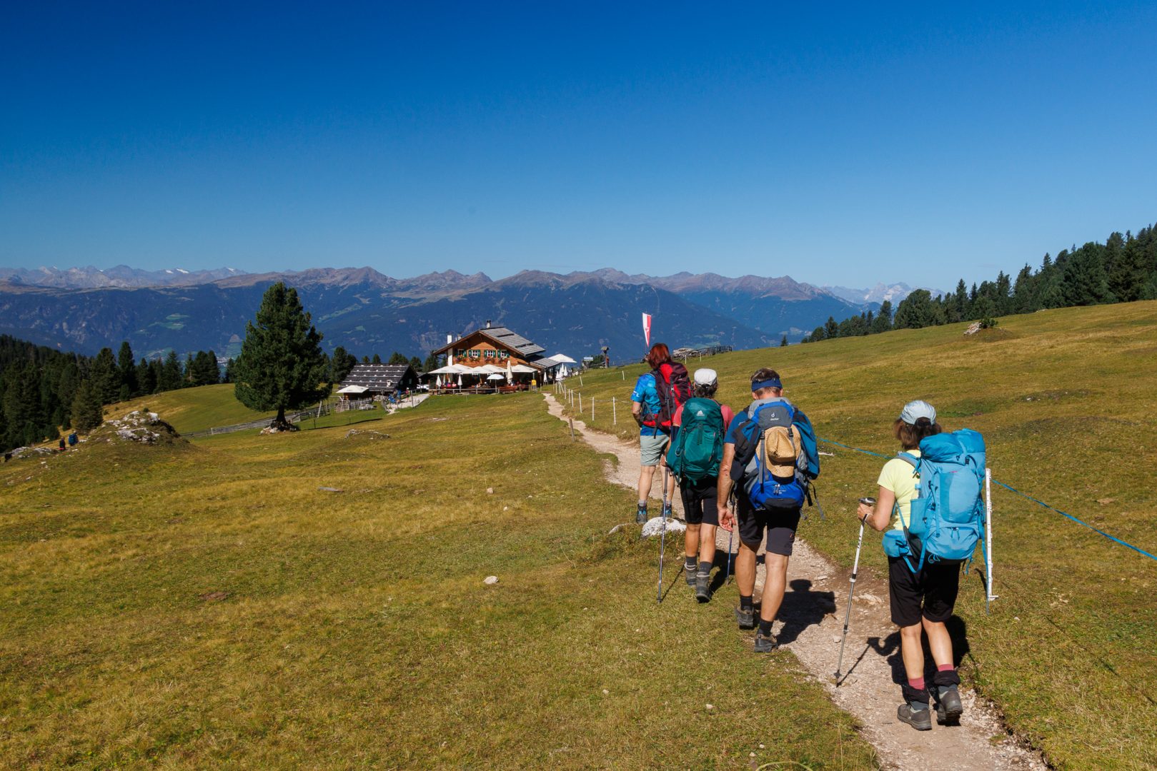 Ca. 1 Stunde später geht‘s auf einem wunderschönen Panoramaweg weiter zur urigen Hütte „Utia Vaciara“, wo wir auf der Sonnenterrasse Apfelstrudel und Südtiroler Bretteljause genießen und sich die umliegenden Berge der Dolomiten im schönsten Licht präsentieren.