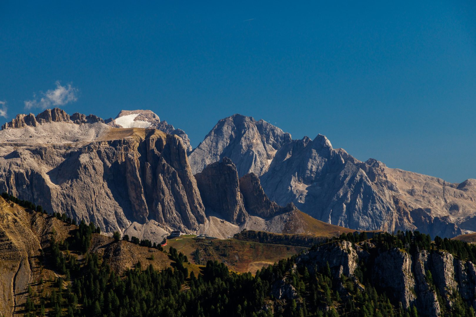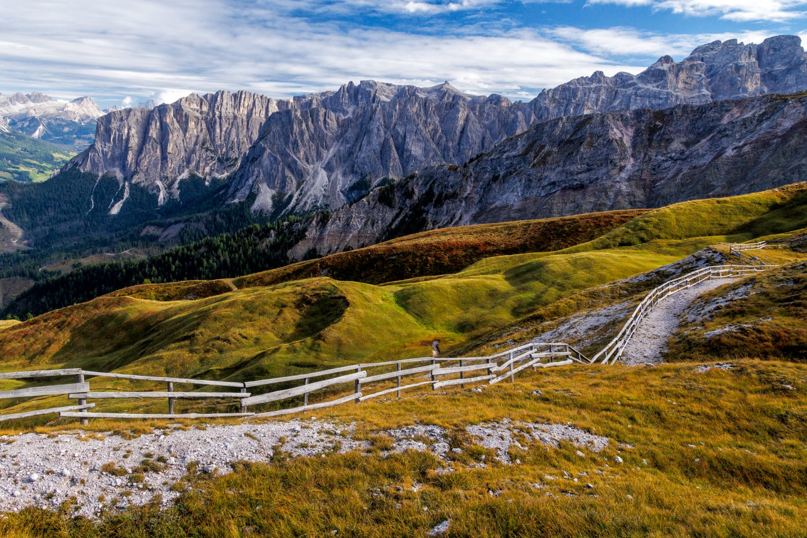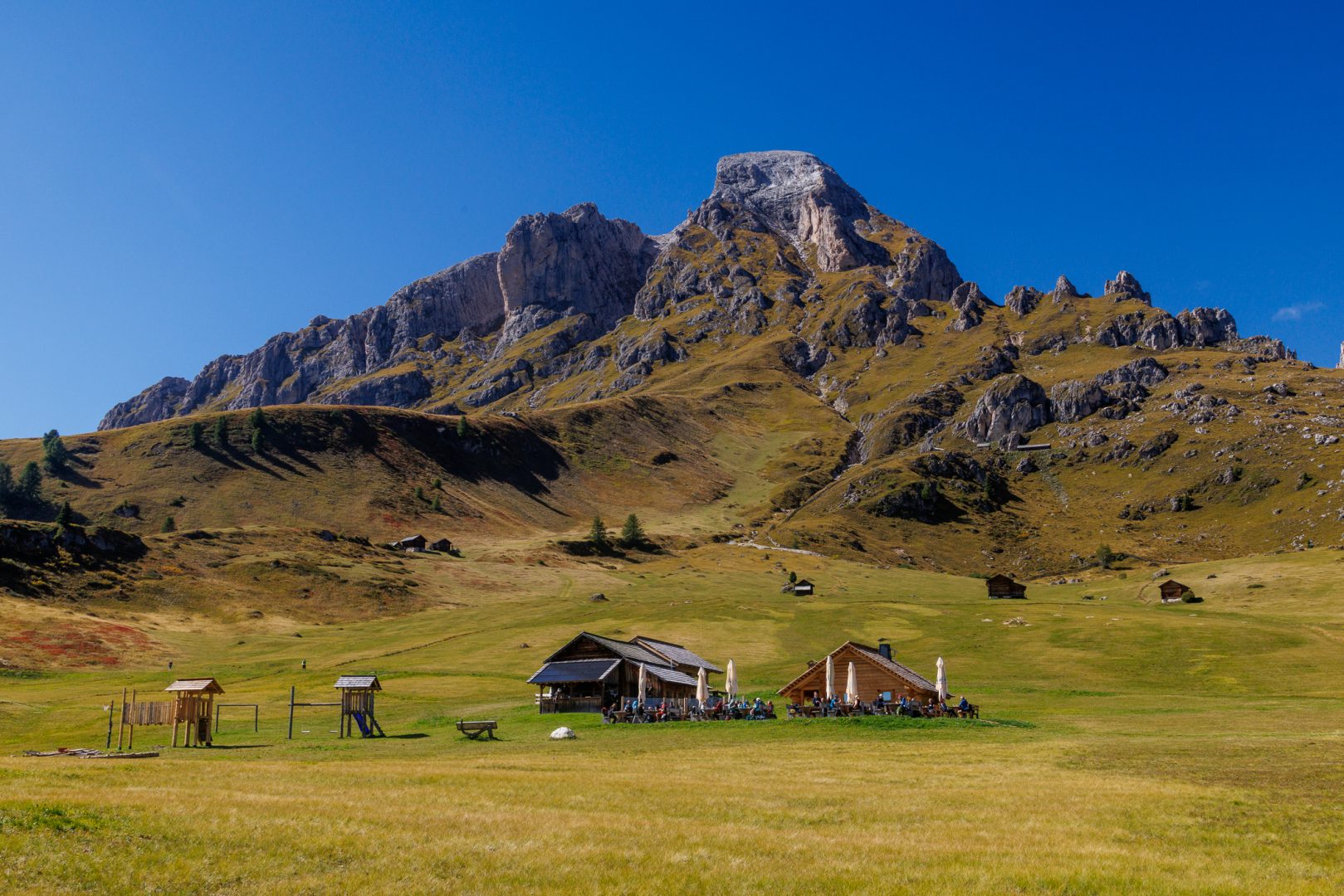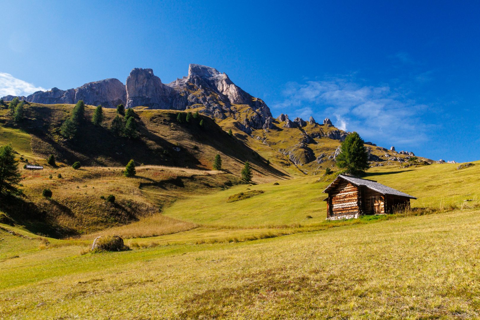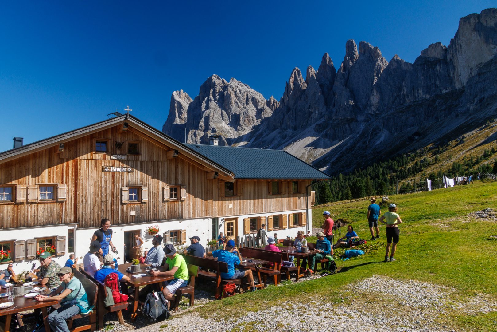 Ca. 1 Stunde später geht‘s auf einem wunderschönen Panoramaweg weiter zur urigen Hütte „Utia Vaciara“, wo wir auf der Sonnenterrasse Apfelstrudel und Südtiroler Bretteljause genießen und sich die umliegenden Berge der Dolomiten im schönsten Licht präsentieren.