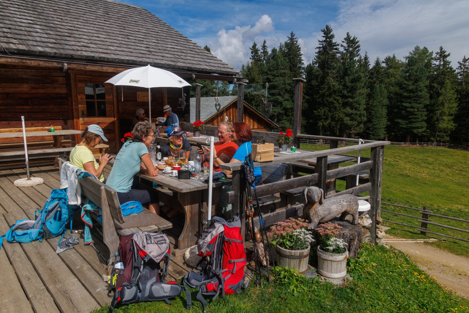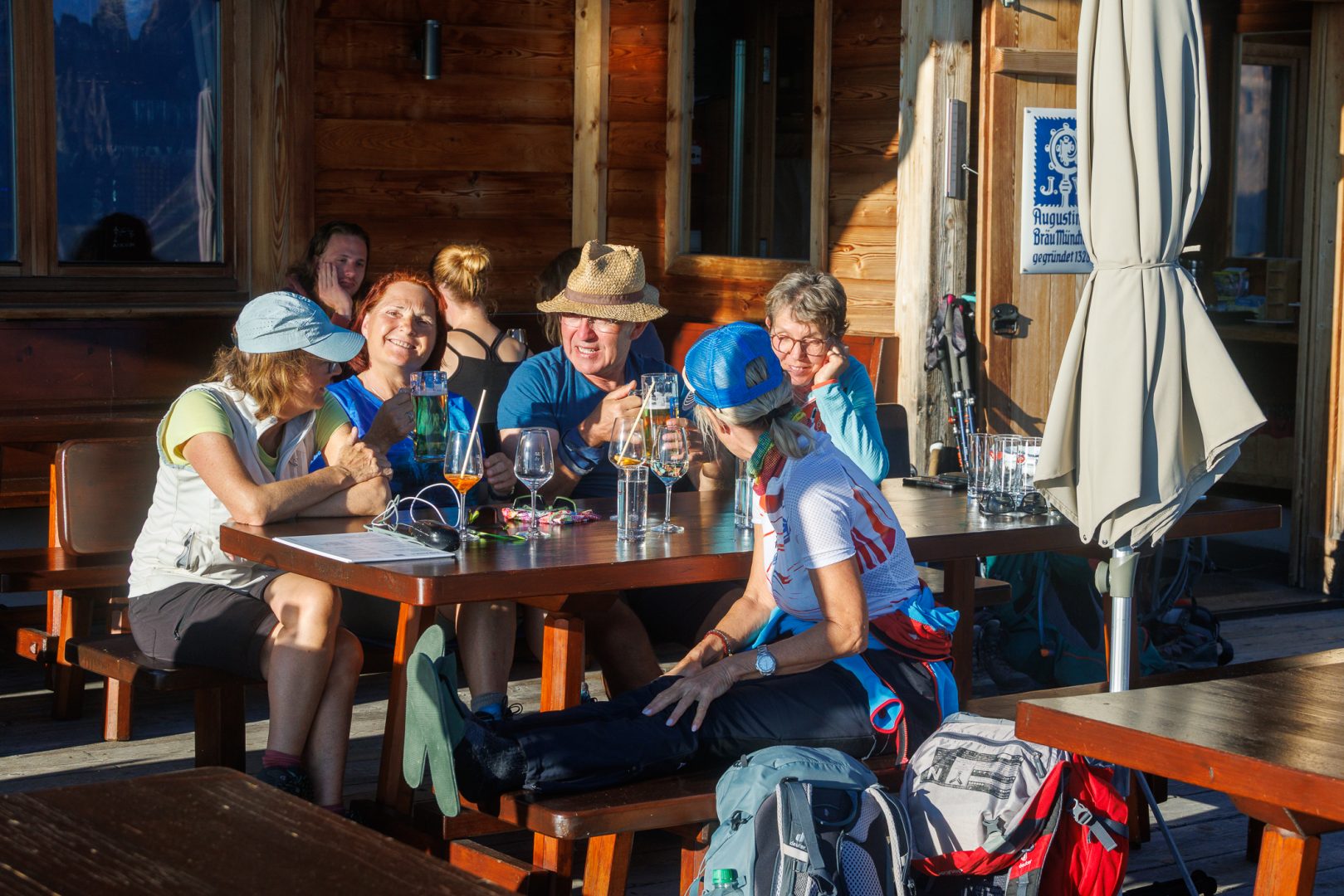 Die notwendige Stärkung holen sich die Wanderbegeisterten in der Welschellener Alm, auf ladinisch Munt da Rina. Eine herausragende Bewirtung mit überaus freundlichem Service. Den „Erdingern“ fällt der Abschied schon schwer (auch wenn es dort kein „Erdinger“ gab).