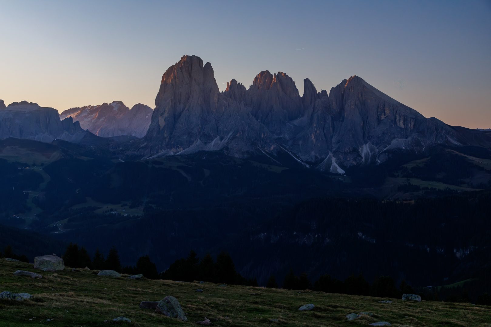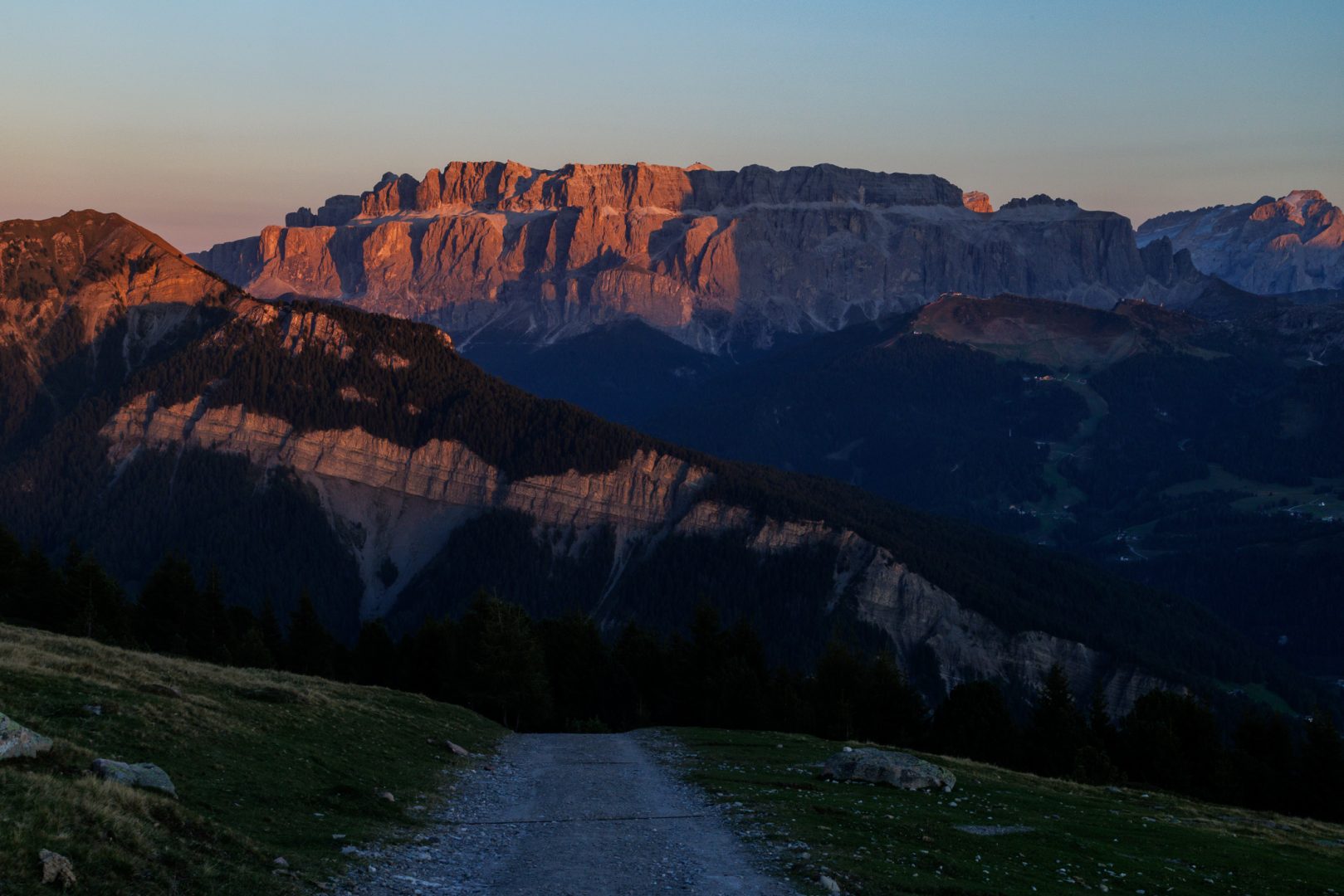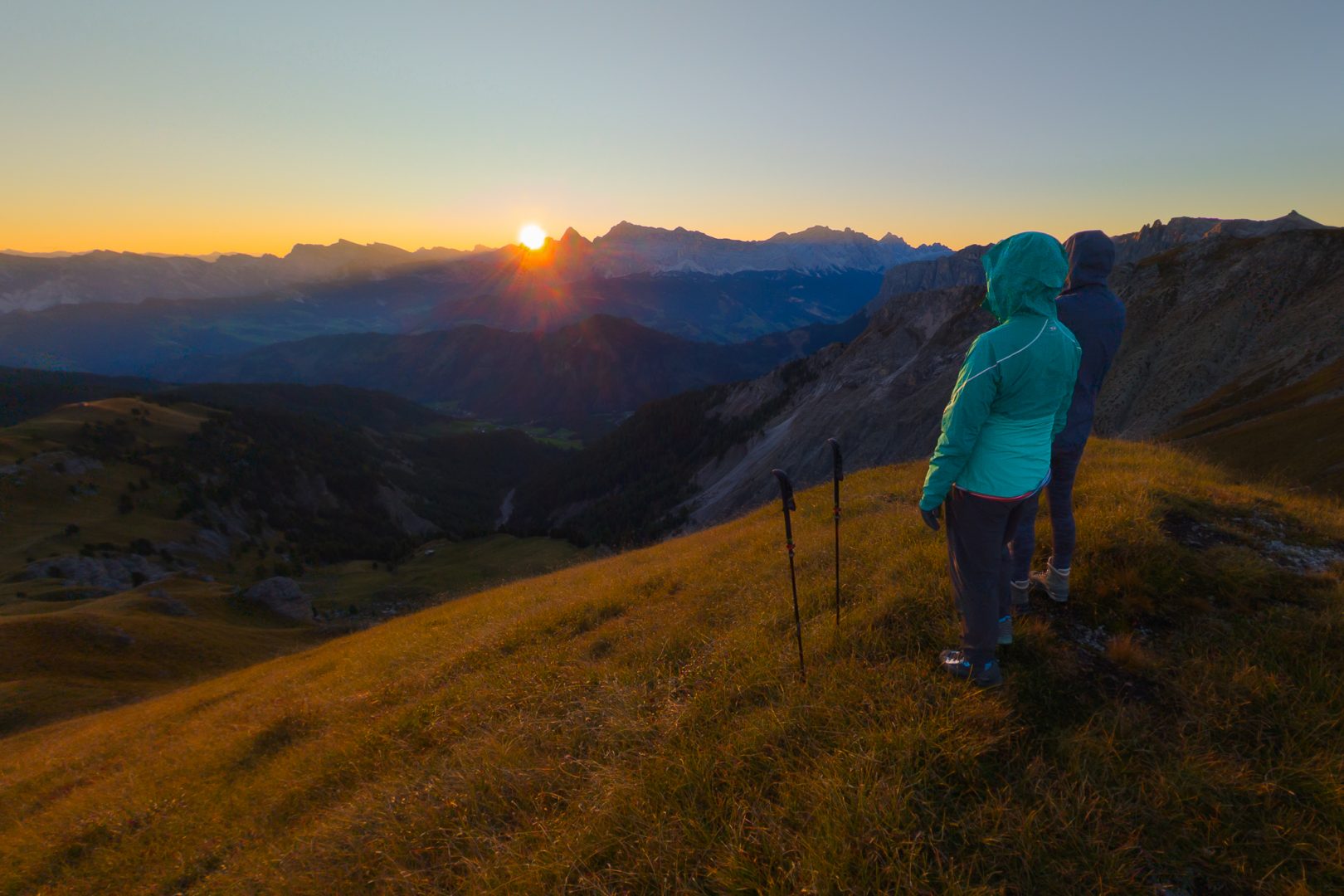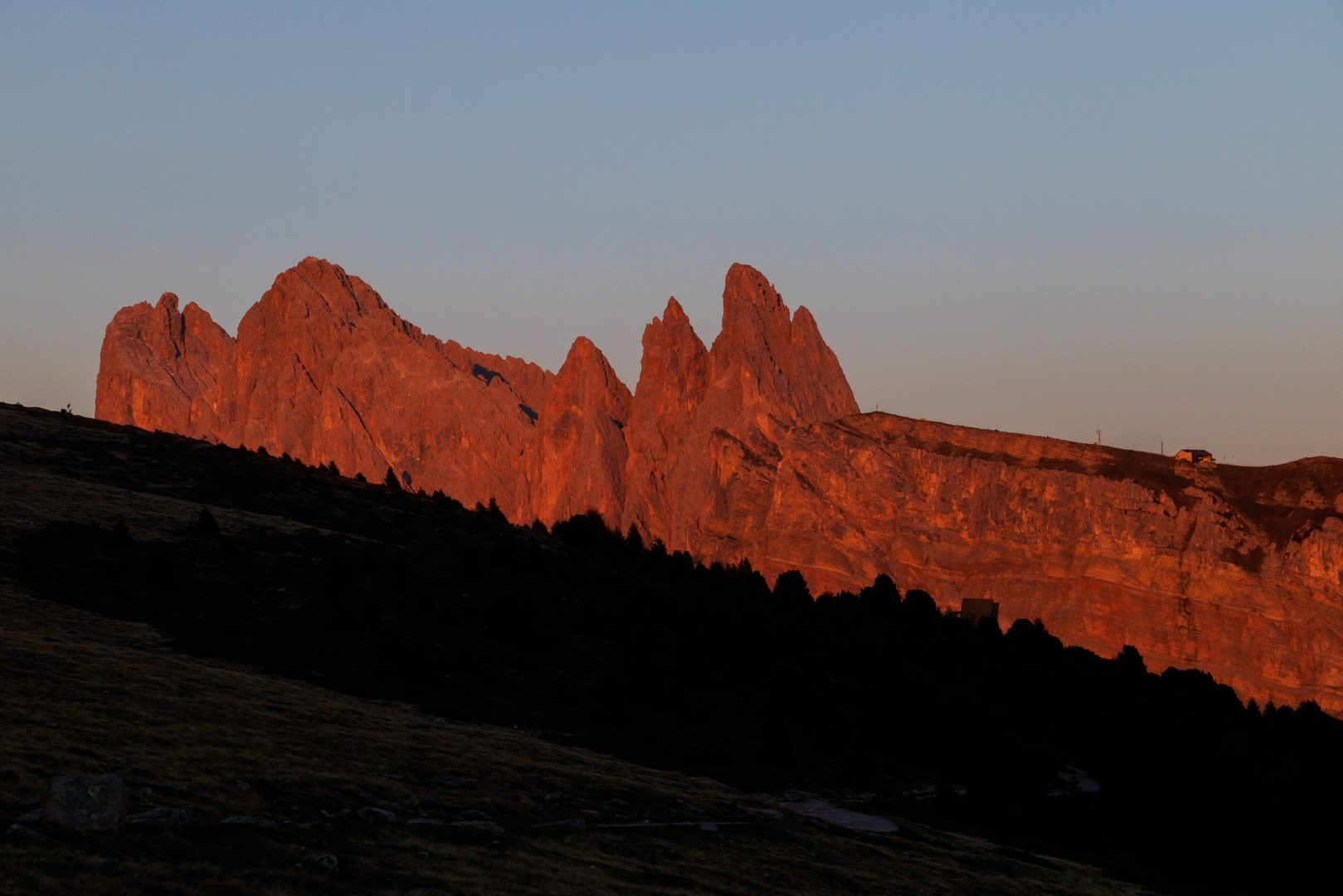 Und nicht schlechter beginnt der Tag mit einem leuchtenden Sonnenaufgang am Rosengarten und der Langkofelgruppe.