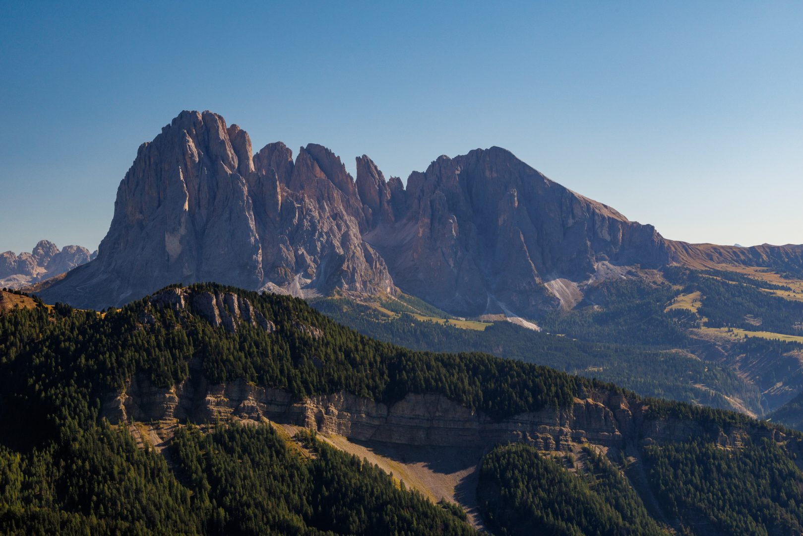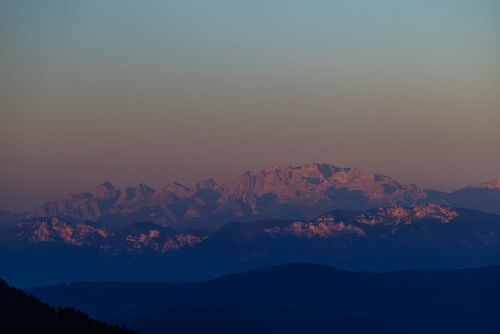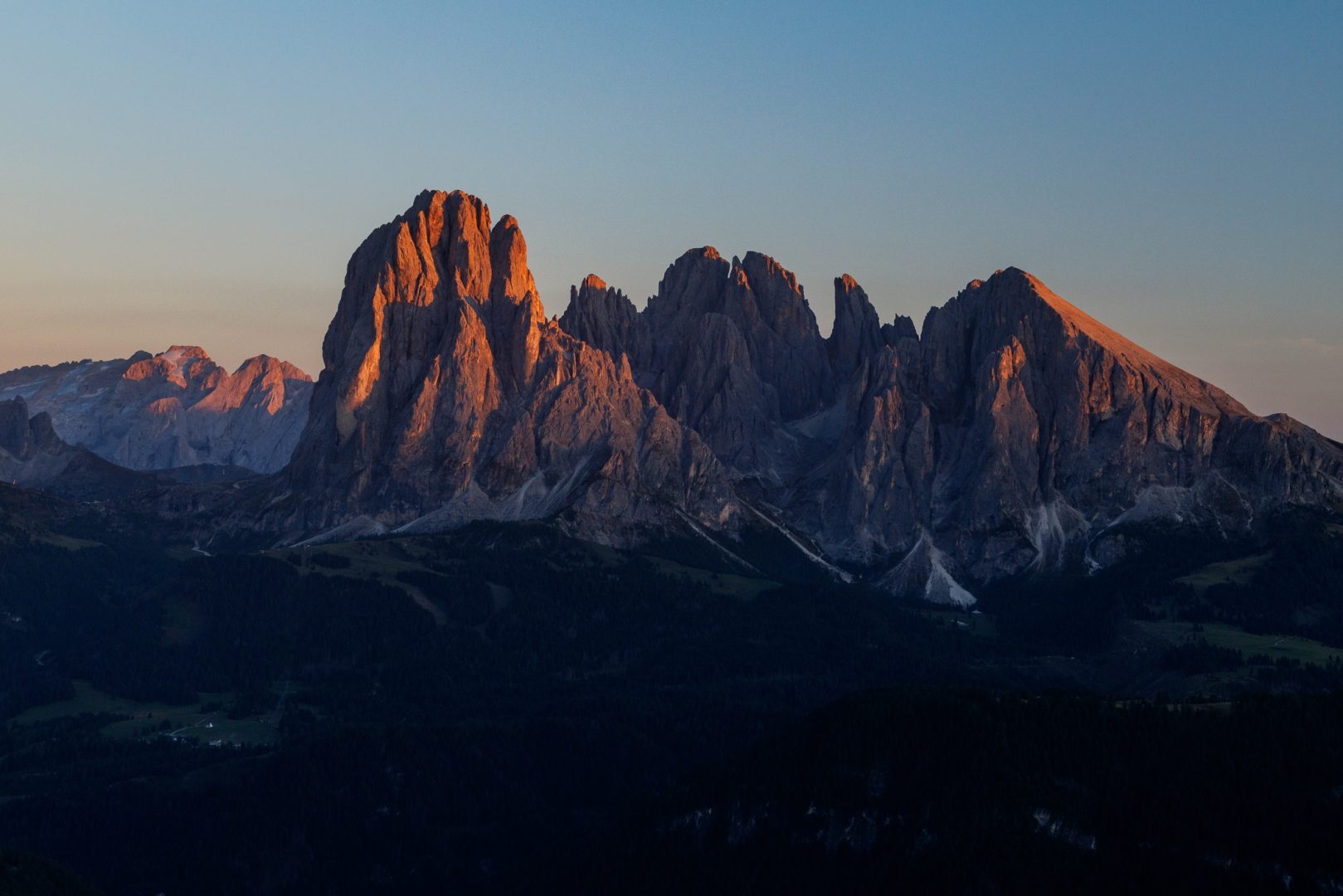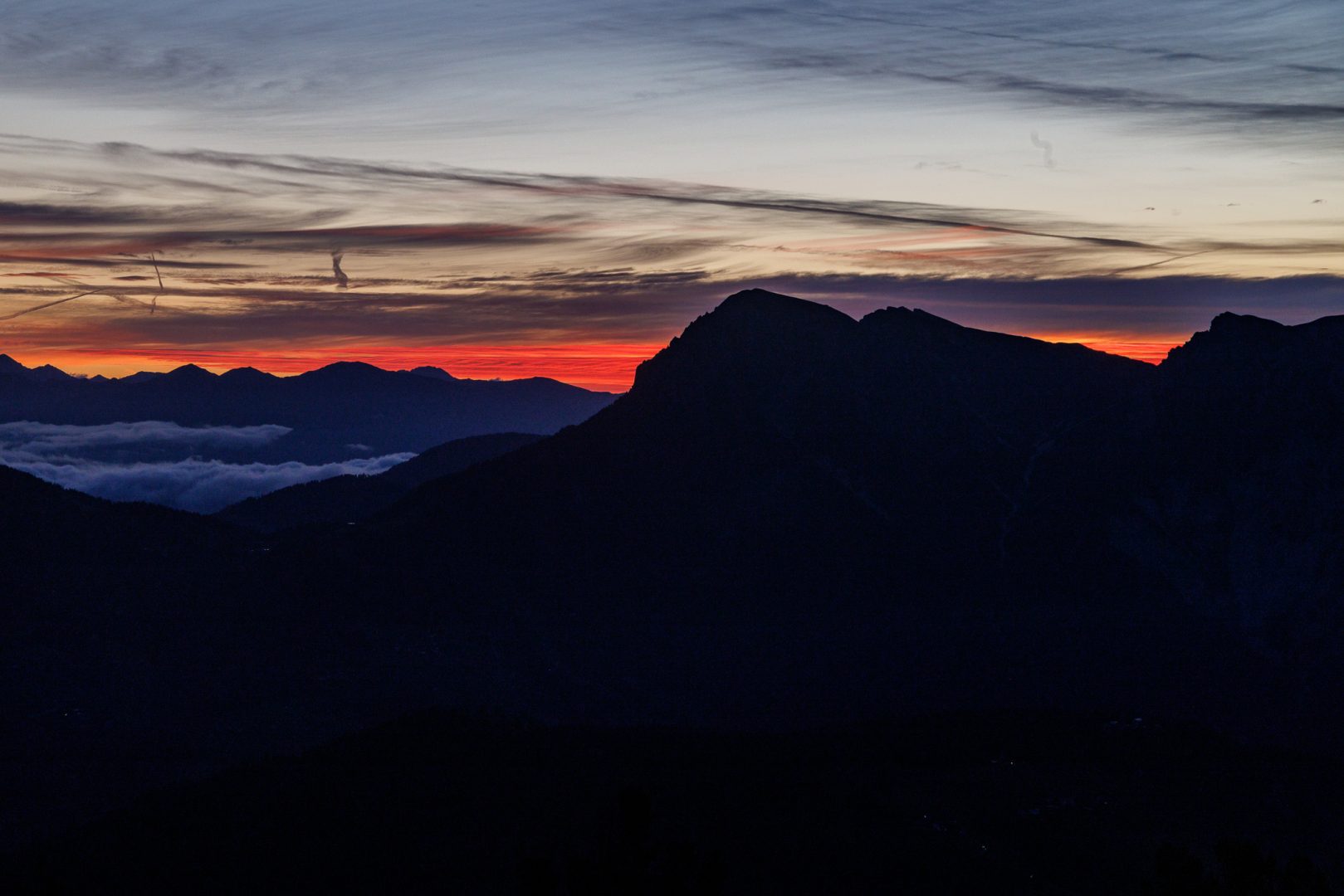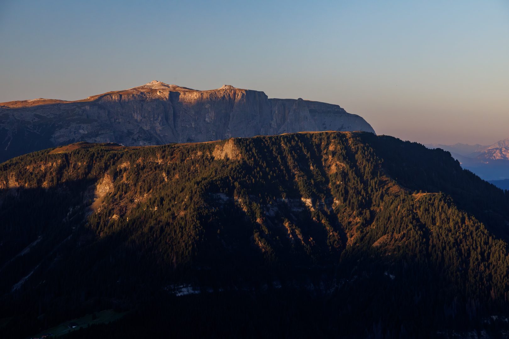 Und nicht schlechter beginnt der Tag mit einem leuchtenden Sonnenaufgang am Rosengarten und der Langkofelgruppe.