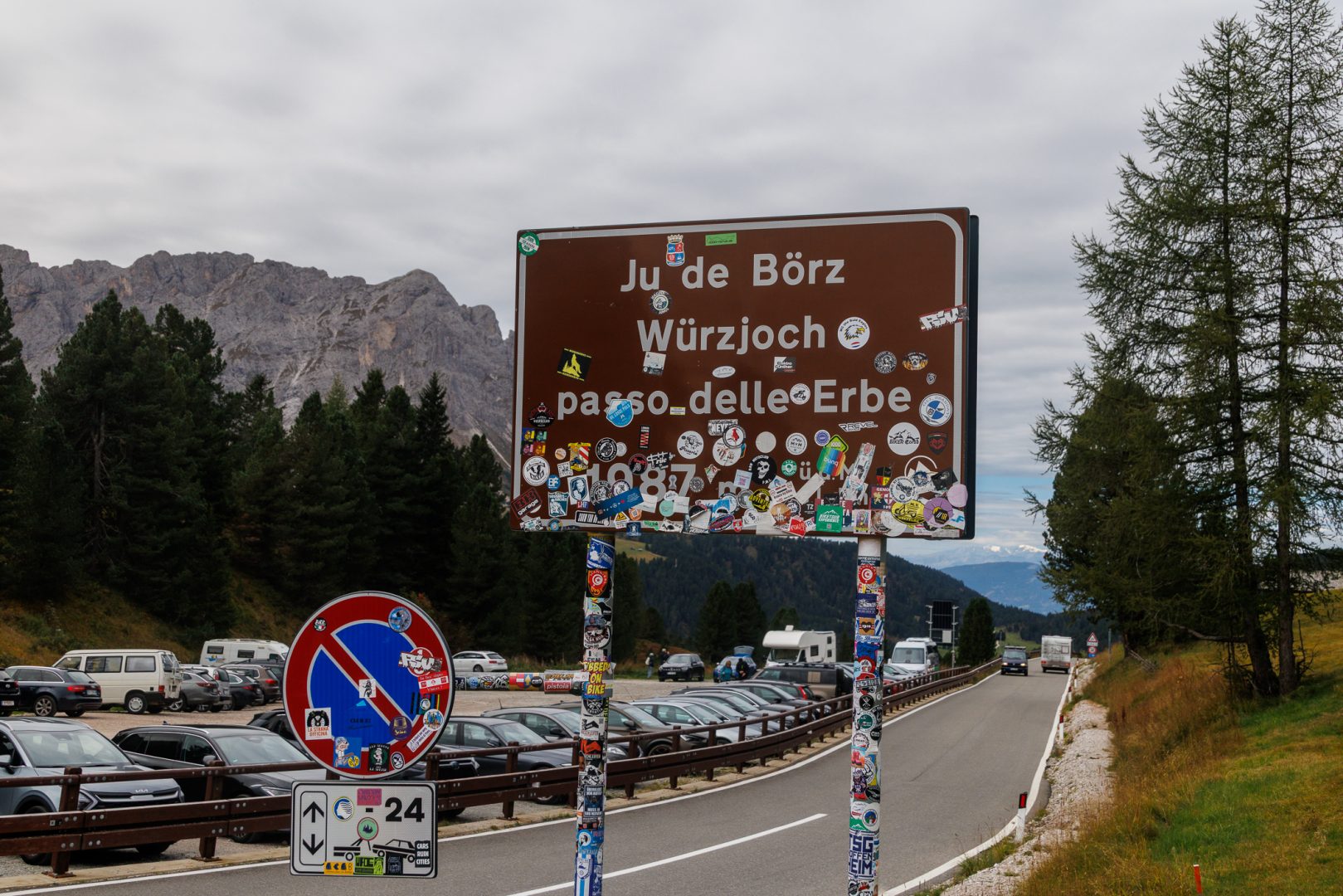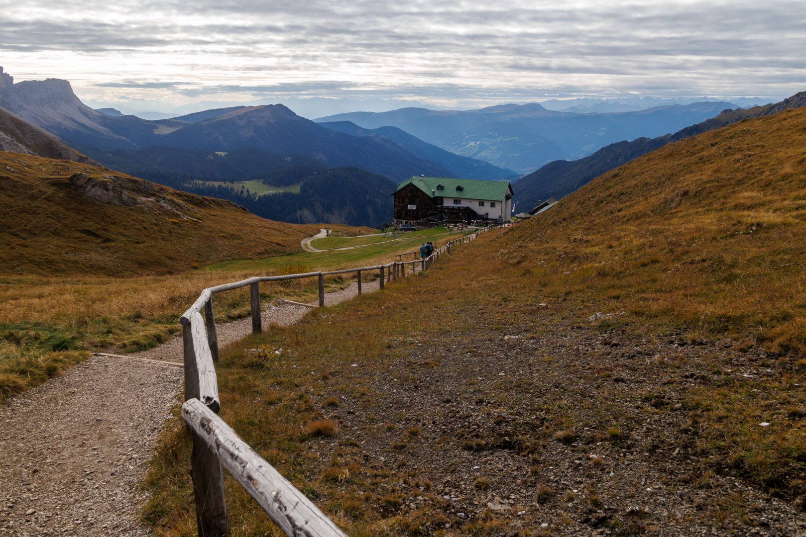 Der Weg führt uns auf einem Waldweg zunächst stetig bergab bis zu einer Infotafel. Dann beeindruckte uns der Blick auf die Würzjoch-Hütte vor dem majestätischen Peitlerkofel!