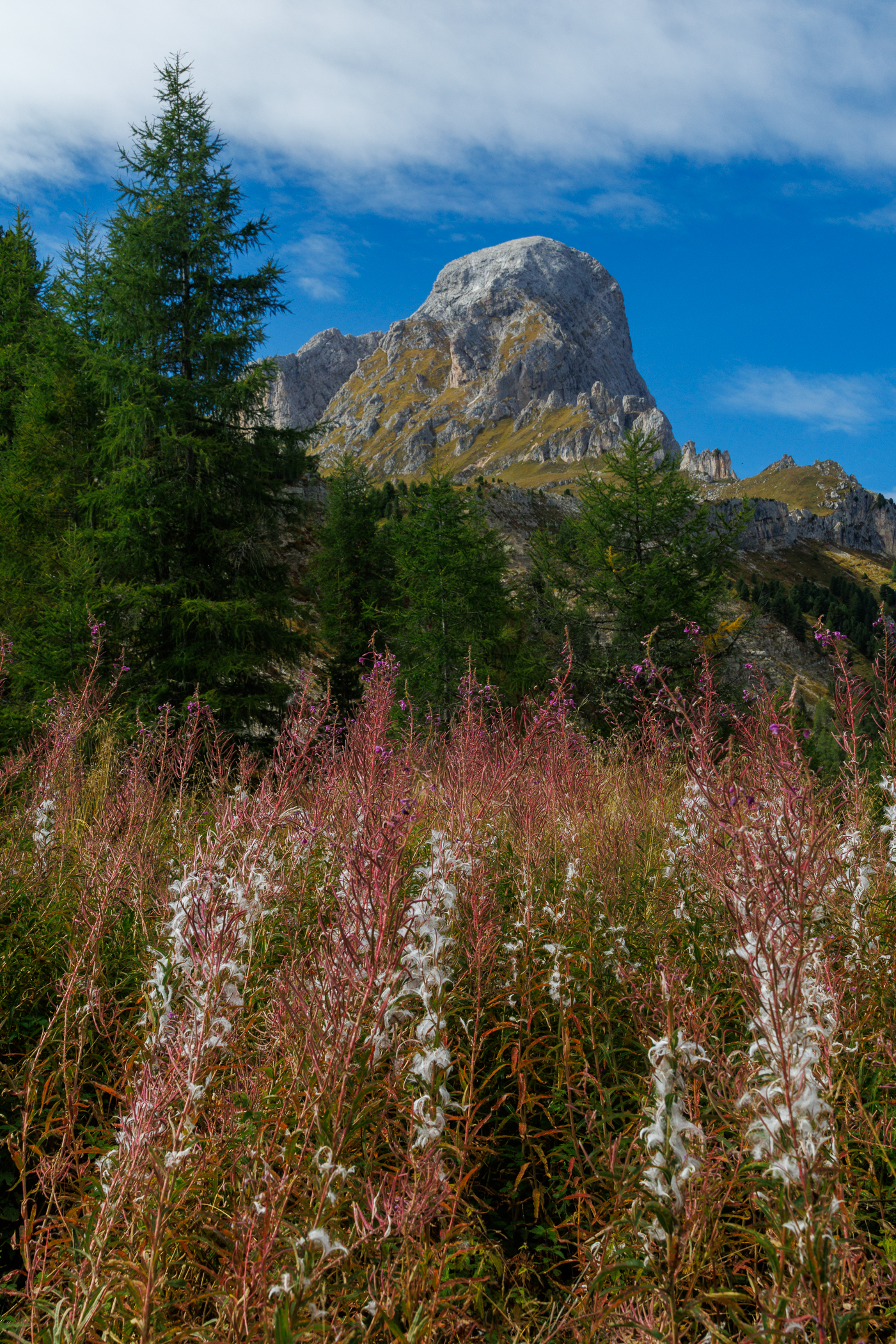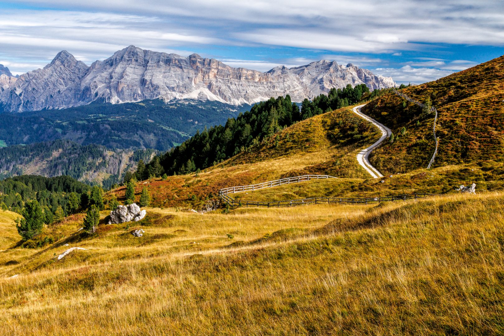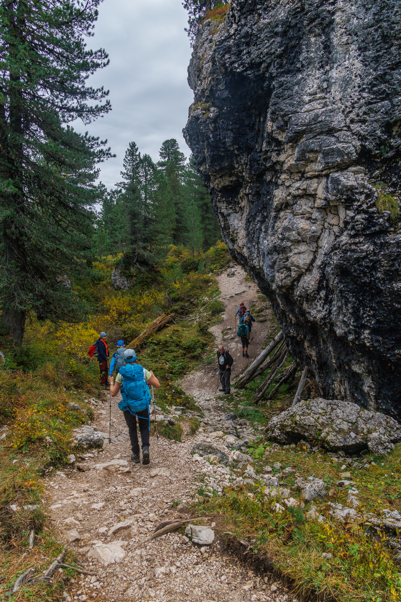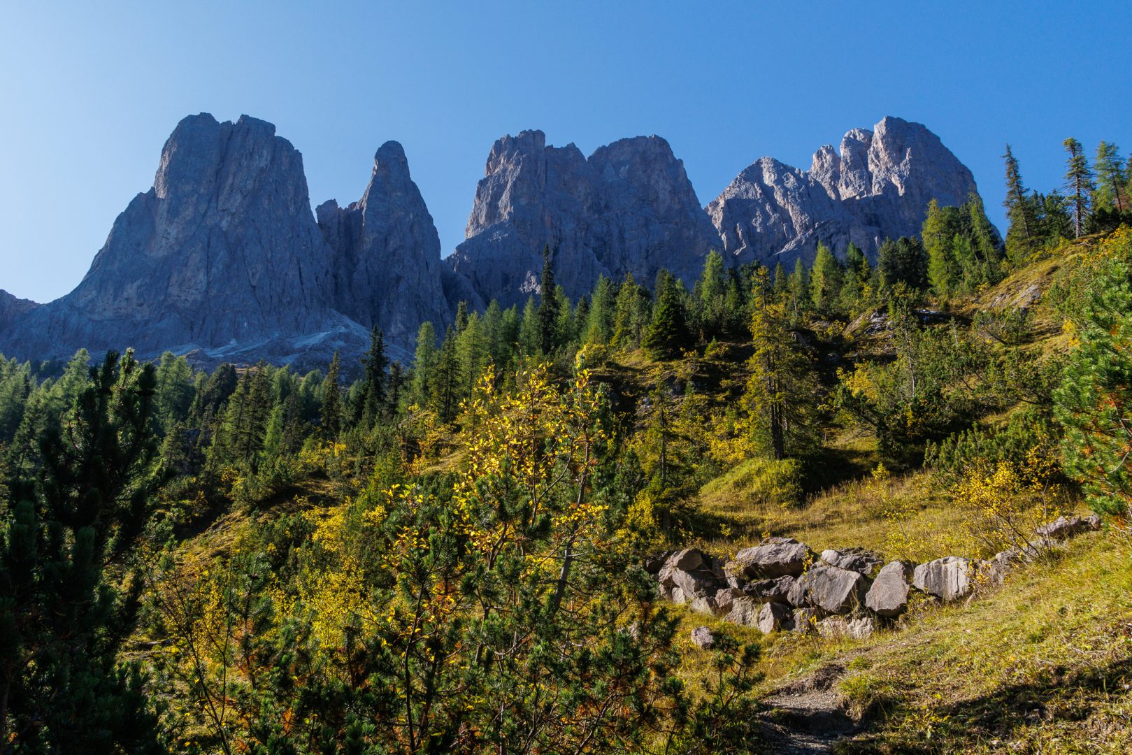 Plötzlich überrascht uns ein ebener, schmaler Wanderweg, gesäumt von großen beeindruckenden Felsen, herbstlich gelb gefärbter Vegetation und fantastischen Blicken hoch zum Gipfel des Peitlerkofels, der jetzt zum Greifen nahe scheint.