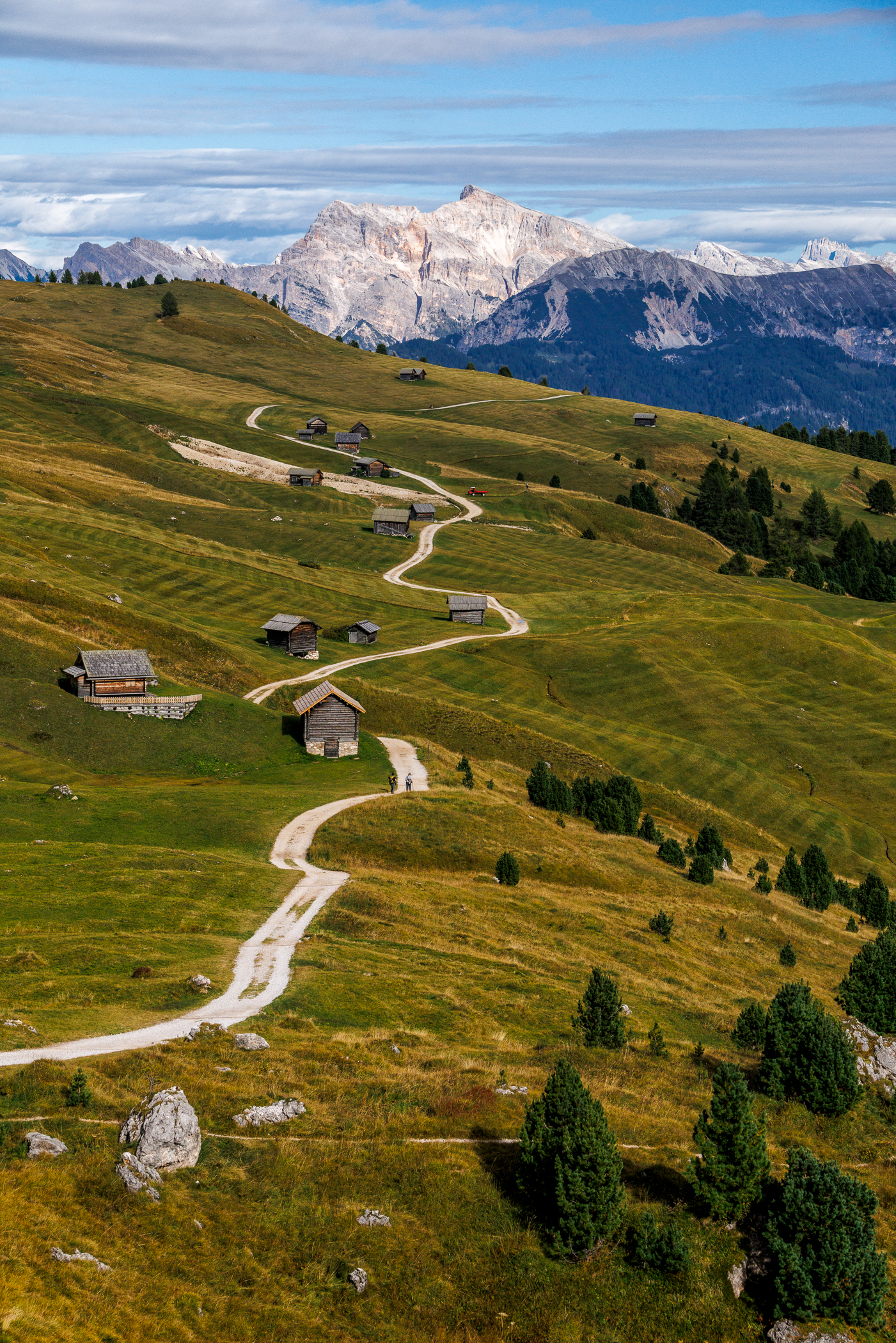 Stetig bergauf, immer den bizarren Felsformationen des Peitlerkofels ganz nahe, mit tollen Blicken auf weit entfernte Schneegipfel, eine Almwiese mit sich liebkosenden schottischen Hochland-Rindern und einer kleinen urigen Hütte.