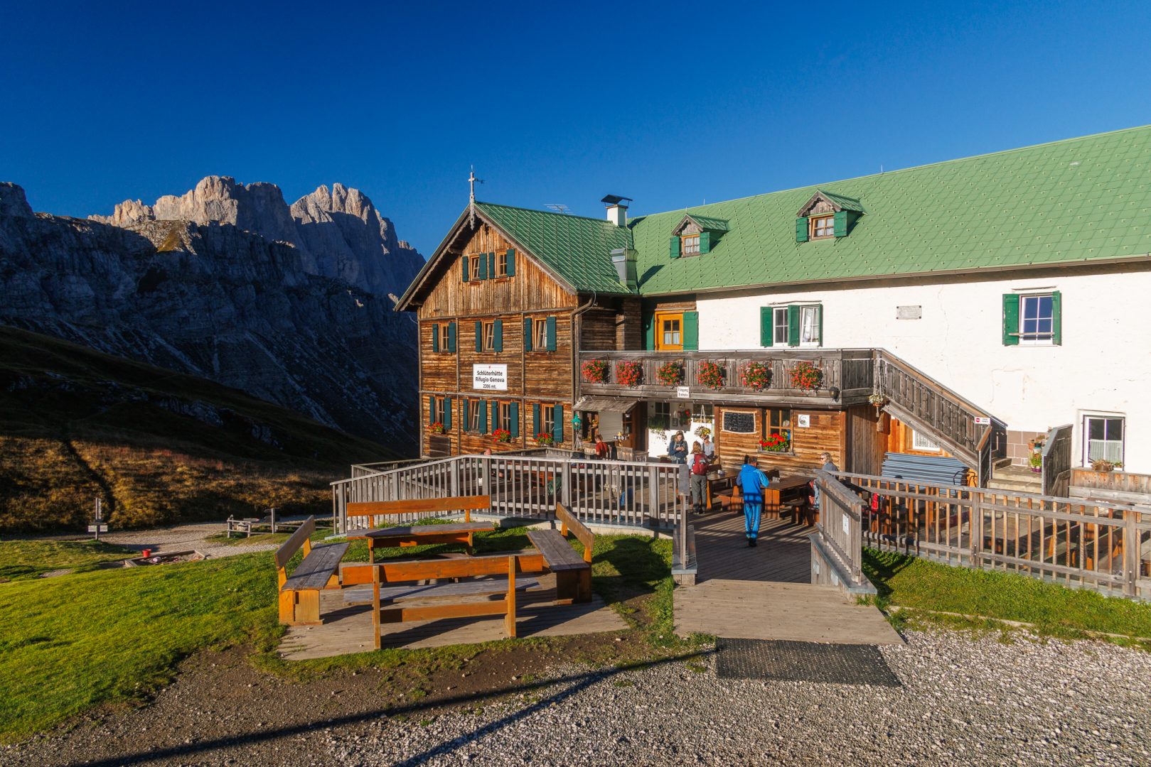 Bei starkem Wind und aufziehender Bewölkung erreichen wir gegen 17 Uhr unser Übernachtungsquartier, die landschaftlich schön gelegene Schlüterhütte, geschmückt mit leuchtend roten Geranien.