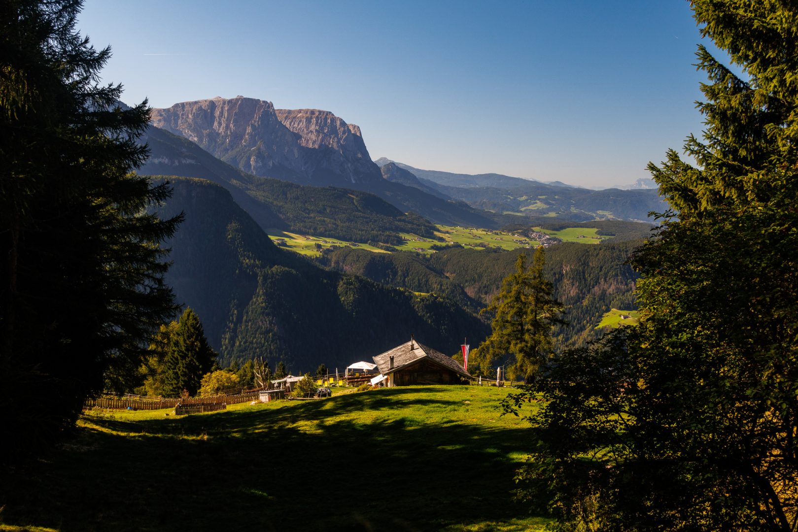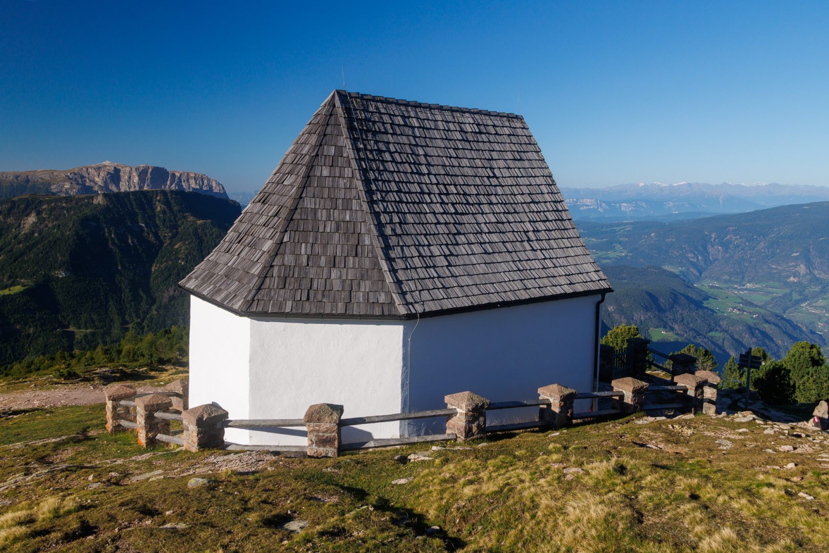 Wir steigen nach dem Frühstück bis zur Christ-Kapelle mit Blick zum Schlern an der Außerraschötz kurz auf.
