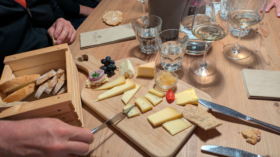 Am Abend erwartet uns ein tolles Abendessen, das Martha mit ihrem Küchenteam zubereitet hat. Bei einer Käseplatte und einer Flasche Lagrein geht der Tag zu Ende.
