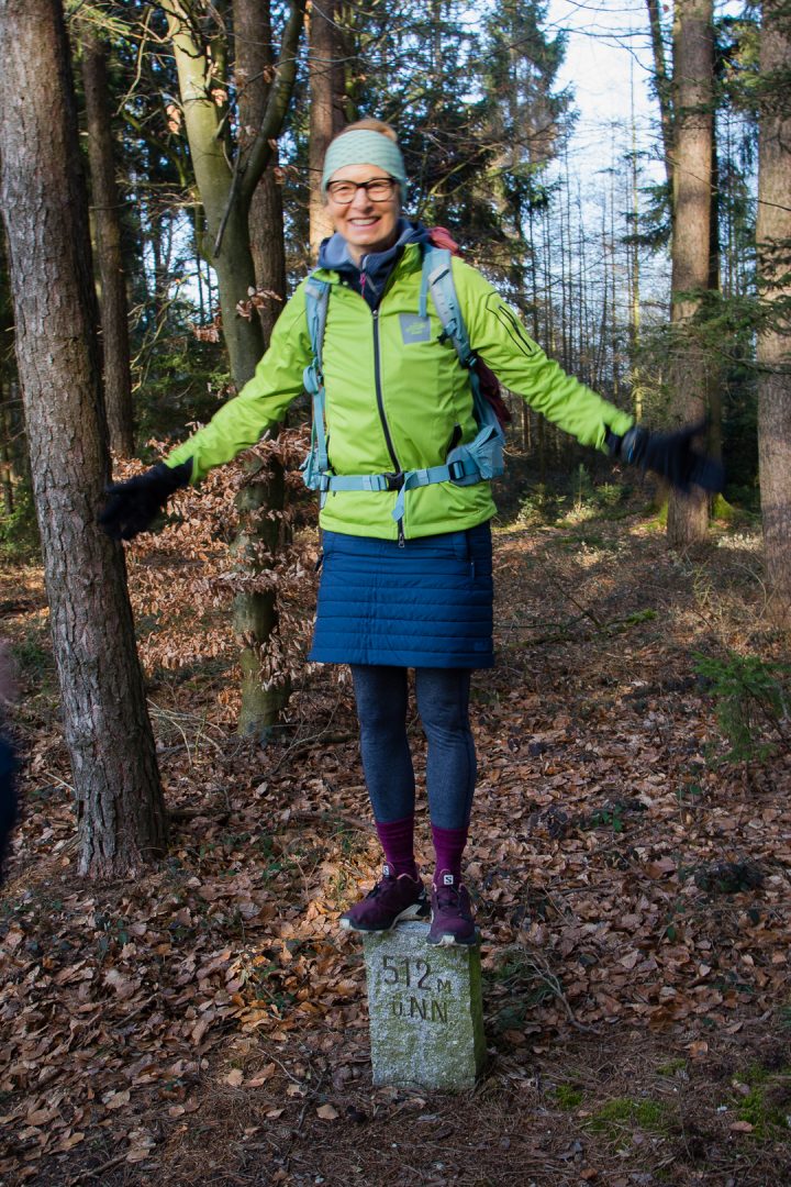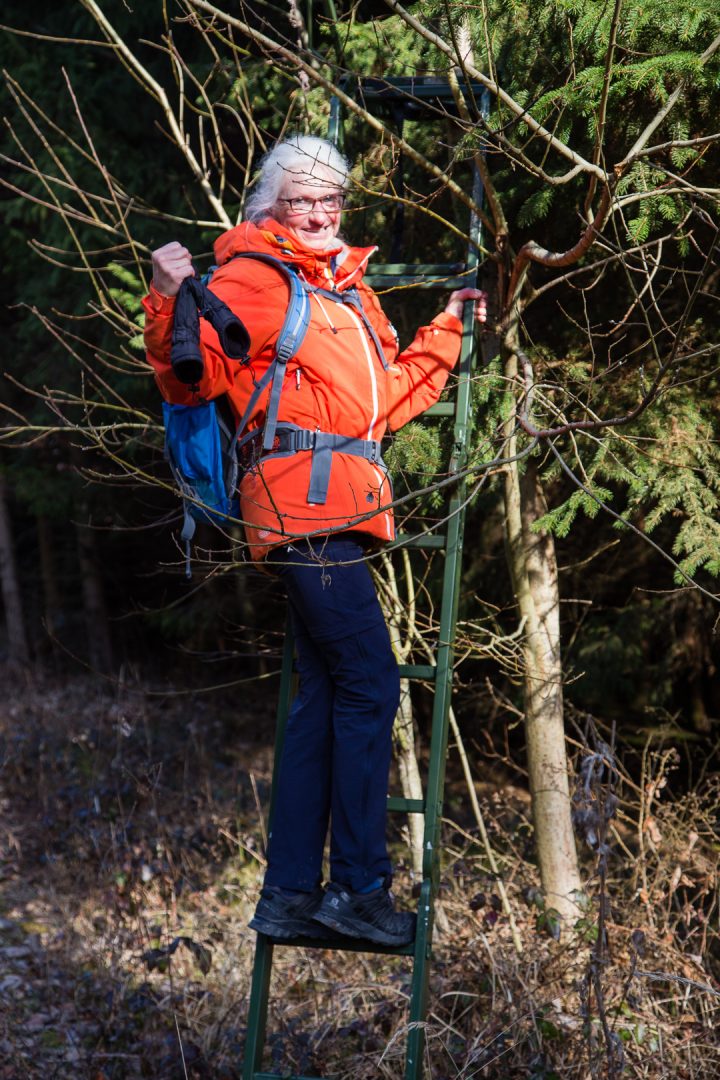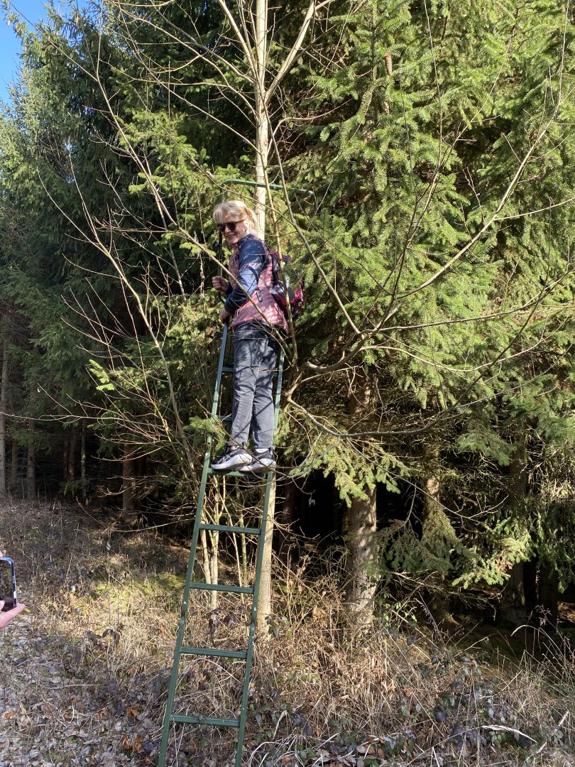 Bei diesem skurrilen Hochsitz mussten wir schmunzeln. Tragbarer Jägersitz to go? Die Mutigsten (Frauen natürlich) unter uns, trauten sich nach oben.