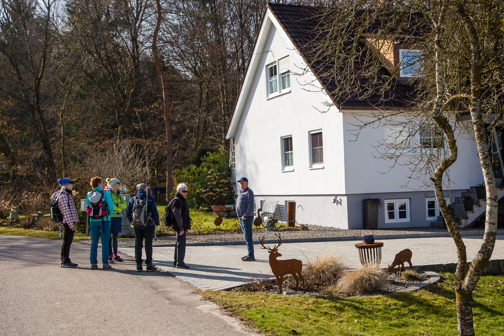 Hände in Handschuhen oder Hosentaschen vorbei an der Tierherberge in den Wald.