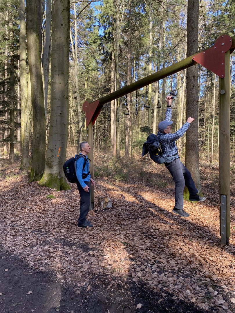 Oben im Wald spüren wir, dass wir der Zivilisation näherkommen. Ein Trimm-dich-Pfad motiviert zum Ausprobieren und Sportfachsimplen.