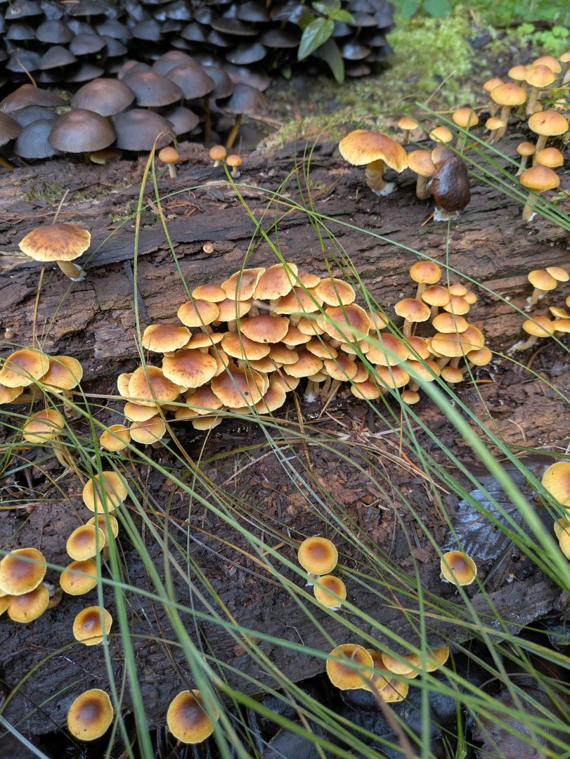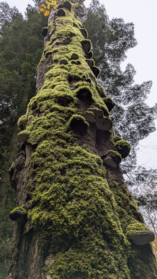Schließlich gelangten wir zu der Lichtung, wo sich die Sauschütt befindet. Das Wirtshaus hatte nicht offen, aber das war eingeplant. Gut so, dann hatten wir mehr Zeit zum Schauen, denn überall stehen und liegen abgestorbene Bäume voller Pilze, genau das Richtige für uns.