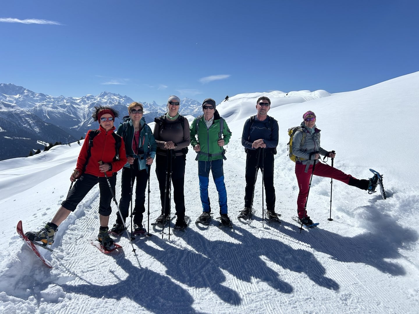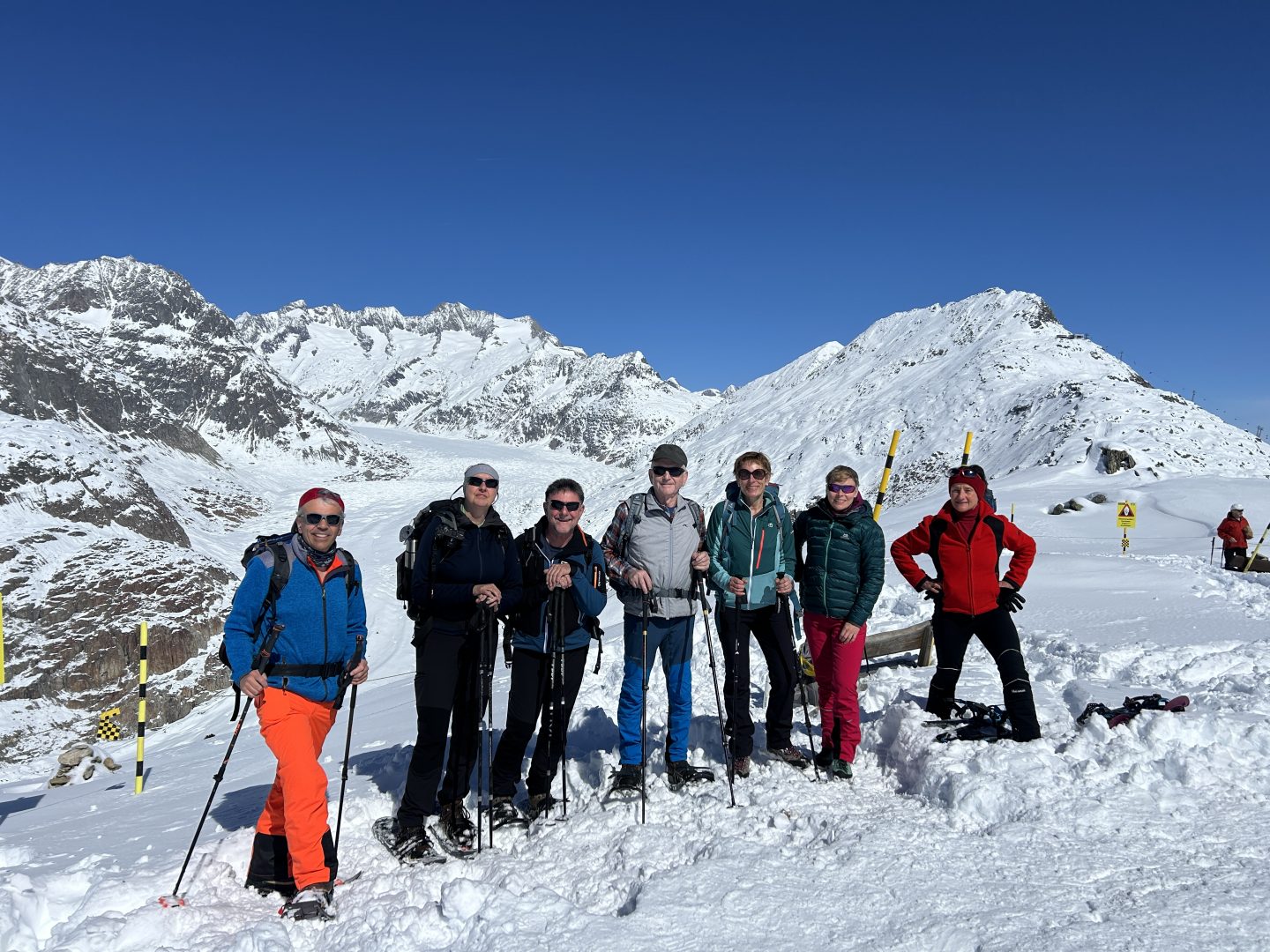 …so kann man die Viertagestour zusammenfassen. Am Mittwoch kamen die Teilnehmerinnen und Teilnehmer mit einer halben Verspätung mit der Bahn in Mörel im Wallis um 13:33 Uhr an und Rainer holte sie am Bahnhof ab. Direkt ging es mit der Seilbahn hinauf auf die Riederalp (1.920 m). Nach Beziehen der zwei Ferienwohnungen bei Familie Kummer im Sonnenhof startete bei Sonne und gutem und viel Schnee die erste Schneeschuhtour hinauf zur Riederfurka. Nach einer Kaffee- oder Bierpause ging es wieder zurück nach Riederalp.