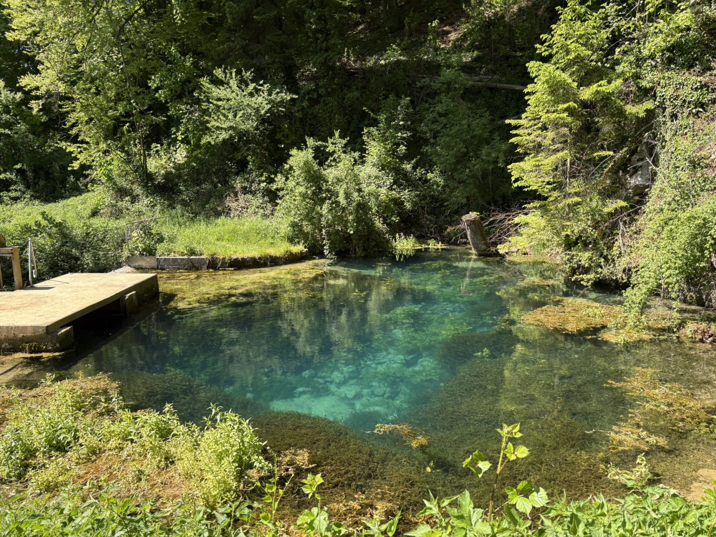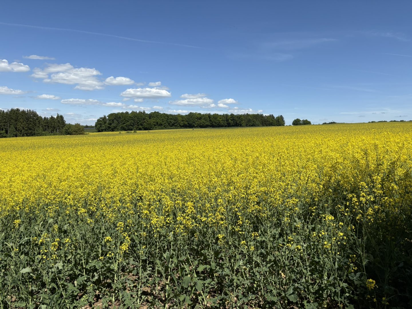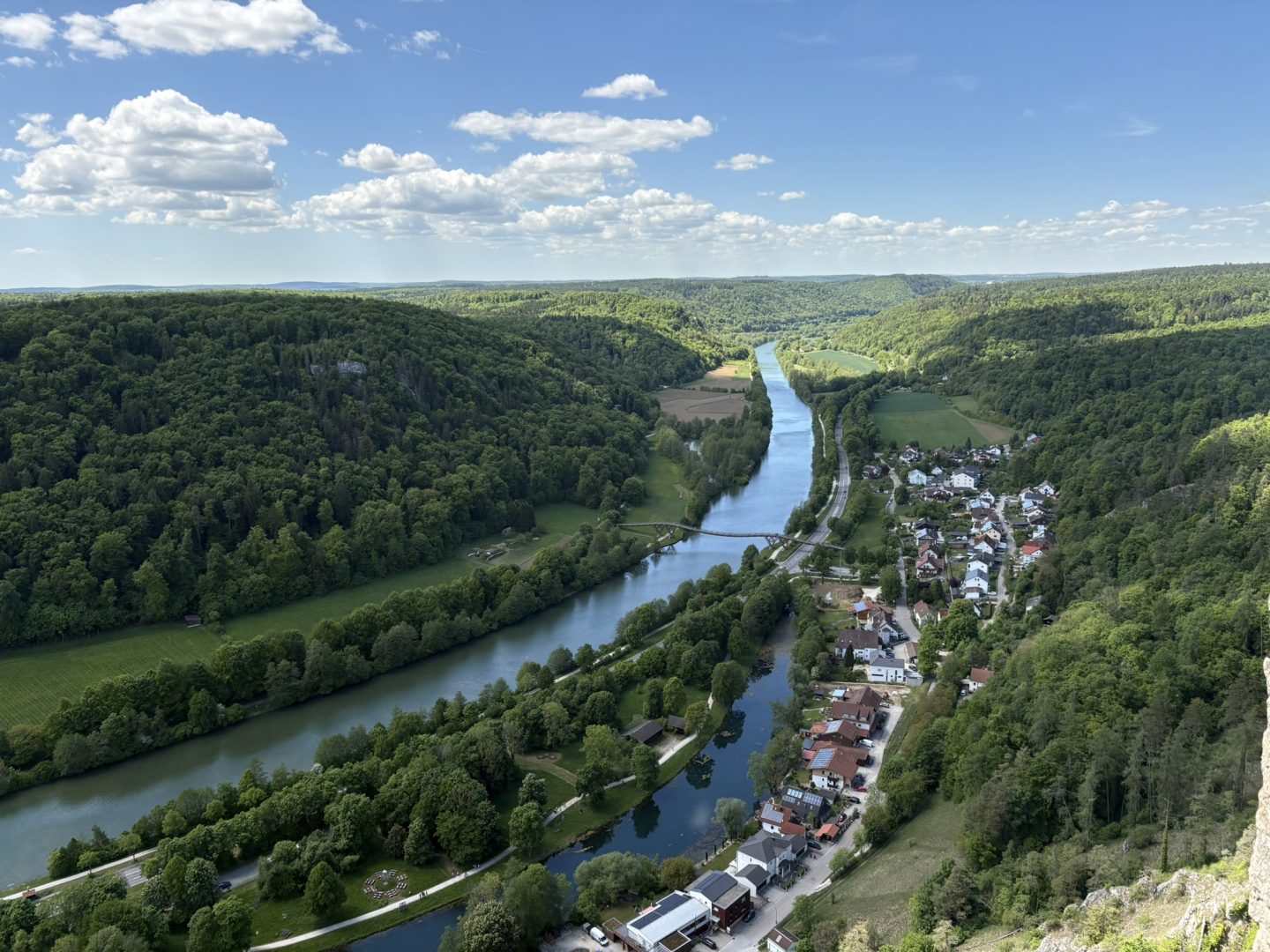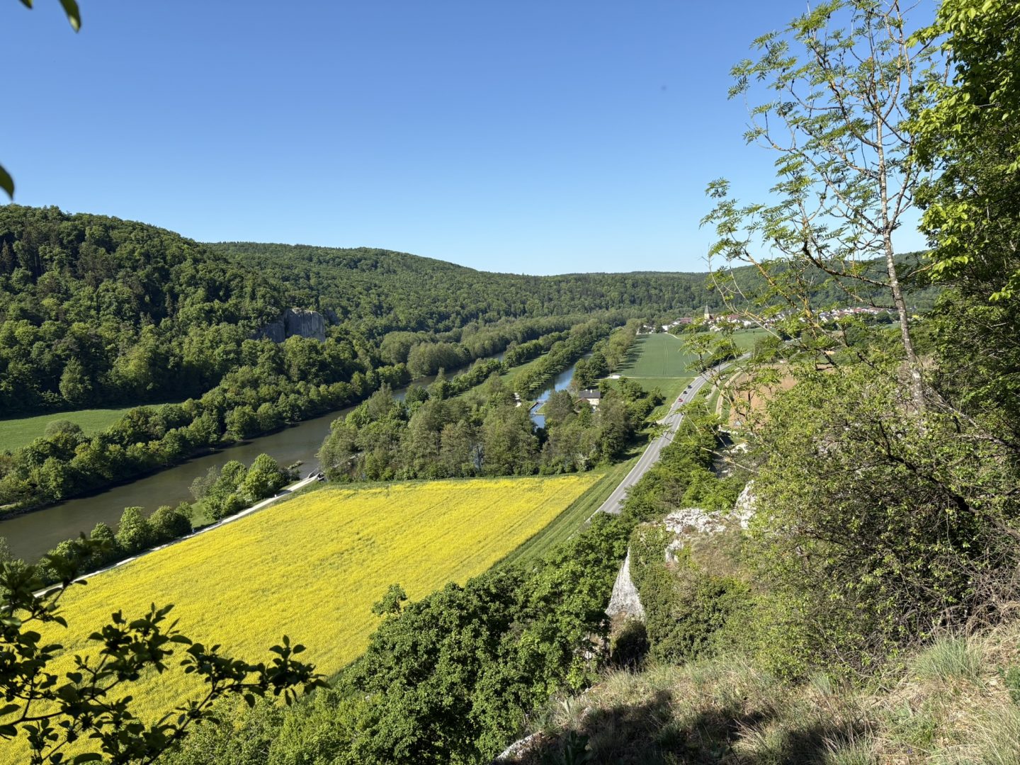 Ein paar Meter weiter erreichten wir mit 514 Metern unseren höchsten Punkt. Zwar war es kein Gipfel, sondern der Turm der sehr schönen und beeindruckenden Burgruine Randeck, doch die fantastische Aussicht war nicht minder schön. Nun ging es oberhalb der Altmühl zunächst entlang blühender Wiesen und zahlreicher Rapsfelder. Nach einer Weile erreichten wir einen kleinen, eher unscheinbaren Pfad und standen auf den freien Jurafelsen hoch über Essing. Nochmals eine beeindruckende Aussicht die wir hier sichtlich genossen hatten. Anschließend folgten wir dem weiteren Weg hinunter nach Essing. Dort sprang uns der idyllisch smaragdgrüne Blautopf in Augenschein. Der Ursprung ist ähnlich dem weit bekannteren auf der Schwäbischen Alb.
