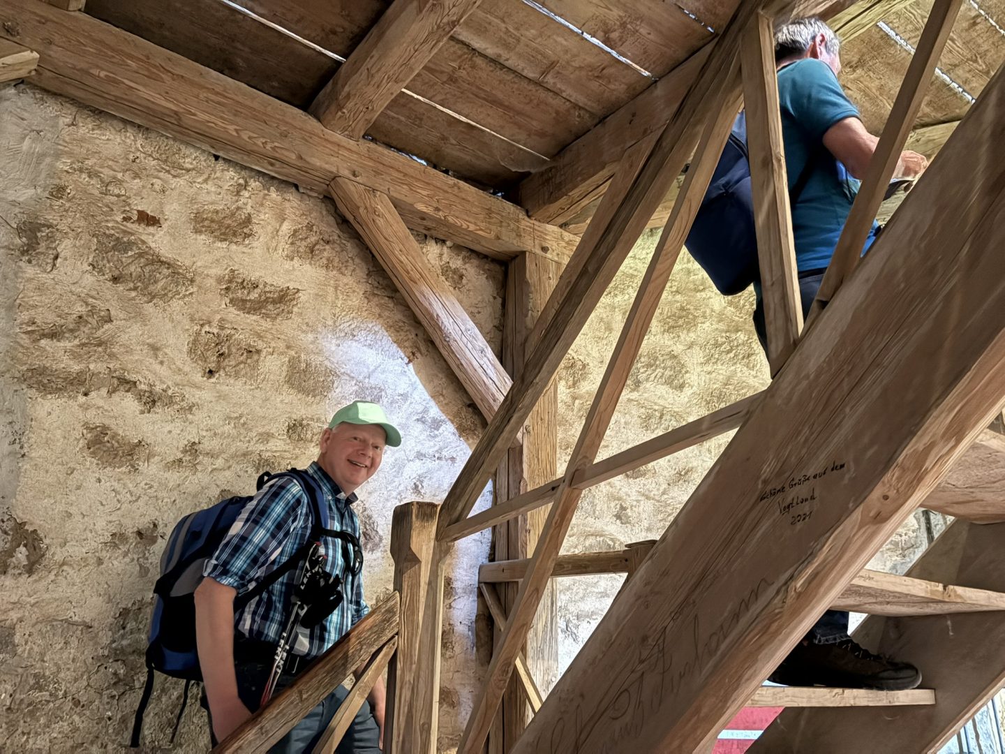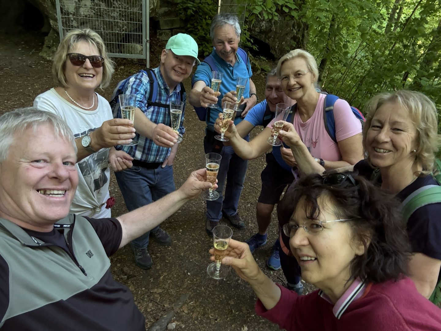 Als wir unser Ziel am Schullerloch erreicht hatten, gab es zur Überraschung einiger Teilnehmer zunächst Kaffee und Kuchen. Gestärkt und mit guter Laune ging es sogleich die ersten Meter stetig steil hinauf. Schon der erste Blick zwischen den Bäumen hinab ins Altmühltal ließ erahnen, welch fantastischer Tag uns bevorstand. Dort angekommen wurden wir am Eingang der Tropfsteinhöhle freundlich von der ortsansässigen Führerin empfangen und schlossen uns der kleinen Gruppe an.