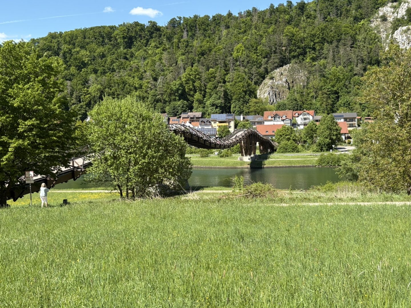 Nun überschritten wir den zwischen 1836 und 1846 erbauten und nach König Ludwig I. von Bayern benannten Ludwig-Donau-Main-Kanal. Diese 172 km lange Wasserstraße zwischen der Donau und dem Main als Teil einer schiffbaren Verbindung zwischen der Nordsee und dem Schwarzen Meer hatte man bereits zur Zeit des Fränkischen Reiches im Jahre 793 unter Karl der Große erstmals verwirklicht. Allerding wurde dieses Projekt einige Jahre nach Fertigstellung wieder aufgegeben, da es sich nicht durchsetzen konnte. Hierzu überschritten wir die mit knapp 190 Metern bis 2006 längste Holzbrücke Europas. Der „Tatzelwurm“ geht auf die geschwungene Form zurück und gab der Brücke ihren Namen.