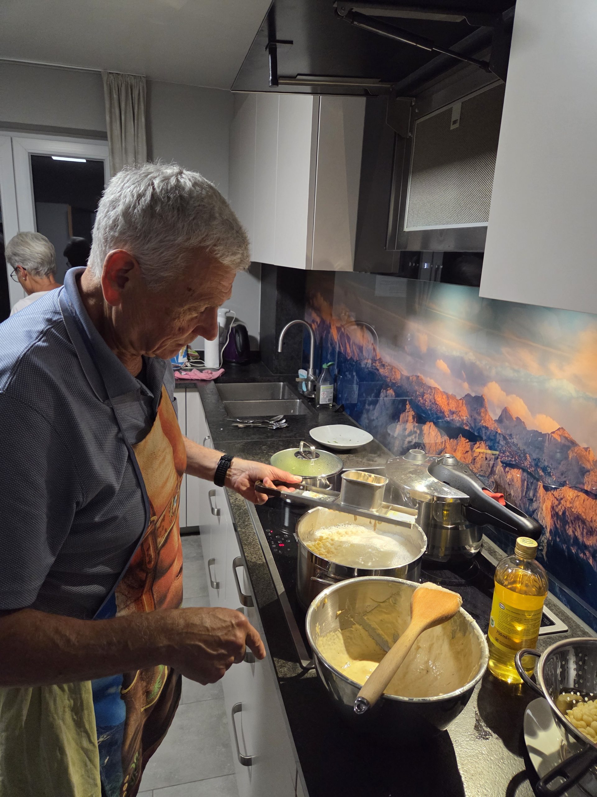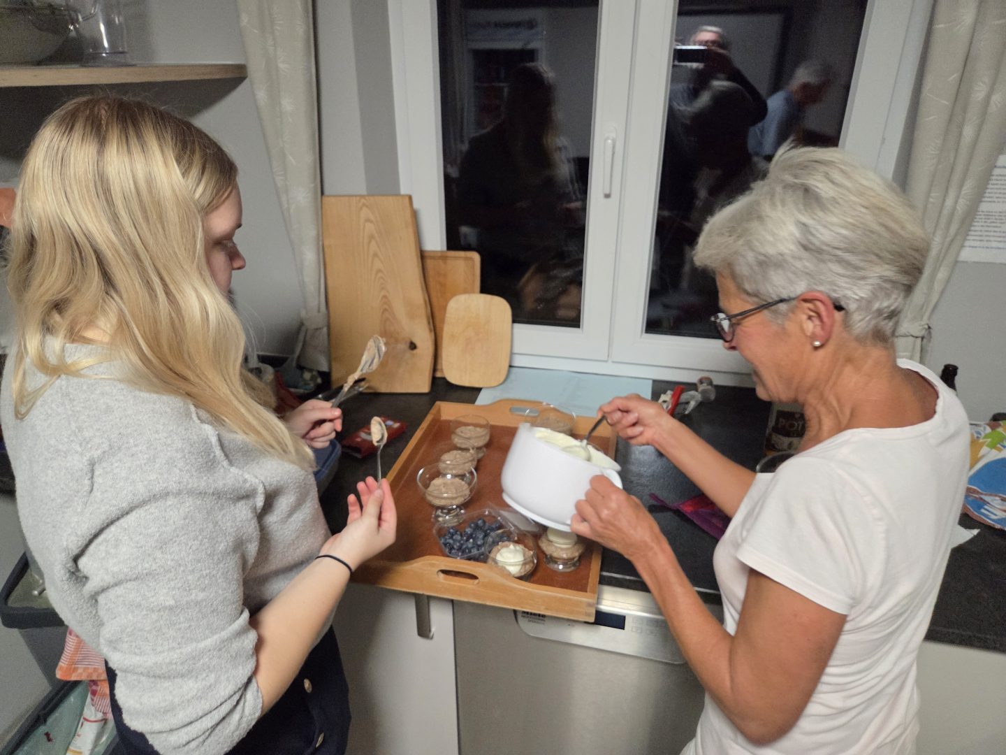 Anschließend wurden die Spätzle und der Rosenkohl zubereitet. Das Gulasch wurde noch mit Salz, Pfeffer, Preiselbeeren und Kuvertüre abgeschmeckt. Das Maronenmus wurde mit Rum und Eierlikör verfeinert und die Sahne untergehoben.