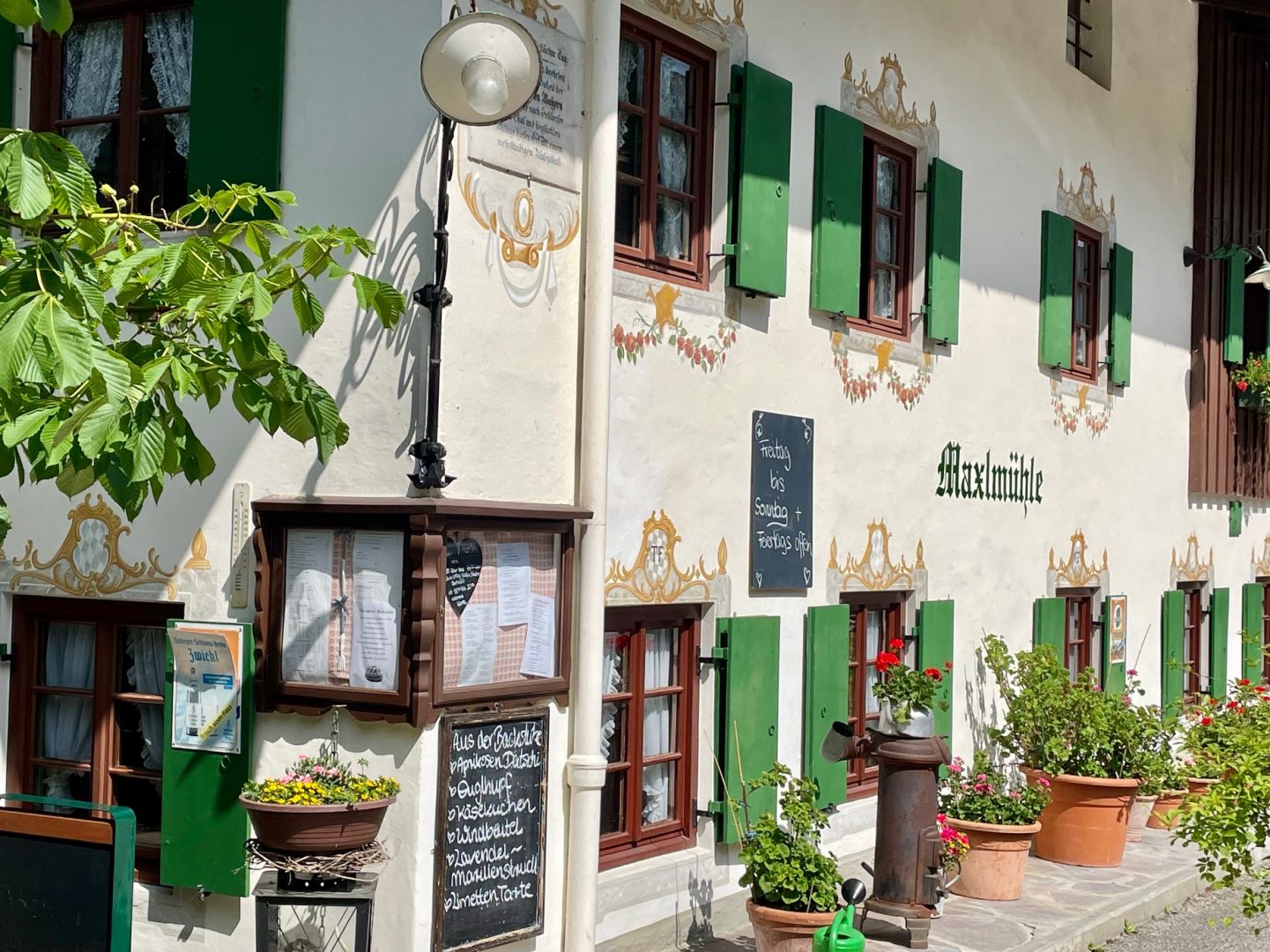 Dann ging’s weiter bis zur nächsten und letzten Rast in der Maxlmühle, besser gesagt draußen im Garten, wo ein einziger riesiger Baum gestützt von pergolaartigen Pfosten schön integriert, Schatten bot.