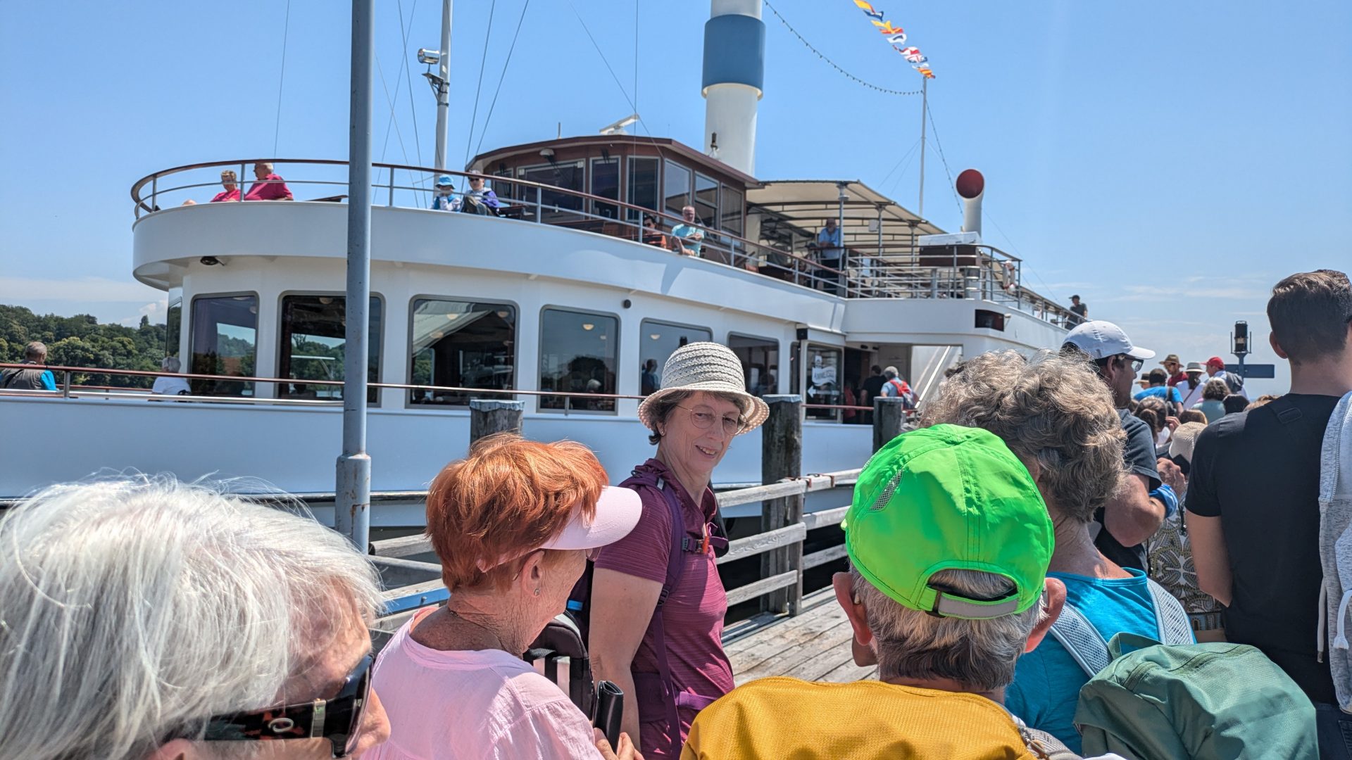 Unser Schiff fuhr dann von Stegen über Utting, Schondorf und Holzhausen nach Herrsching. Wir alle genossen den herrlichen Sonnenschein und den angenehmen Wind auf Deck. Gut gelaunt erlebten wir das Aus- und Einsteigeverfahren der Gäste an den Anlegestellen. Kaffee und Kuchen und kühle Getränke taten besonders gut bei der schönen Schifffahrt.