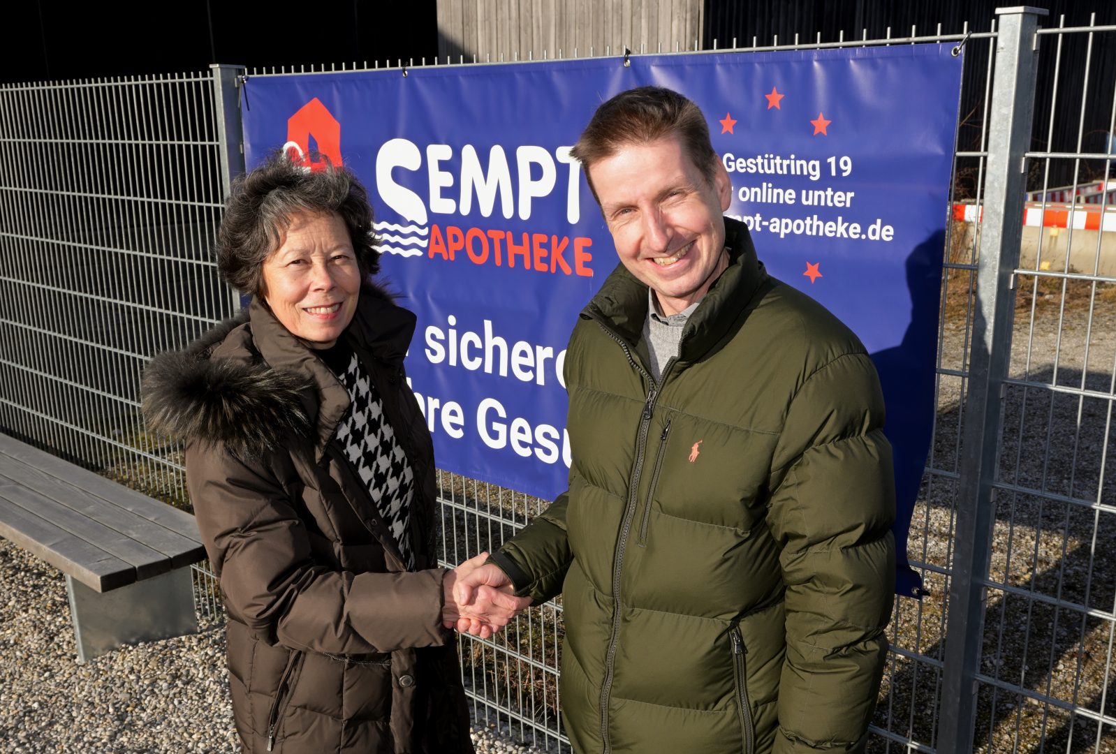 Vorstandsmitglied Constanze Klotz dankt dem Inhaber der Apotheke, Benedikt Friedl, vor dem neuen Transparent