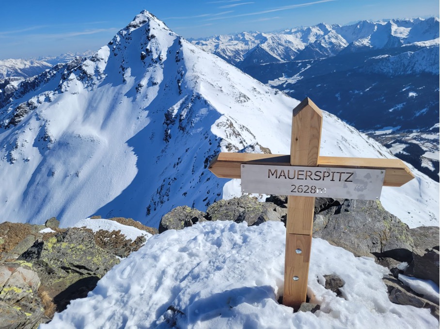 Nach entrichteter Parkgebühr, ging es dann endlich los mit unserer „Eingehtour“ zur Maurerspitze, mit knapp 1400 hm. Motiviert ging es zunächst über einen Waldweg, dann durch die, von einer massiven Lawine eindrucksvoll zerpflügten, Waldschneise hochhinauf. Nachdem wir den Ziehweg hinter uns gelassen hatten, öffnete sich eine beeindruckende Landschaft. Die Maurerspitze reihte sich in eine Kette schneebehangener Gipfel ein. Mit dem Blick zum Tagesziel ging es mal in Spitzkehren, mal gemütlich in der Ebene hin bis zum letzten Anstieg vor dem Gipfelglück. Hier schnallten wir uns zur Sicherheit lieber doch die Harscheisen an, nachdem wir unser Versuchskaninchen Michi ohne hochsteigen sehen haben. Nachdem wir uns den 40° Hang hochgekämpft hatten, war es nur noch ein kurzer Fußmarsch bis zum Gipfelkreuz. Hinter einem Grat, der in diesem Jahr auch ohne Steigeisen begehbar war, erwartete uns das Kreuz der Mauer!spitze mit einer traumhaften Rundumsicht über die Gipfel Südtirols.