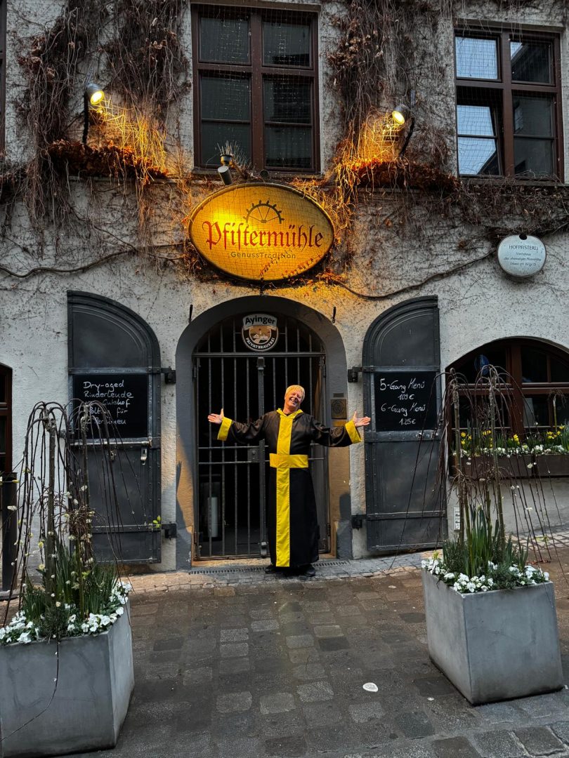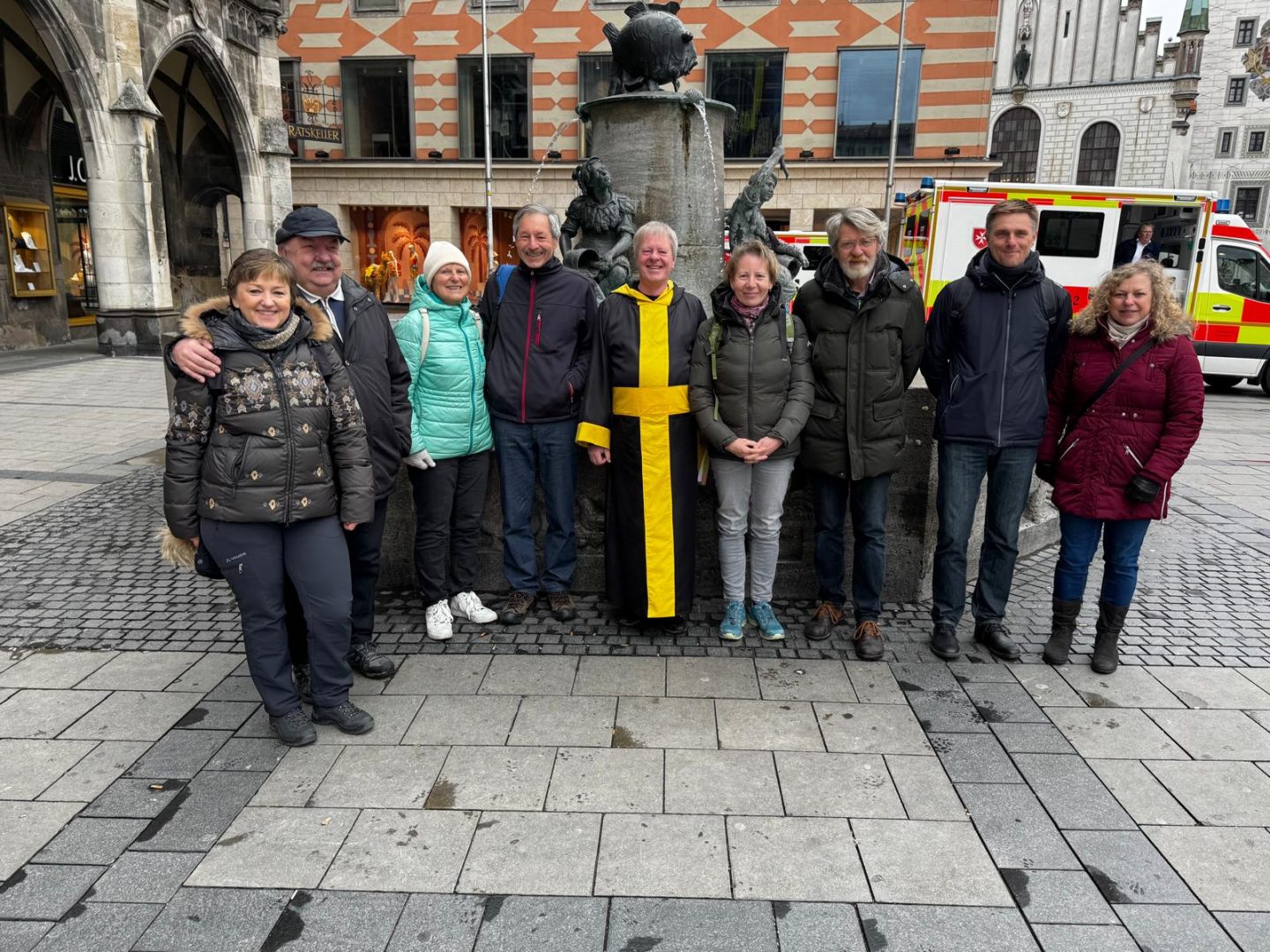 16.03.2025 Bei kaltem und leicht windigem Wetter trafen alle 7 Teilnehmer aus der Umgebung pünktlich um 8:45 am S-Bahnhof in Altenerding ein, begrüßt vom sichtlich erfreuten Tourenleiter Markus. Dieser hatte sich eine passende Kluft zugelegt: eine schwarze, seidenartige Kutte mit gelben aufgenähten Balken. Er schaute damit so aus wie der Vater vom Münchner Kindl. Das war auch öfters der Anlass, dass er von diversen Touristen- und innen in der Münchener Innenstadt für ein Foto gebeten wurde, was ihm auch offensichtlich Spaß machte.