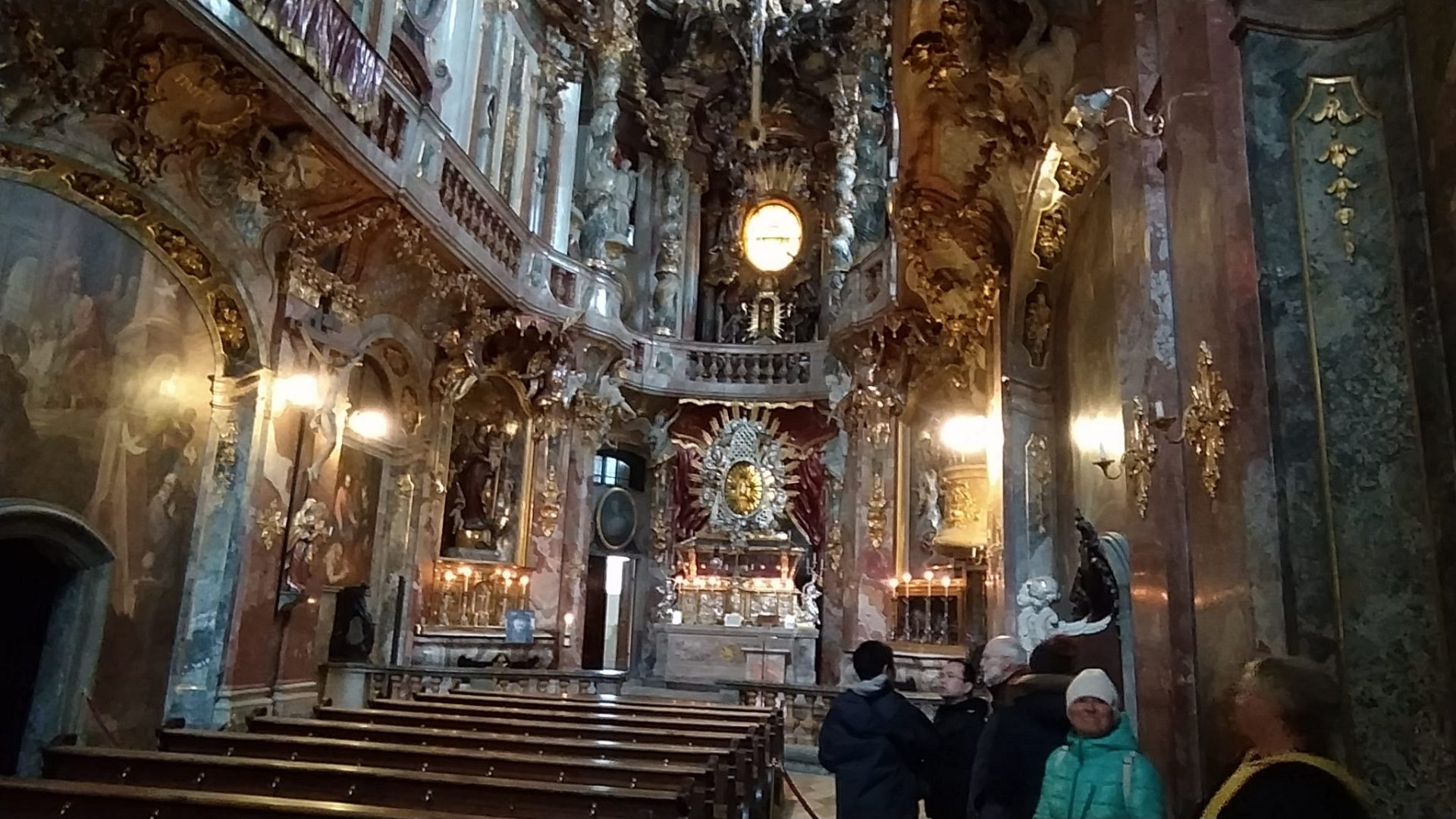 Dann ging’s los Richtung Dienerstraße zum Dallmayr und zum Alten Hof, vorbei an dem Gebäude, in der die Münze zuhause ist, immer mit kurzem Halt für teils amüsante Erklärungen. Markus hatte sich ein umfangreiches Wissen angeeignet erzählte zu allen angesteuerten Gebäuden und Plätzen interessante, größtenteils unbekannte Geschichten. Weiter gings über die Maximilian-Straße zum Odeonsplatz. Hier besuchten wir kurz die prächtige Theatinerkirche; nur kurz, weil gerade eine Messe stattfand. Dann machten wir uns auf den Weg Richtung Sendlinger Tor. Der nächste Stopp galt dem Meisterwerk spätbarocker Baukunst, der privat erbauten Asam-Kirche.