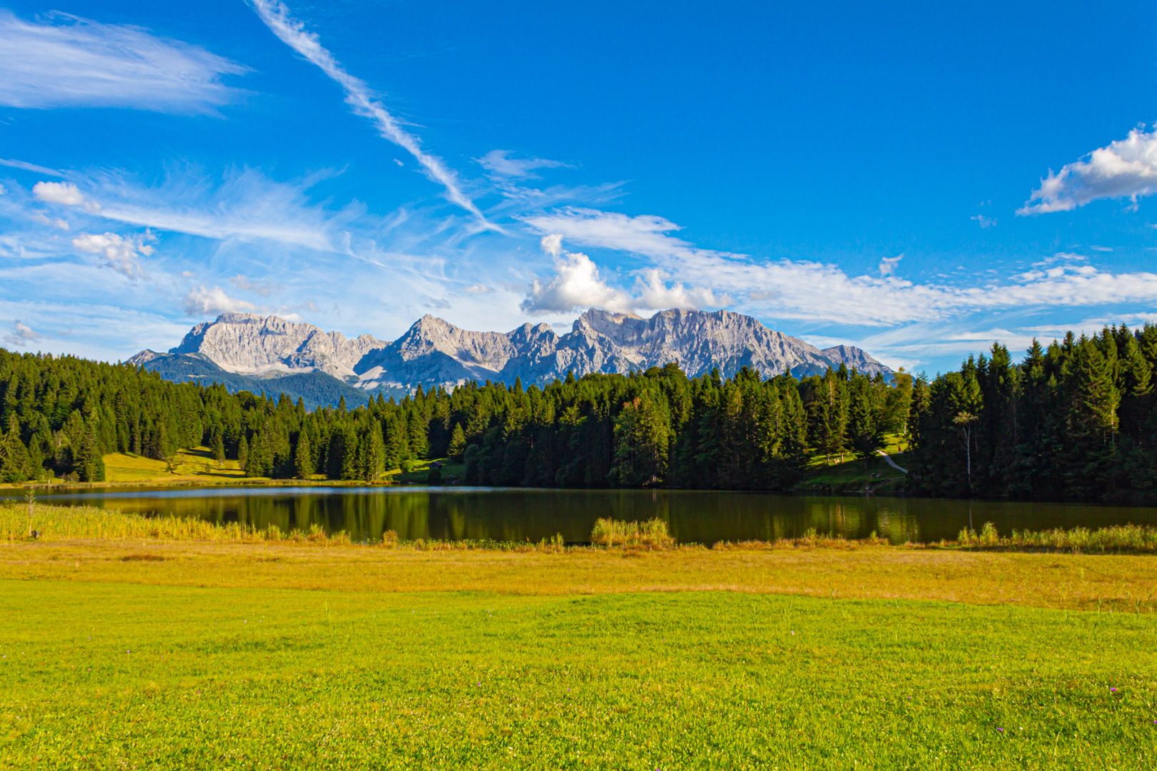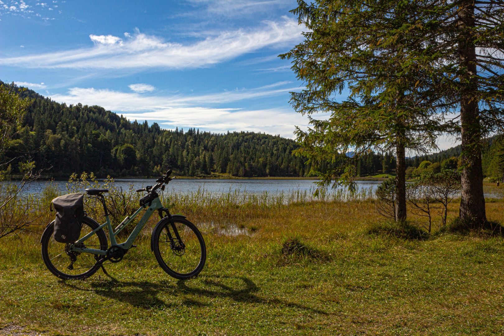 Nach einer letzten Steigung, die man evtl. auch umfahren könnte, rollen wir wieder bergab Richtung Garmisch-Partenkirchen. Ein kurzer Abstecher zum Gerold- (Wagenbruch-)see ermöglicht uns einen Bilderbuchblick auf das Karwendel. Dann geht in Garmisch-Partenkirchen eine wunderschöne Tour (95 km mit 1150 Hm + 400 Hm per Bahn) bei hervorragendem Radlwetter zu Ende. 2 Stunden später schüttet es wie aus Kübeln – Glück gehabt!