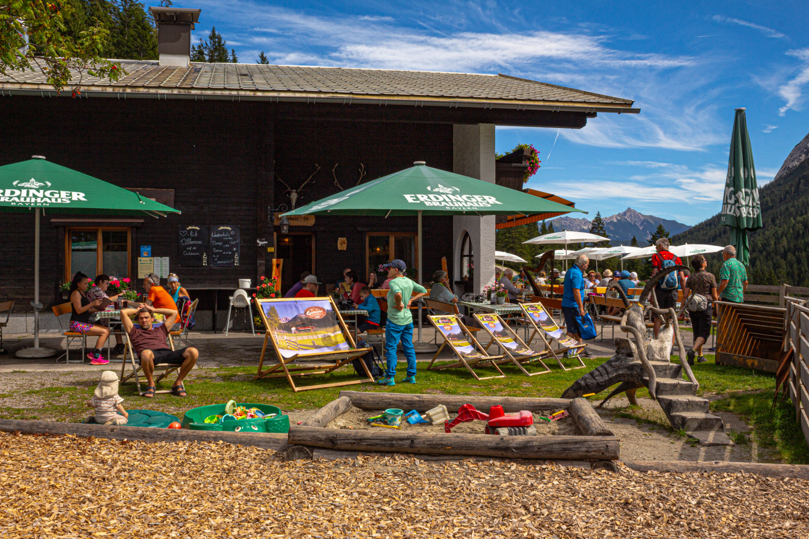 Life Musik (Harfe) und gutes Essen – was will man mehr? Entlang der Leutascher Ache geht`s weiter bergab bis kurz vor Mittenwald. Ein kurzer Blick über den Ort, ein letzter Schluck aus der Trinkflasche und schon führt uns der Weg mal wieder bergauf an Lauter- und Ferchensee